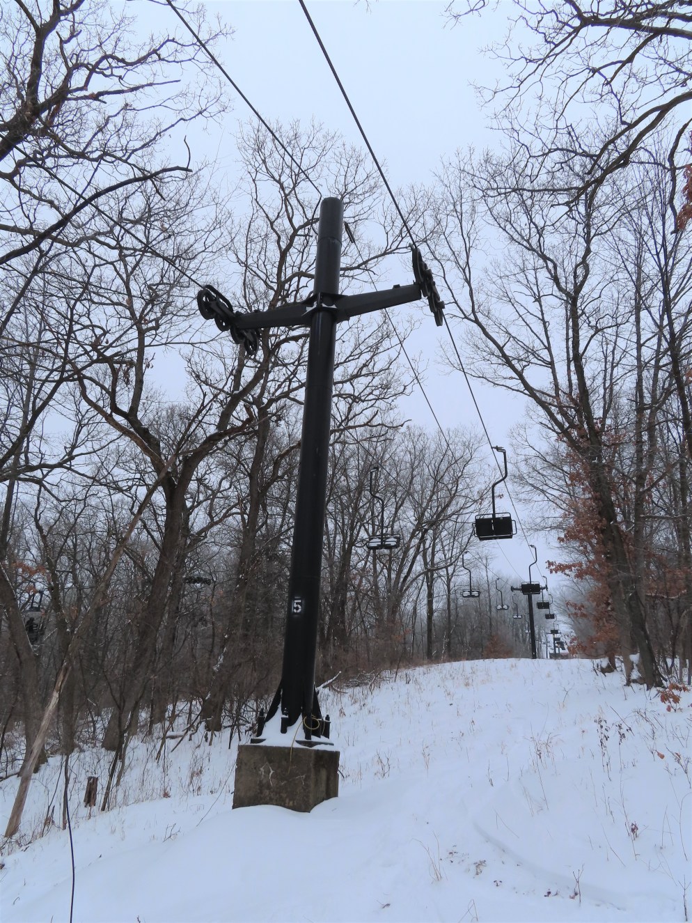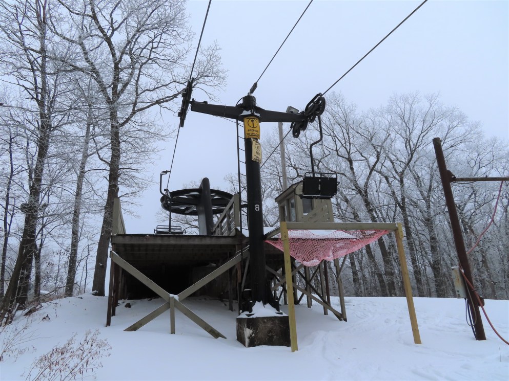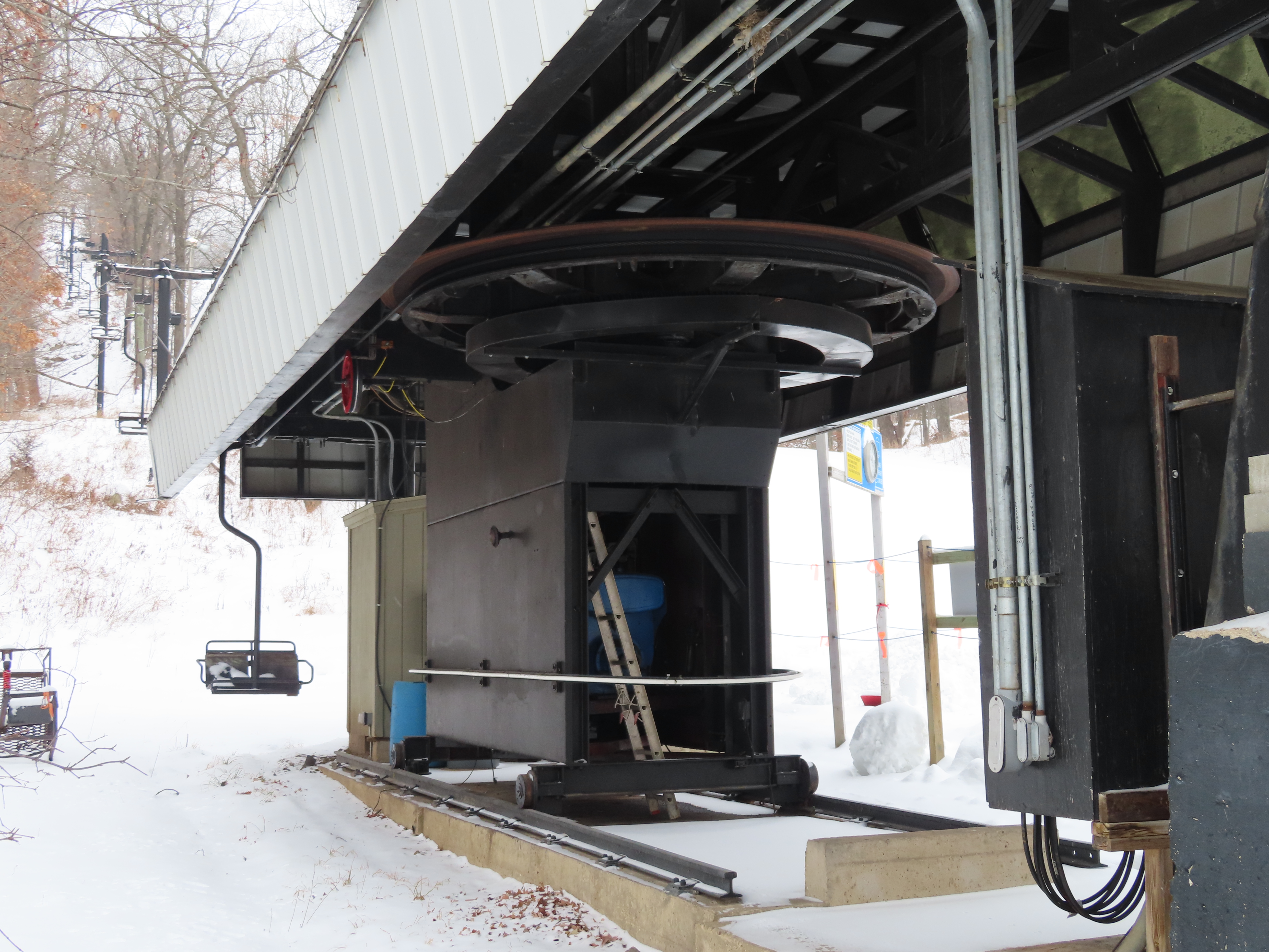 This is the last remaining Hall center pole double at Devil’s Head.View down the wooded lift line.Tower 8 is right next to the top terminal.Upper part of the line.View down the lift.Tower 5 of 8.The bottom terminal, counterweight and tower 1 are all enclosed by a wooden cover.Loading area.Drive bullwheel.Counterweight.