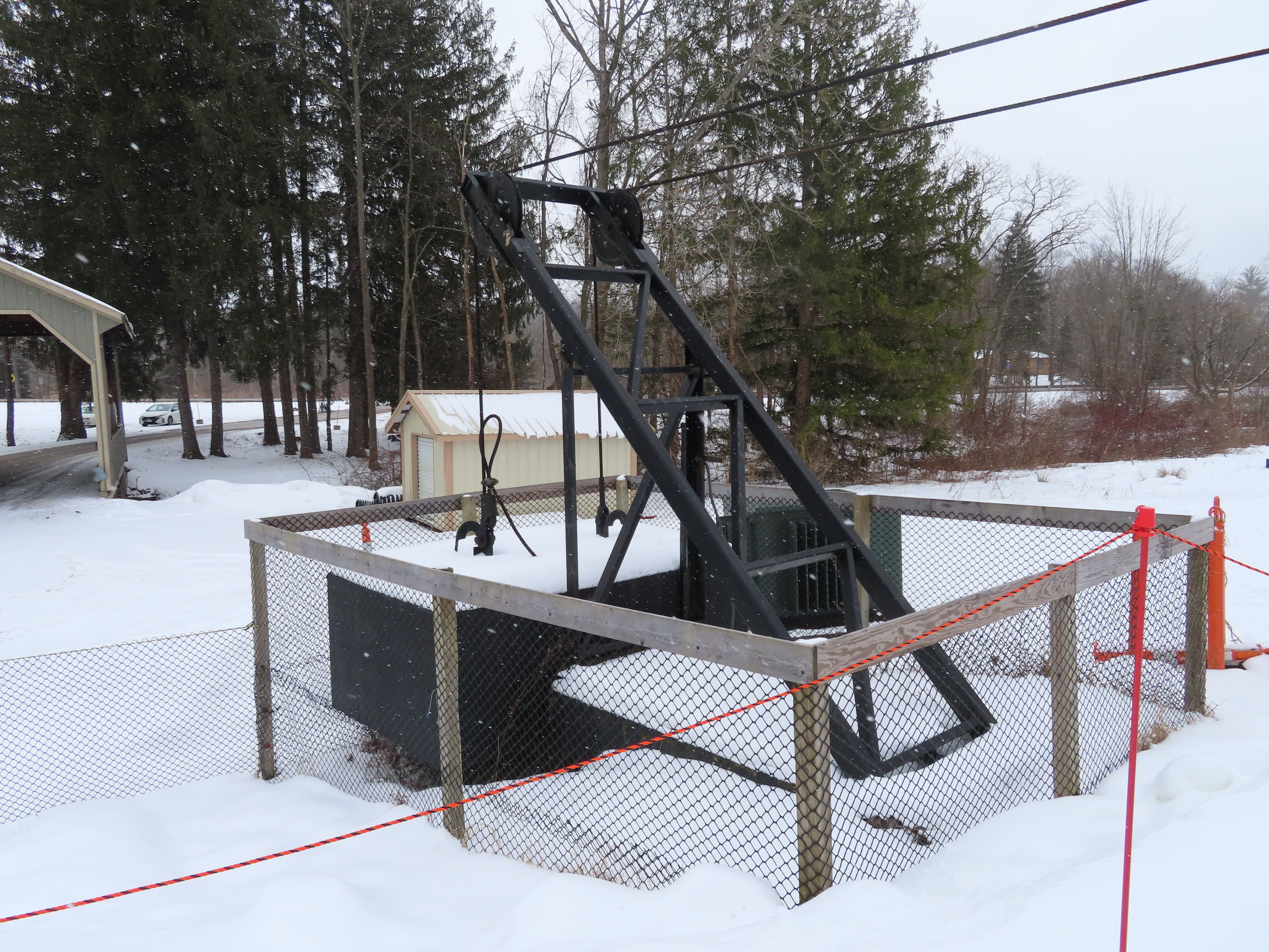 This lift was built as a quad but currently operated as a triple by Vail Resorts.Counterweight next to the ski resort’s main entrance.Loading area.Tower 1 is a portal.Fixed top bullwheel.View down the line.Looking up the line.