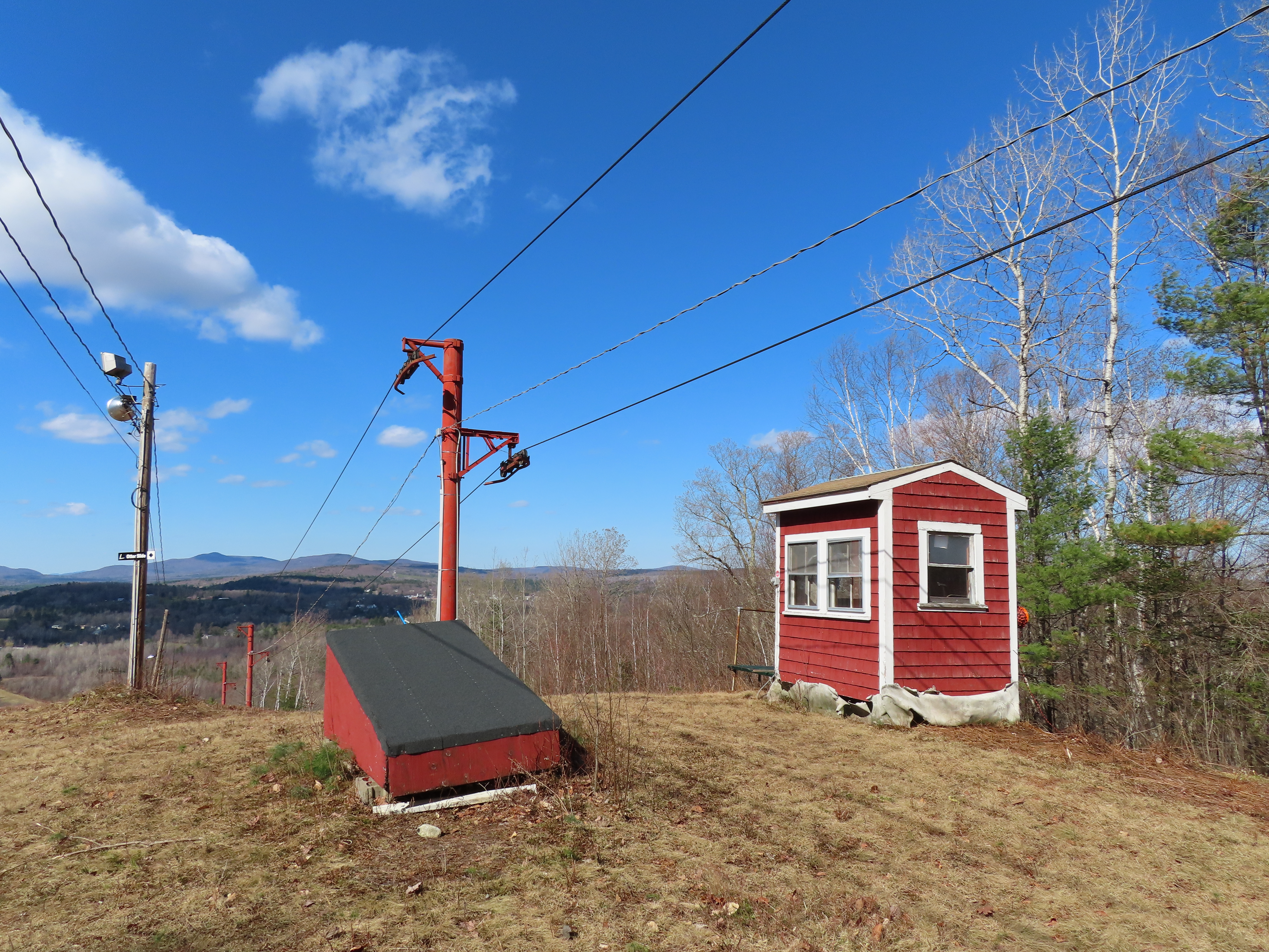 This T-Bar is one of two at Titcomb Mountain.The top terminal has a counterweight for tensioning.Unloading area at tower 8.View down the lift line with Ts removed for the summer.T8 and top operator shack.Middle part of the lift line.A unique portal tower. This entire lift may be custom built.Lower station building.Lift line.Lift overview.