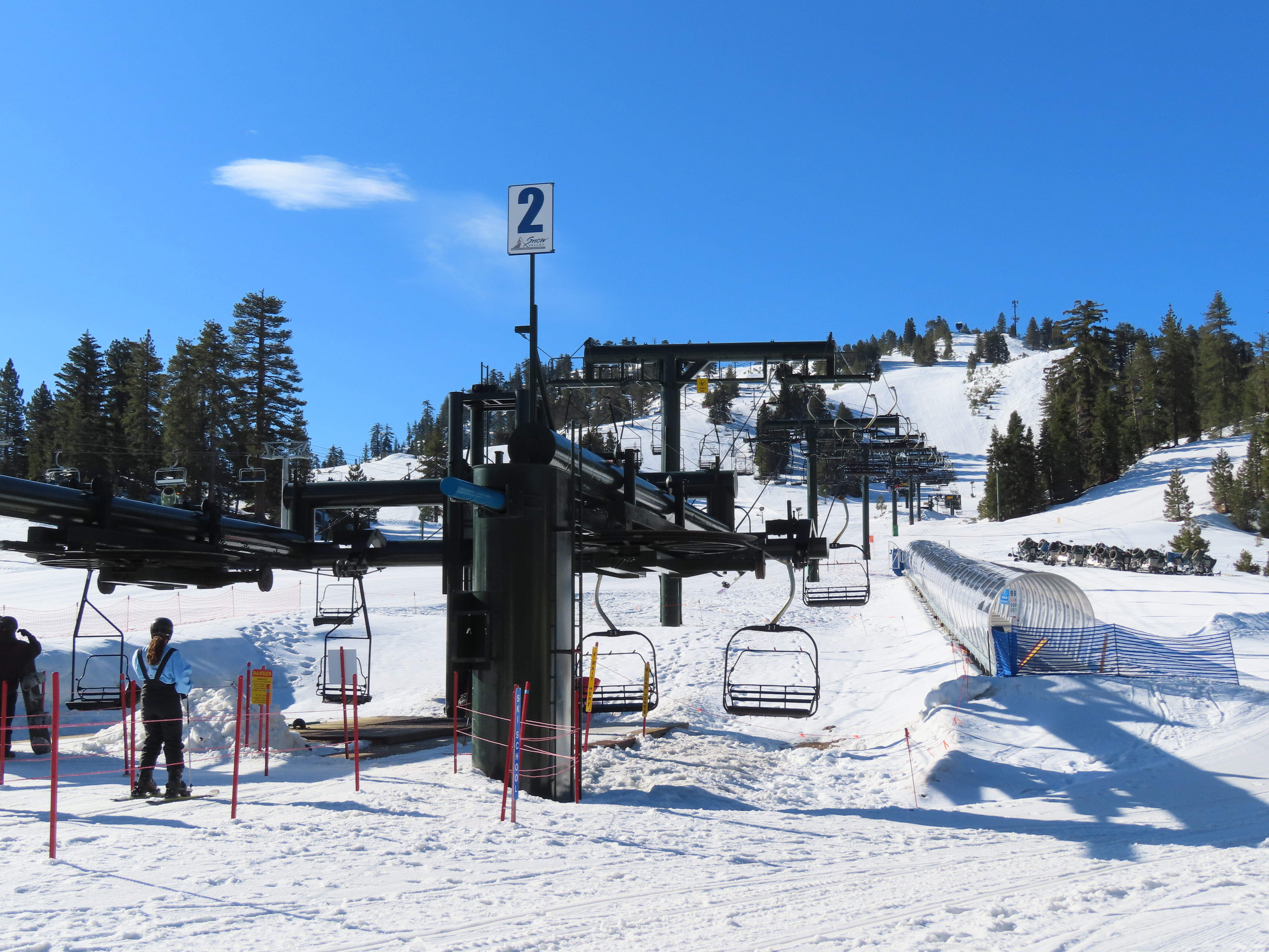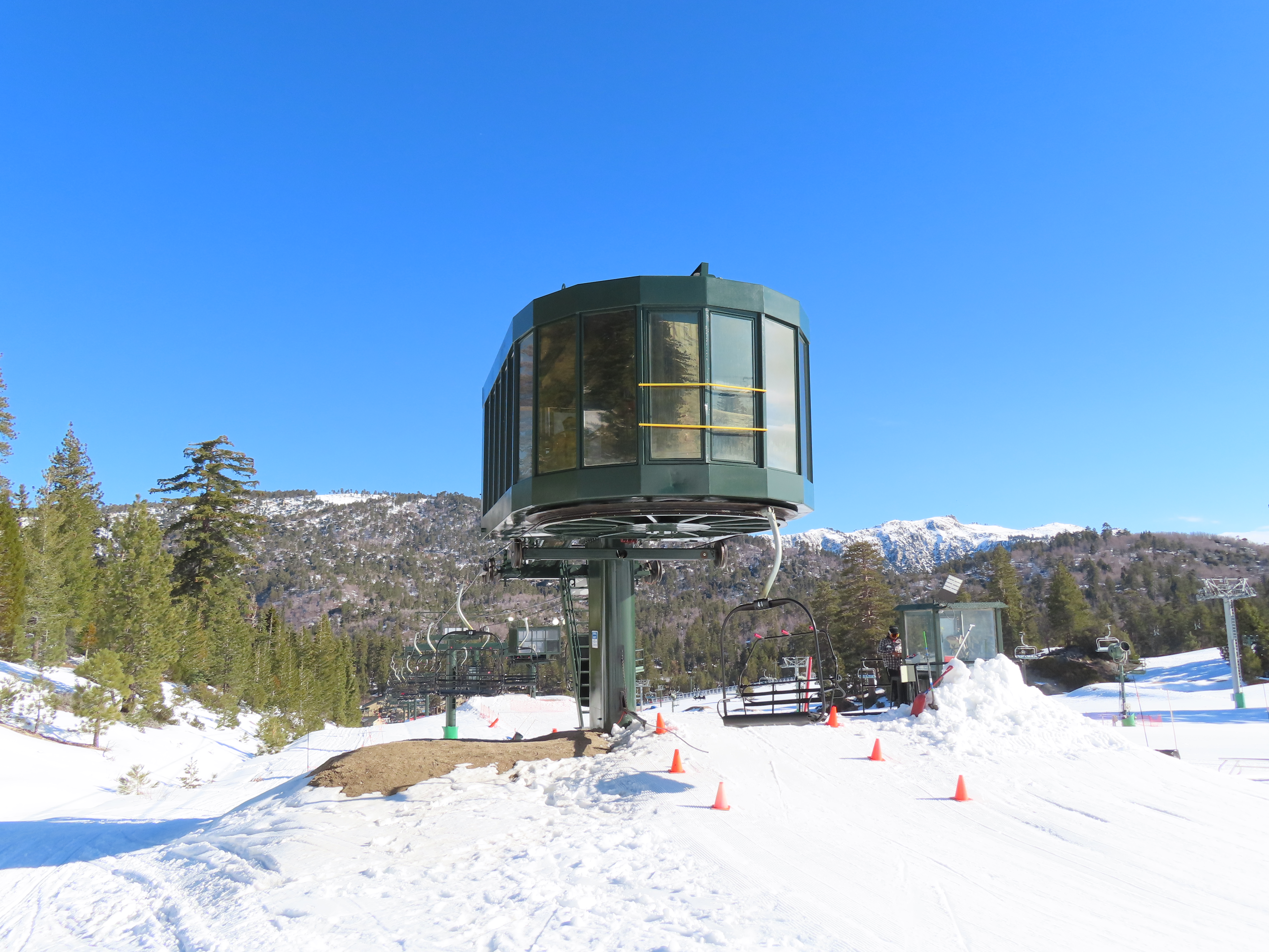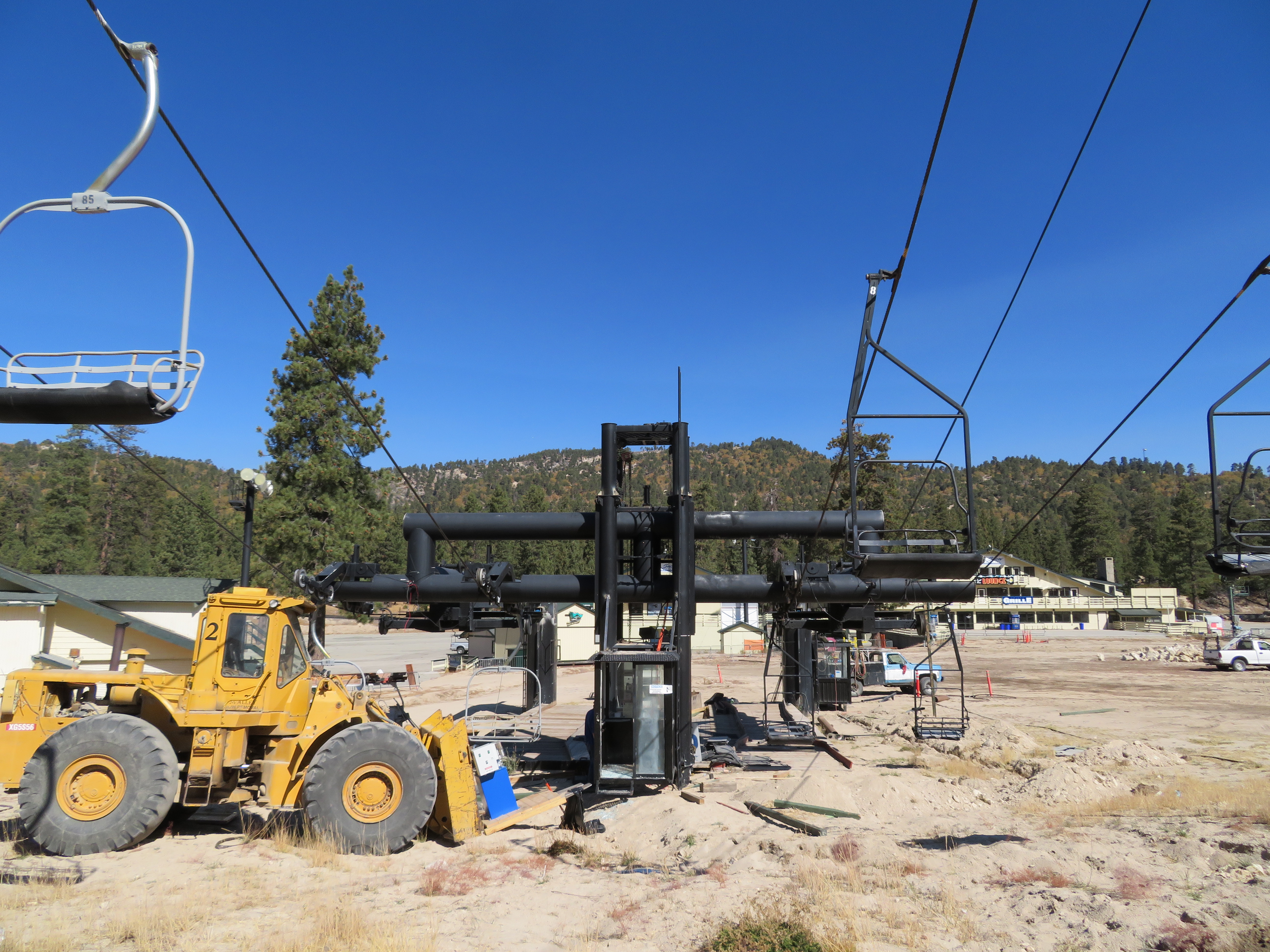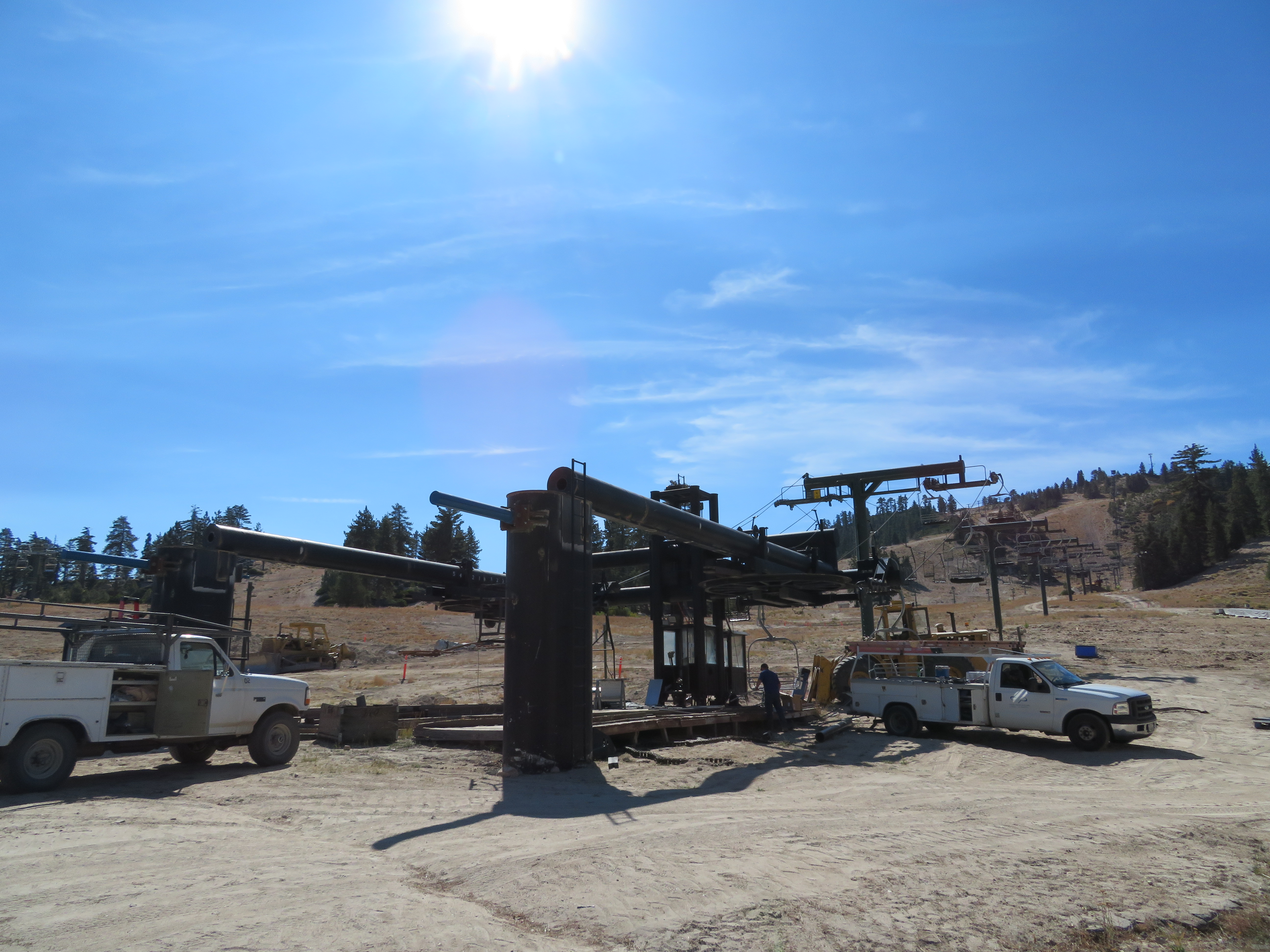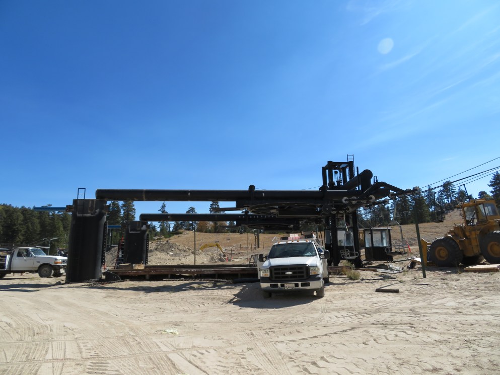 This lift shares its first six towers with Lift 6.Unique double height adjustable bottom station.Lift line from below.Side view of the bottom station, in the process of getting hydraulic tensioning.Lift overview.Top drive station.Unload ramp.Lift line above where 6 ends.Top few towers.Top station and ‘Y’ style tower.In 2023, new owner Alterra shortened the 2 side of this lift to a beginner lift.The lift was shortened from 17 towers to only 8.Tower 7 acting only on the heavy side.The final tower on the shortened alignment.This drive terminal came from another lift.New drive.Look in the distance and you can still see the old top station.Updated configuration.