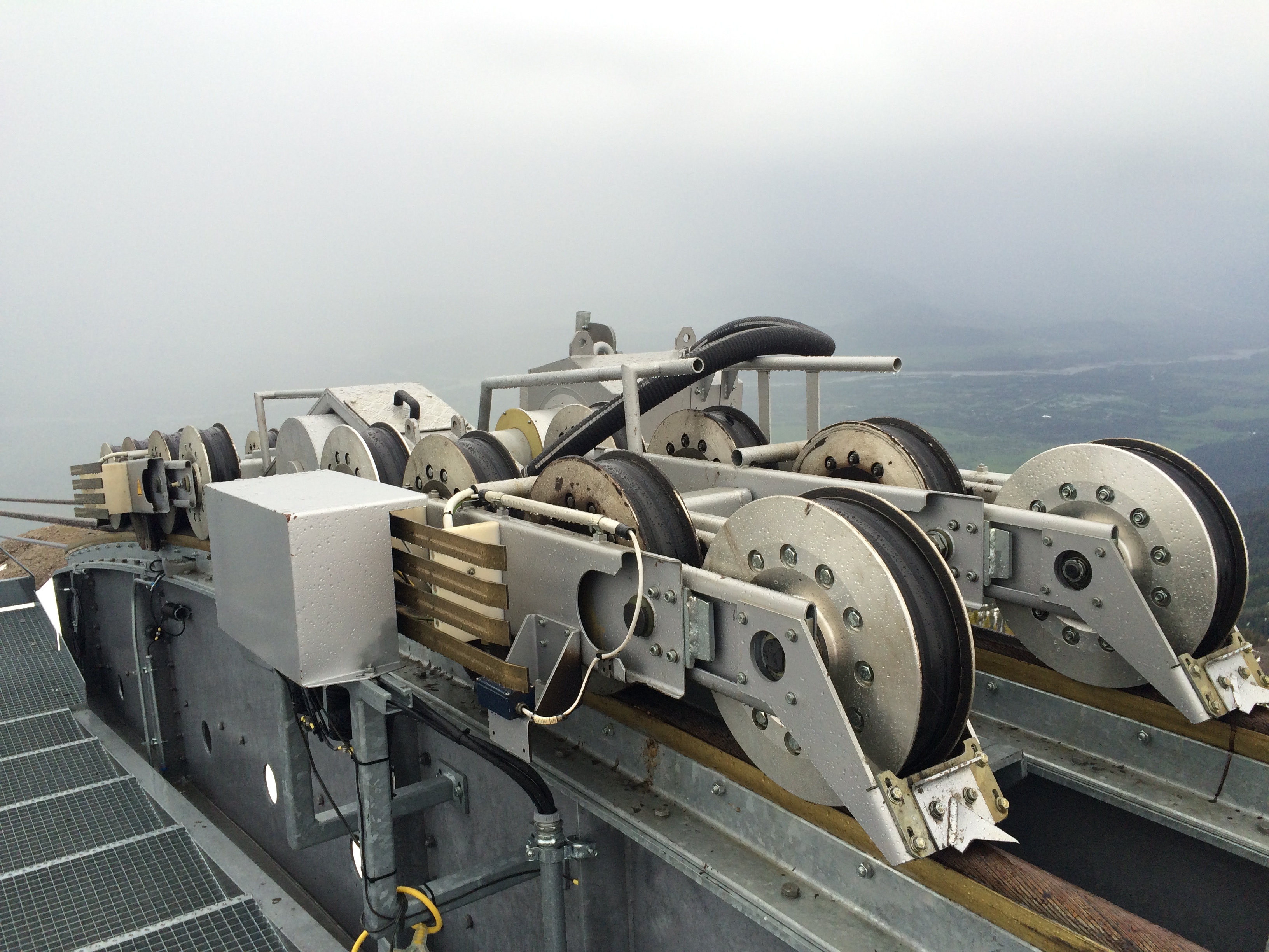 The two service brakes and an emergency brake are each tested daily. Unlike the original, the new tram has no track rope brakes on the carriages. The haul rope is tensioned by a 220,000 pound counterweight in a pit underneath the top terminal. Twenty-six slack carriers keep the track ropes and haul rope together over the longer spans from towers 1 through 4. Every 400-500 hours, cabins 1 and 2 are re-positioned on the haul rope by 10 meters so that the wear points change.