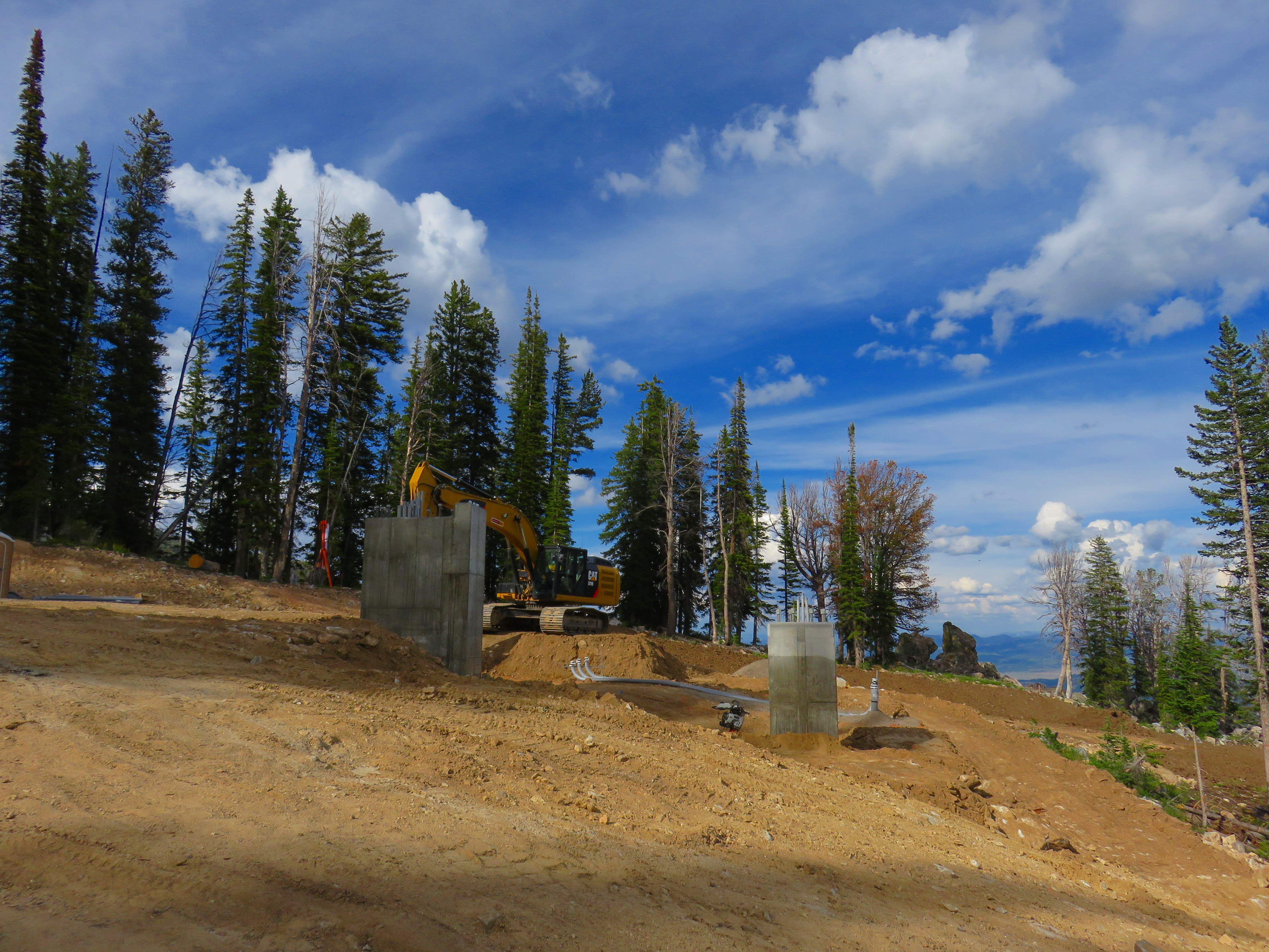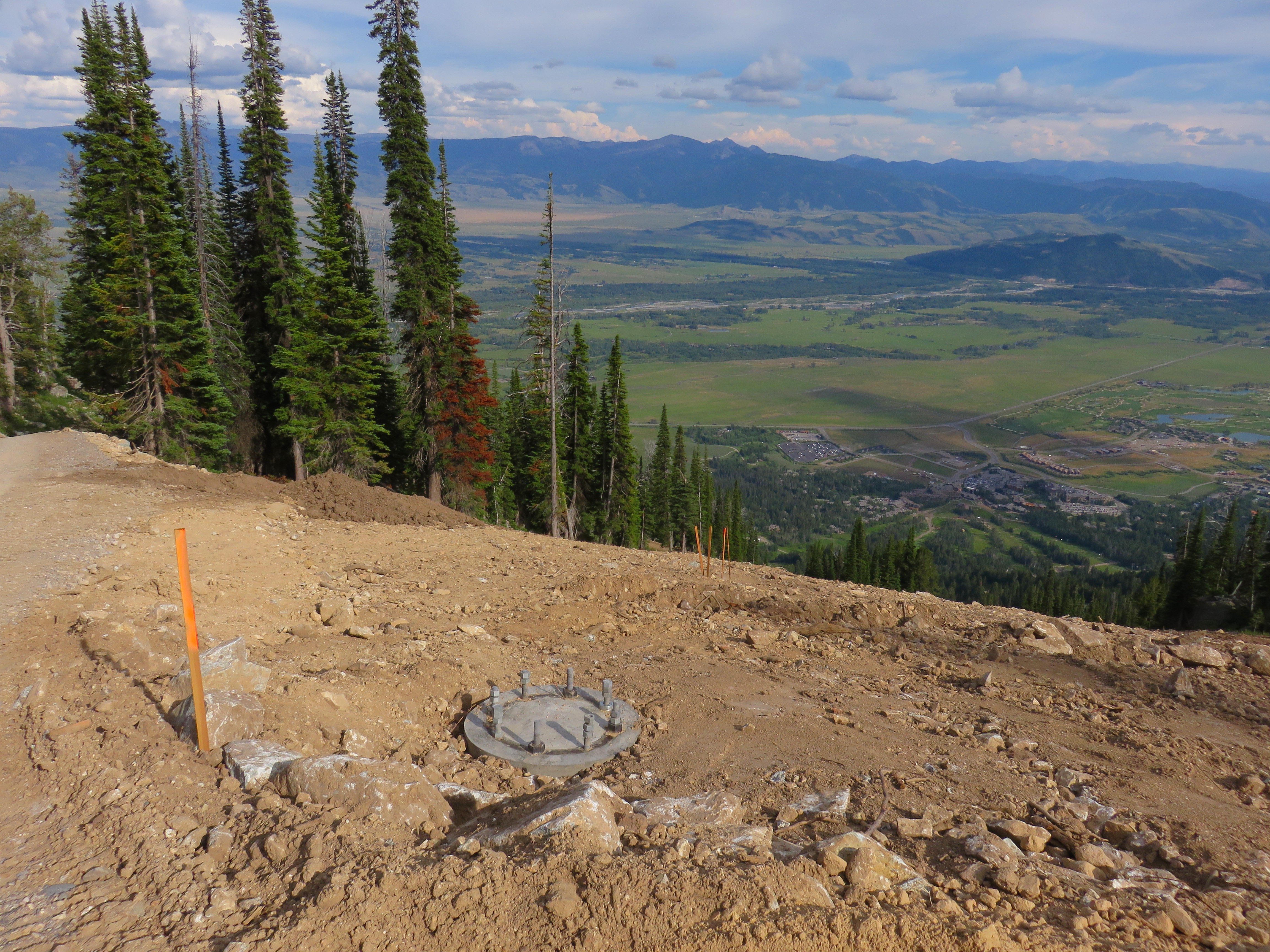 It’s mid-July and construction is ramping up on the north side of the Jackson Hole Mountain Resort. A K-Max helicopter from Timberline Helicopters was on-site Sunday to fly concrete for the towers that couldn’t be accessed by road. The rest of the tower footings were already finished and back filled. Concrete work is also complete at the top terminal and steel will be going up shortly. The bottom terminal is a few weeks behind. Down in the parking lot, towers are mostly assembled and terminal components will be headed up the hill soon.