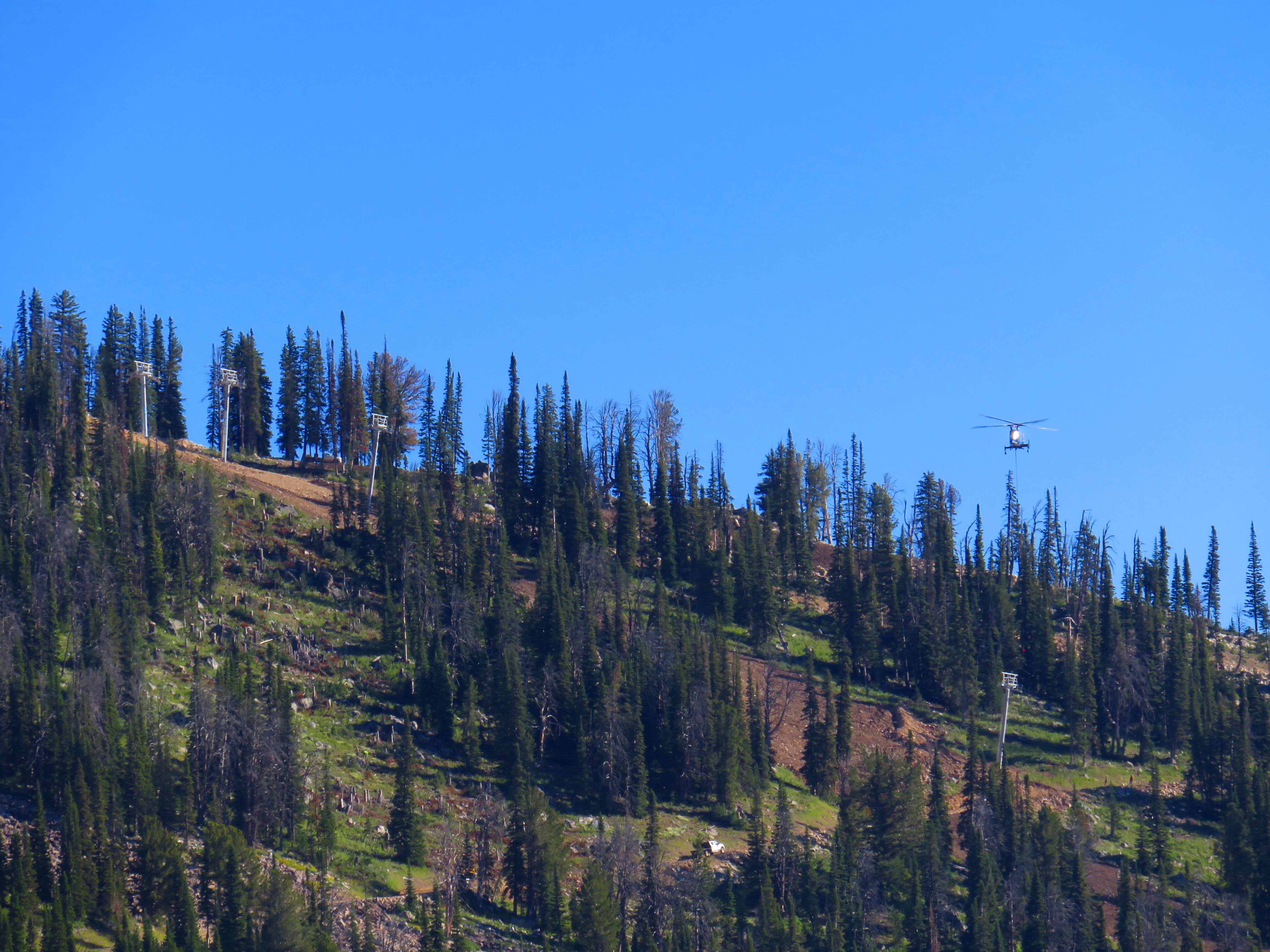 Last night I heard the unmistakable sound of a helicopter flying over my house. Around here it’s usually a search and rescue chopper but this time I looked out to see the double rotors of a Kaman K-Max. It’s the same helicopter that did the concrete footings for the Teton lift last week. Doppelmayr started flying towers early this morning and the crew worked their way down from the top, setting towers 15 through 5 before wind and snow shut them down around noon.