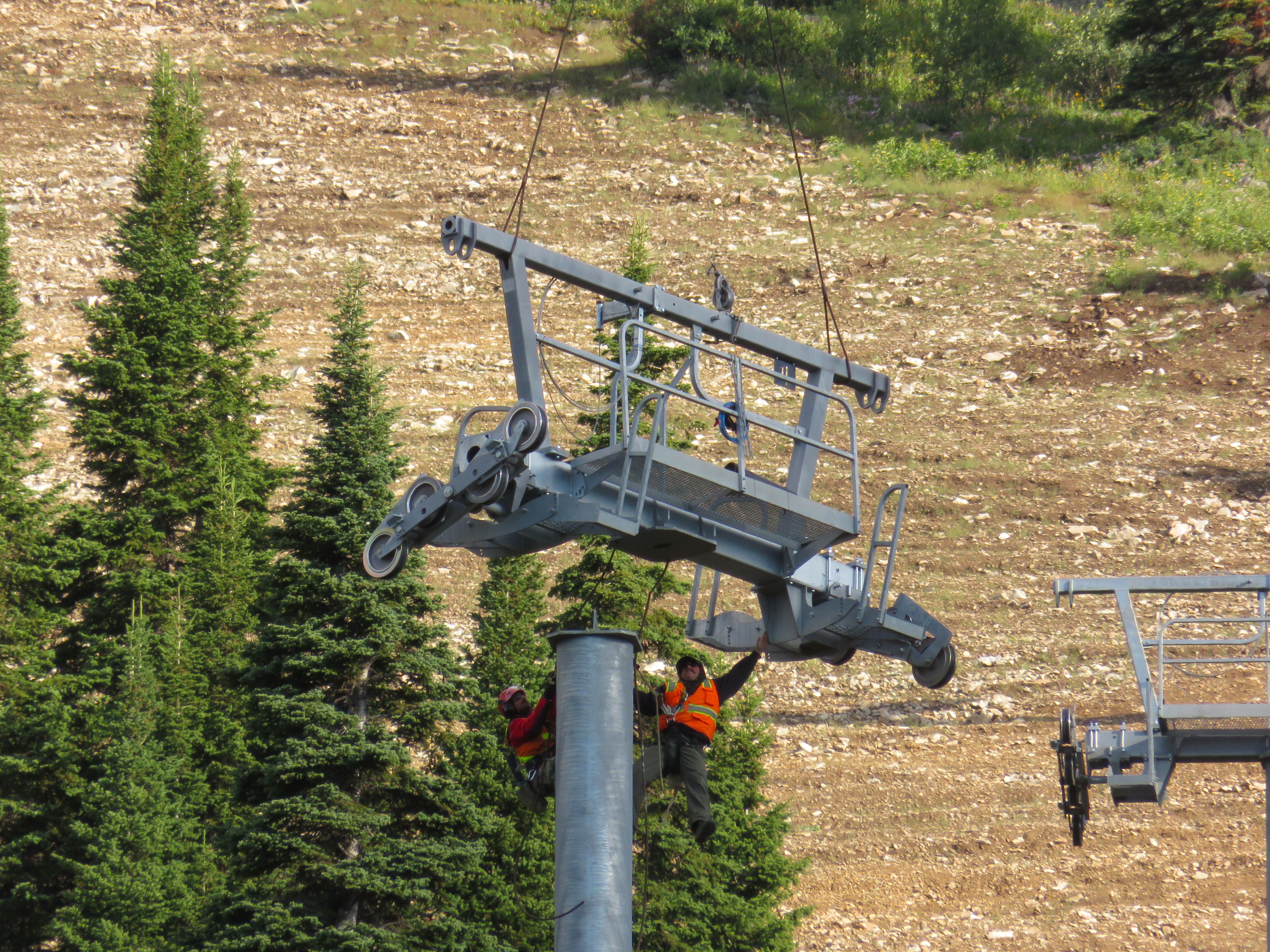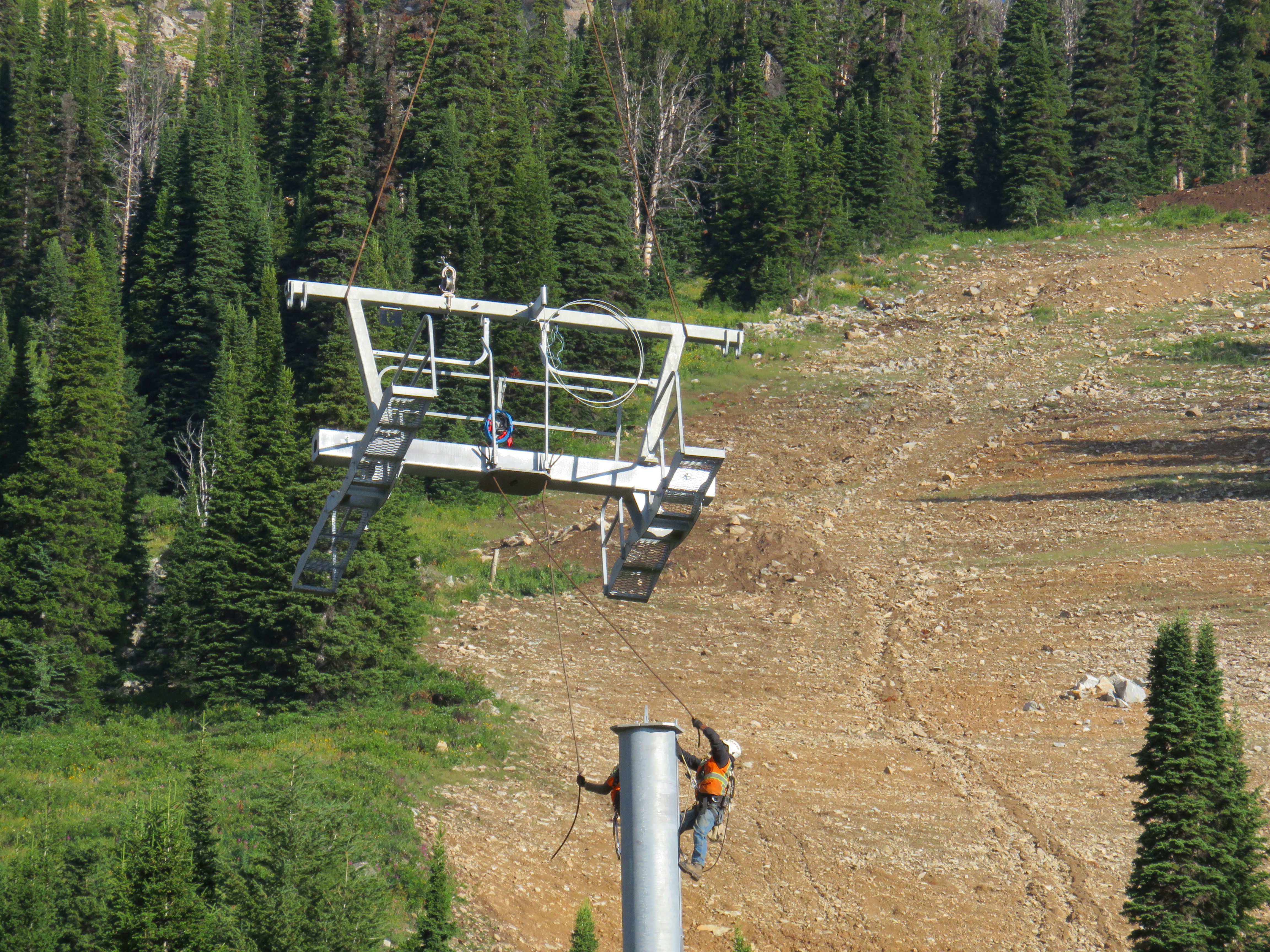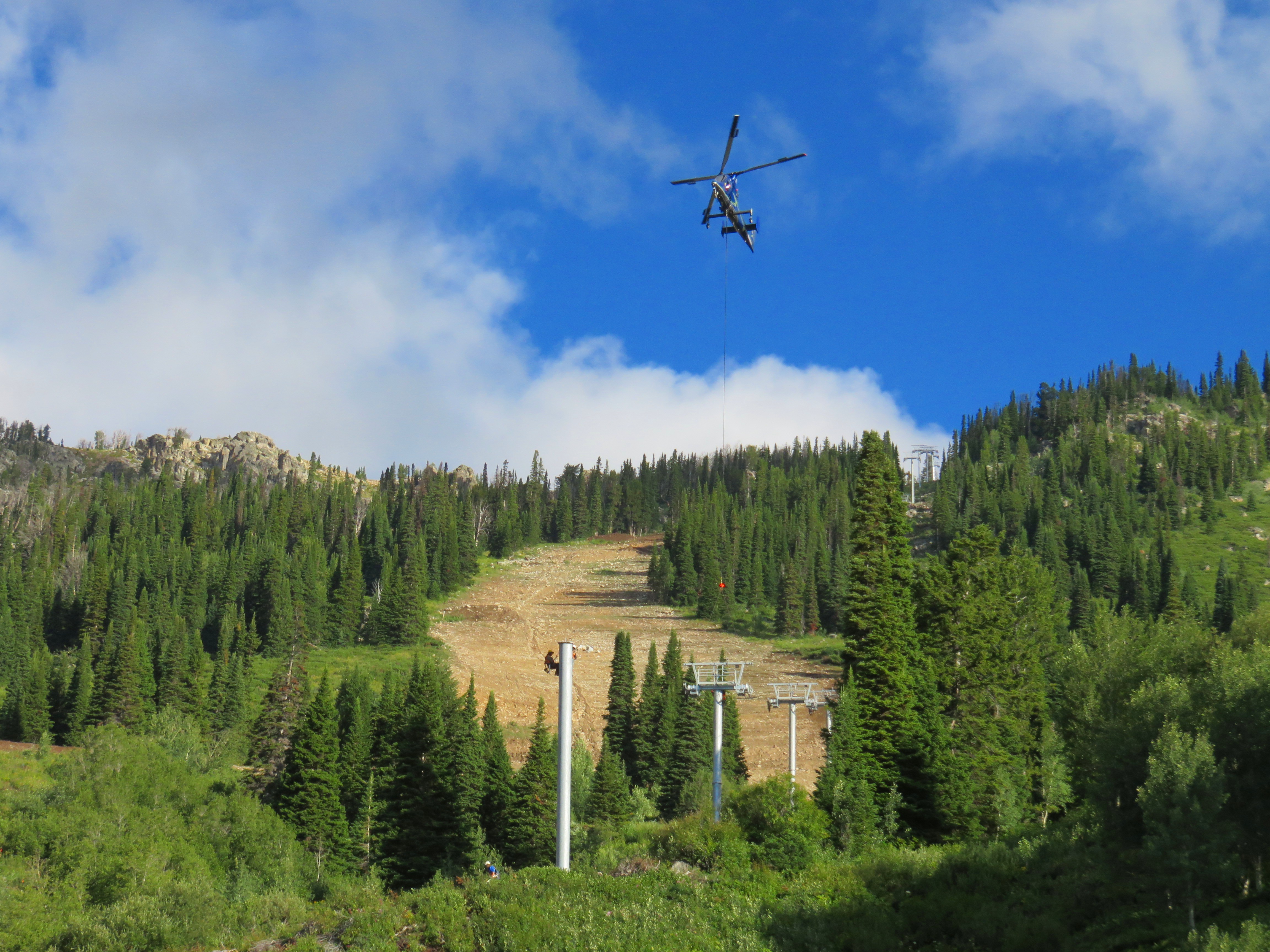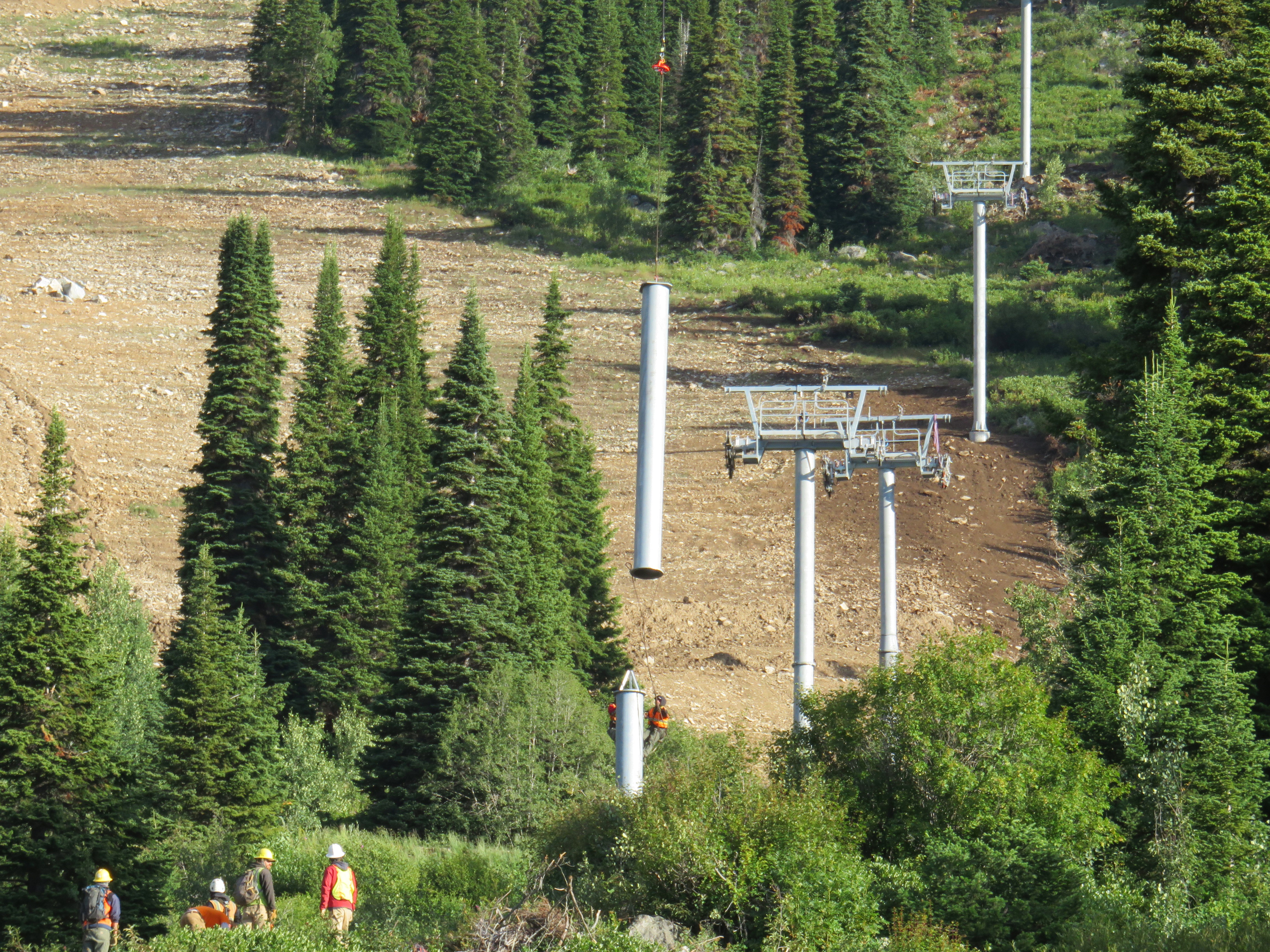 Tower fly day number two for Jackson Hole’s Teton lift went smoothly with crews setting the remaining six towers in less than two hours. Some of the top and bottom terminal parts were also flown up the hill while the helicopter was here. With road access at both terminals, I don’t expect to see any more heli work on this project. Lower Valley Energy is currently running power to the top drive terminal site from Casper and the first lift cabin arrived from Doppelmayr. Footings for the bottom terminal are about halfway done. See below for more pictures of today’s flying.
