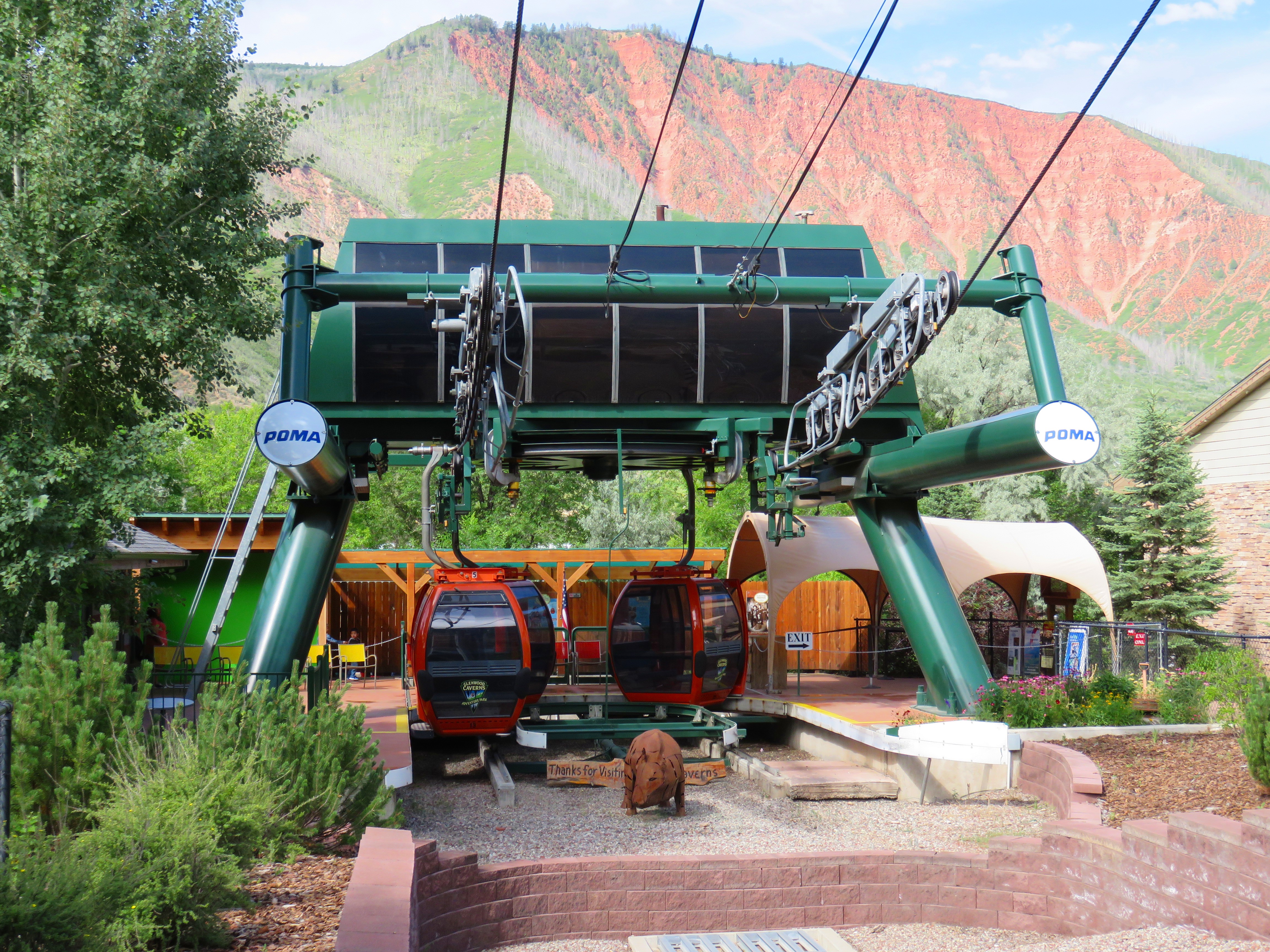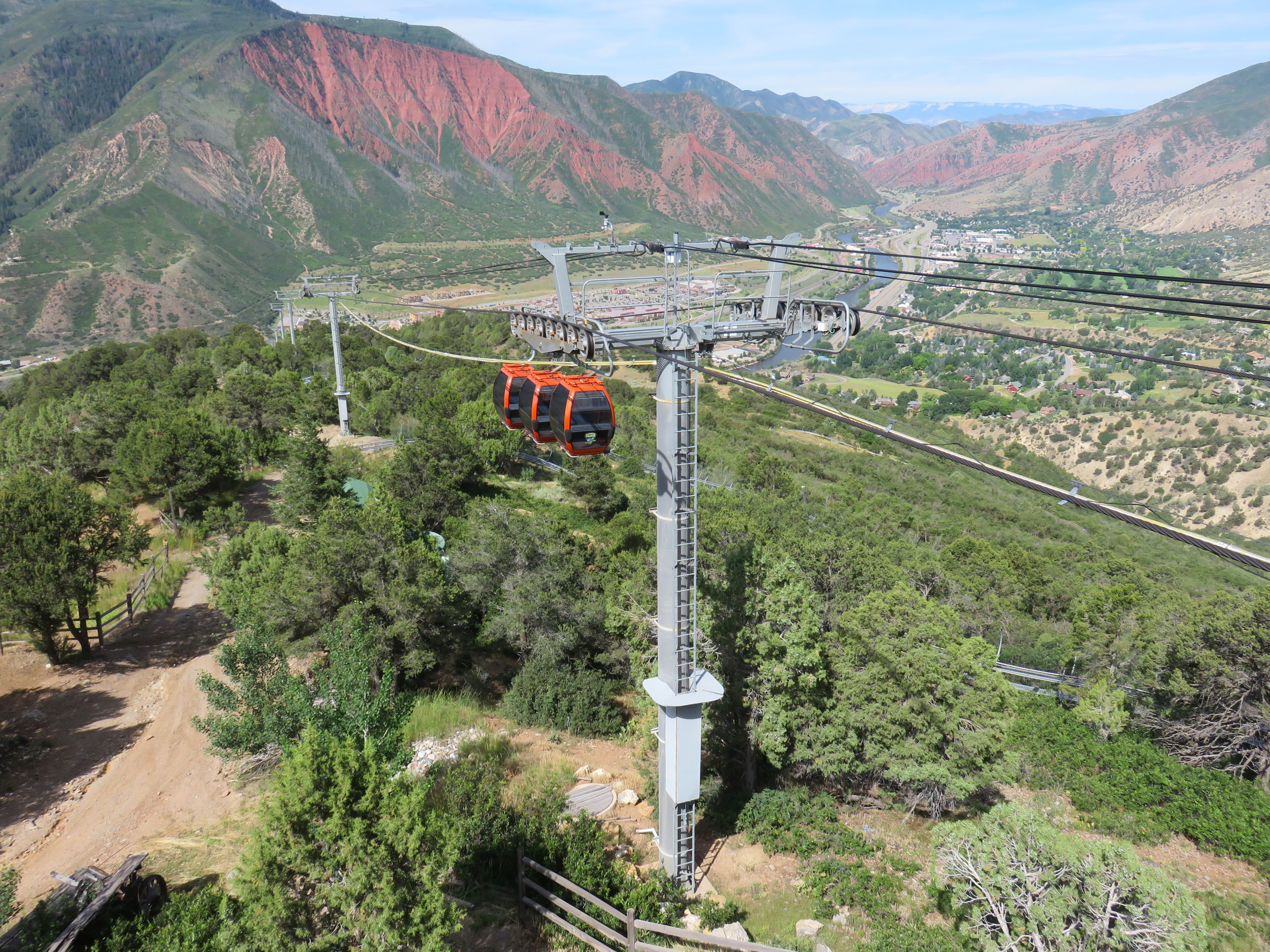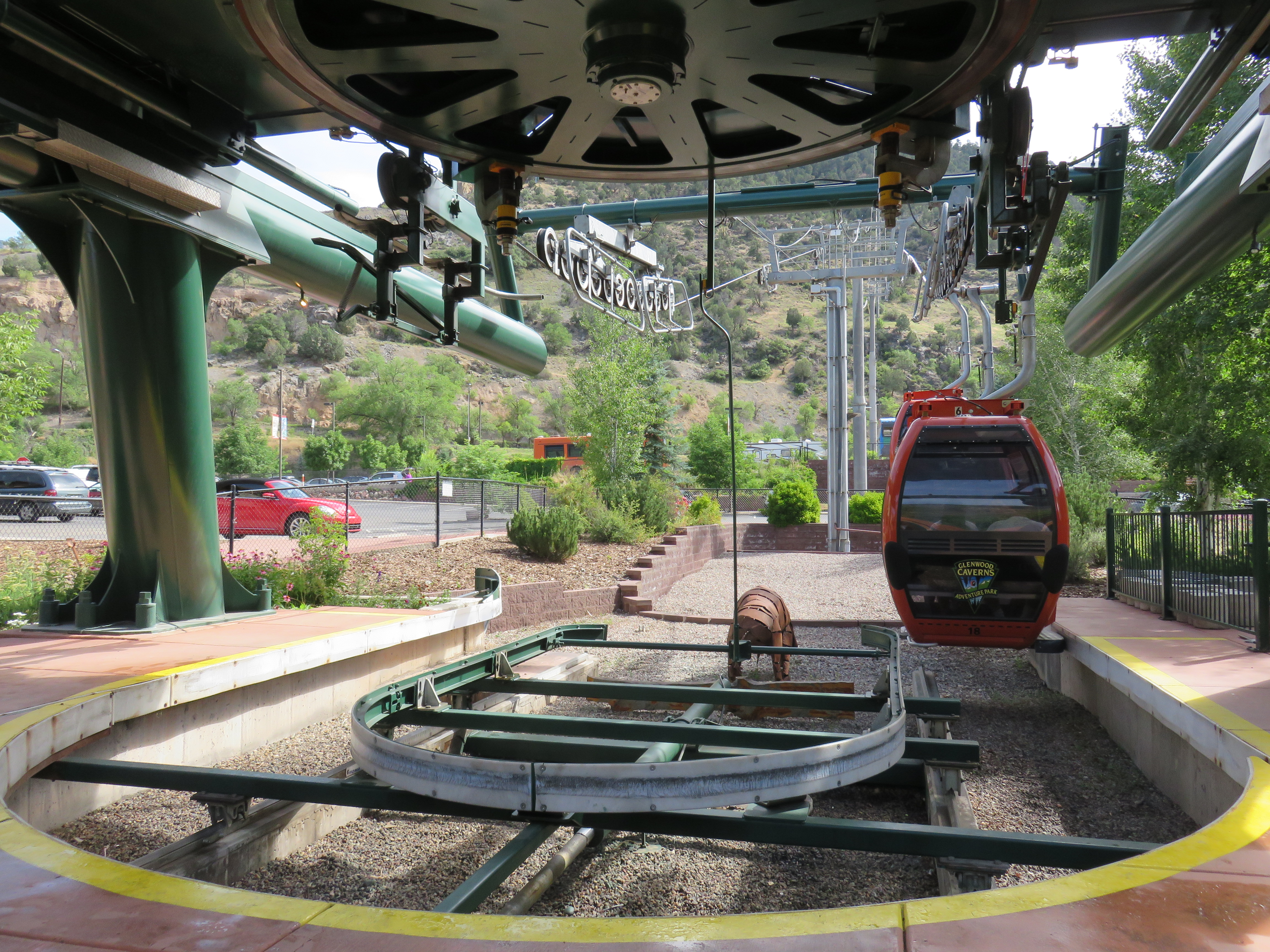 Three cabins nearing the summit of the Iron Mountain Tramway in Glenwood Springs, Colorado.
