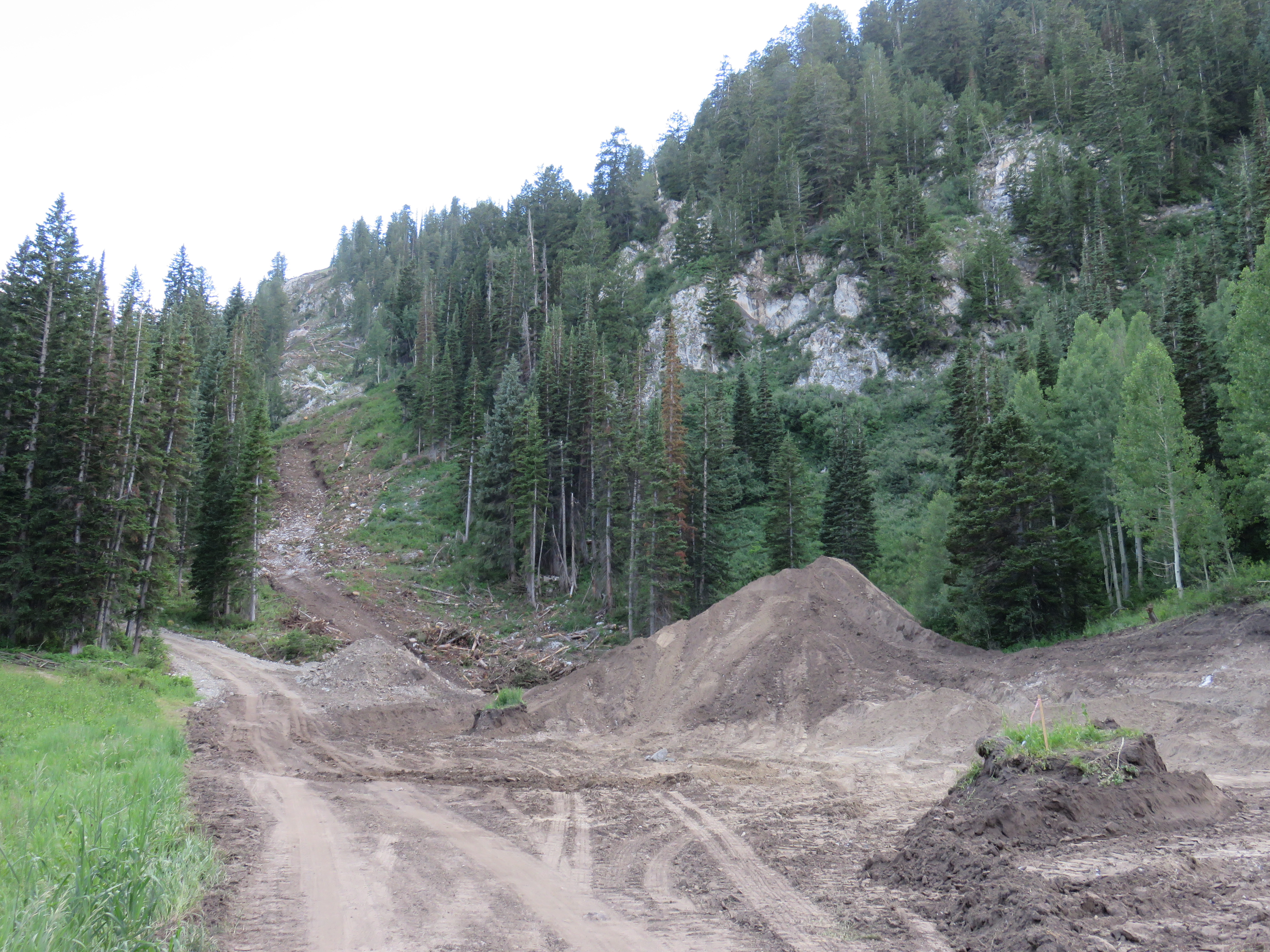The old lift is completely removed and stored in the Moonbeam parking lot. It looks like the Thiokol double will be used elsewhere (the last lift Solitude removed ended up at Canyons Resort.) Trees are gone from the new lift line and a lot of earth work has been done although nothing has been built yet. Highlander Ski Lift Services appears to be building the new quad. With 13 new lifts projects and counting, Doppelmayr is stretched pretty thin. I did not see any parts for the new lift but I am sure they will be arriving soon.