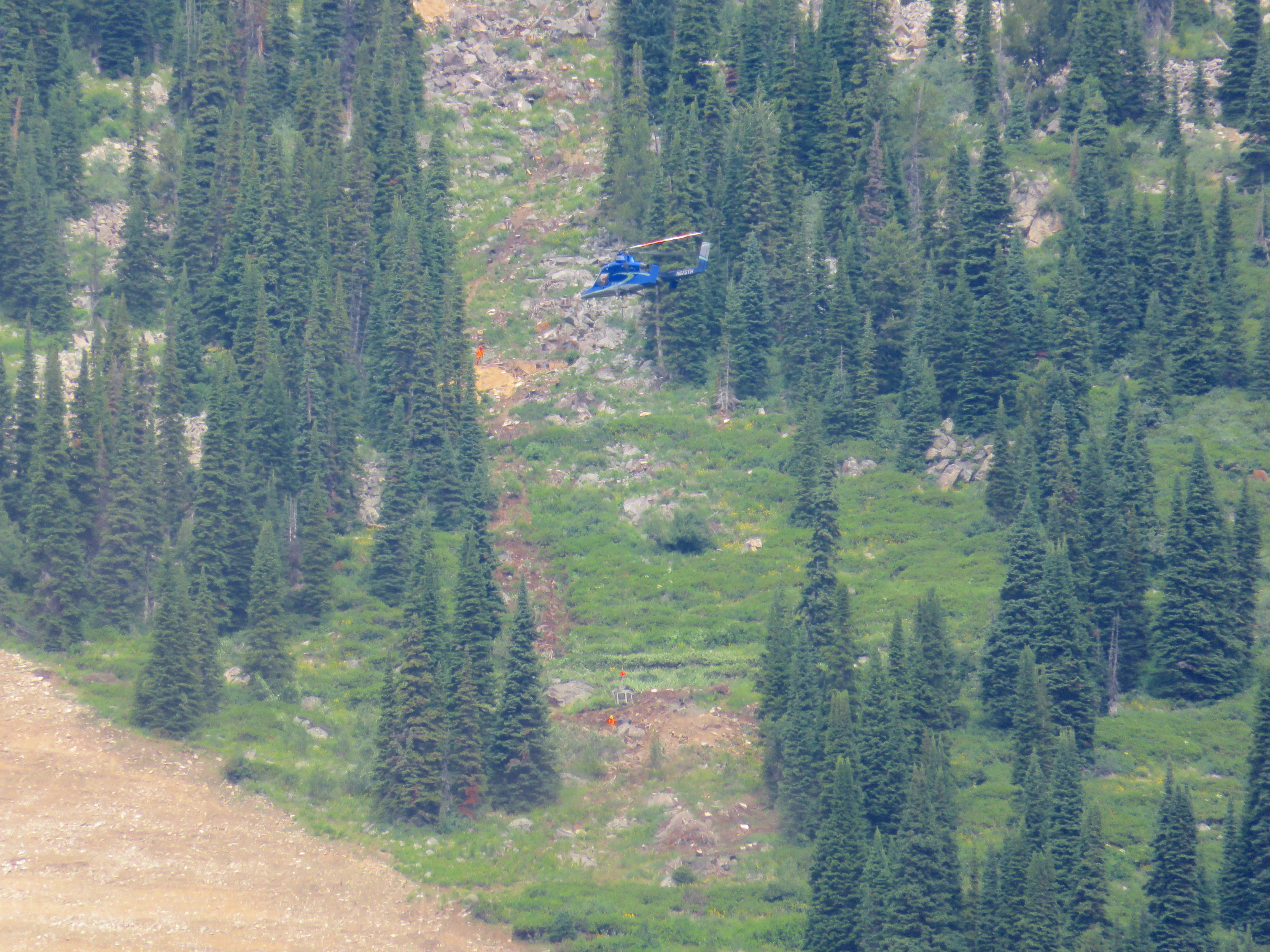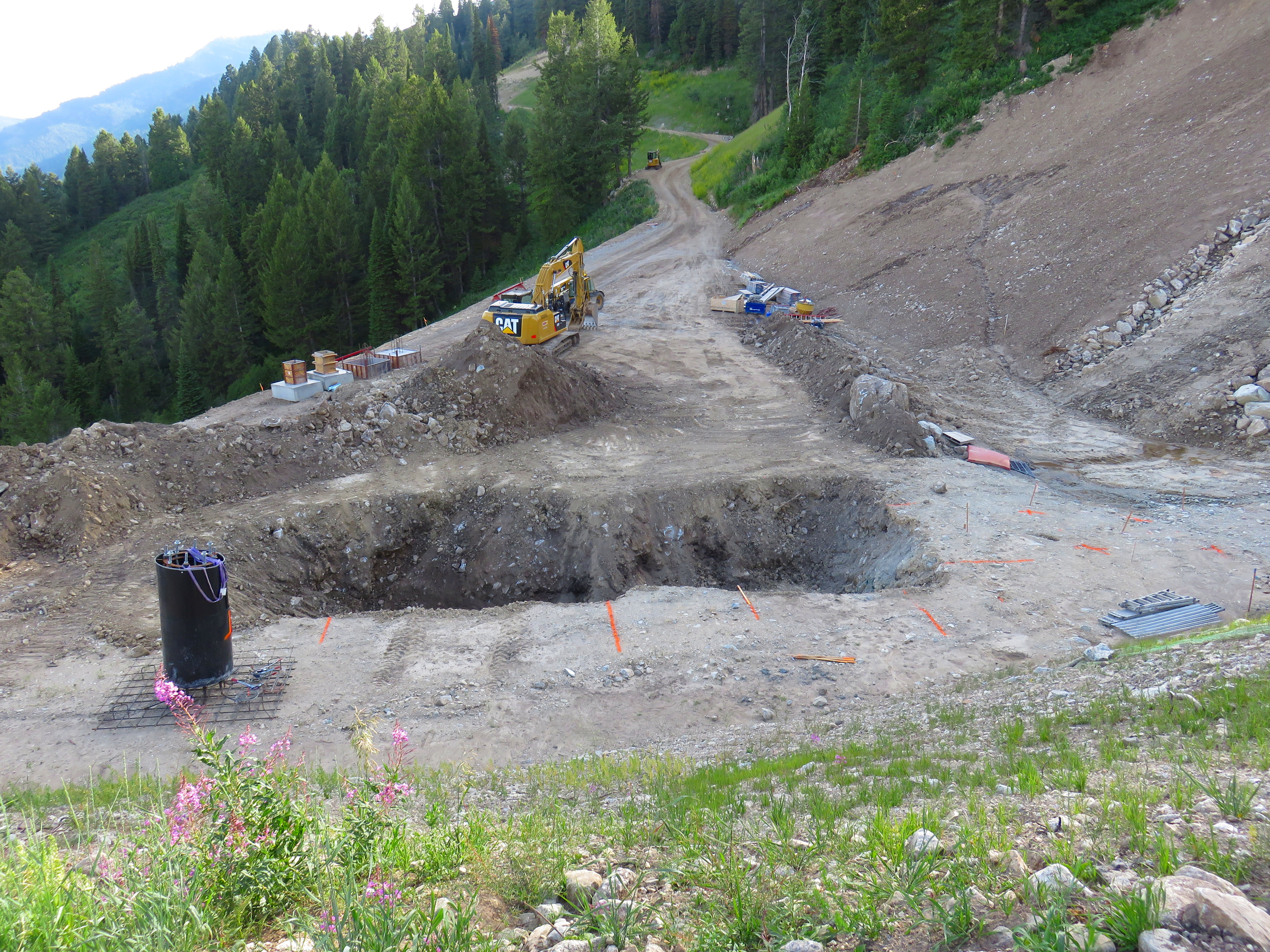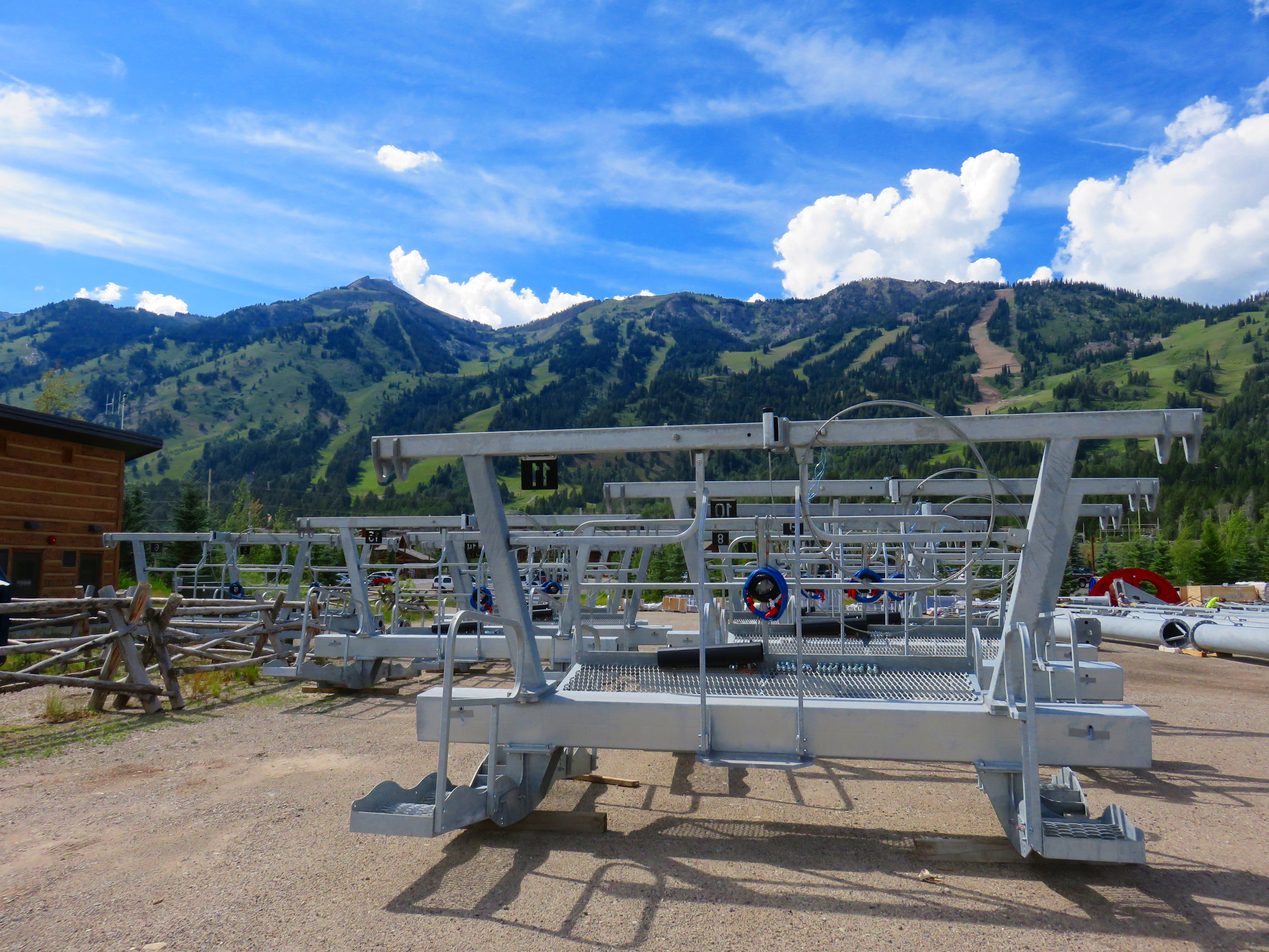 It’s mid-July and construction is ramping up on the north side of the Jackson Hole Mountain Resort. A K-Max helicopter from Timberline Helicopters was on-site Sunday to fly concrete for the towers that couldn’t be accessed by road. The rest of the tower footings were already finished and back filled. Concrete work is also complete at the top terminal and steel will be going up shortly. The bottom terminal is a few weeks behind. Down in the parking lot, towers are mostly assembled and terminal components will be headed up the hill soon.