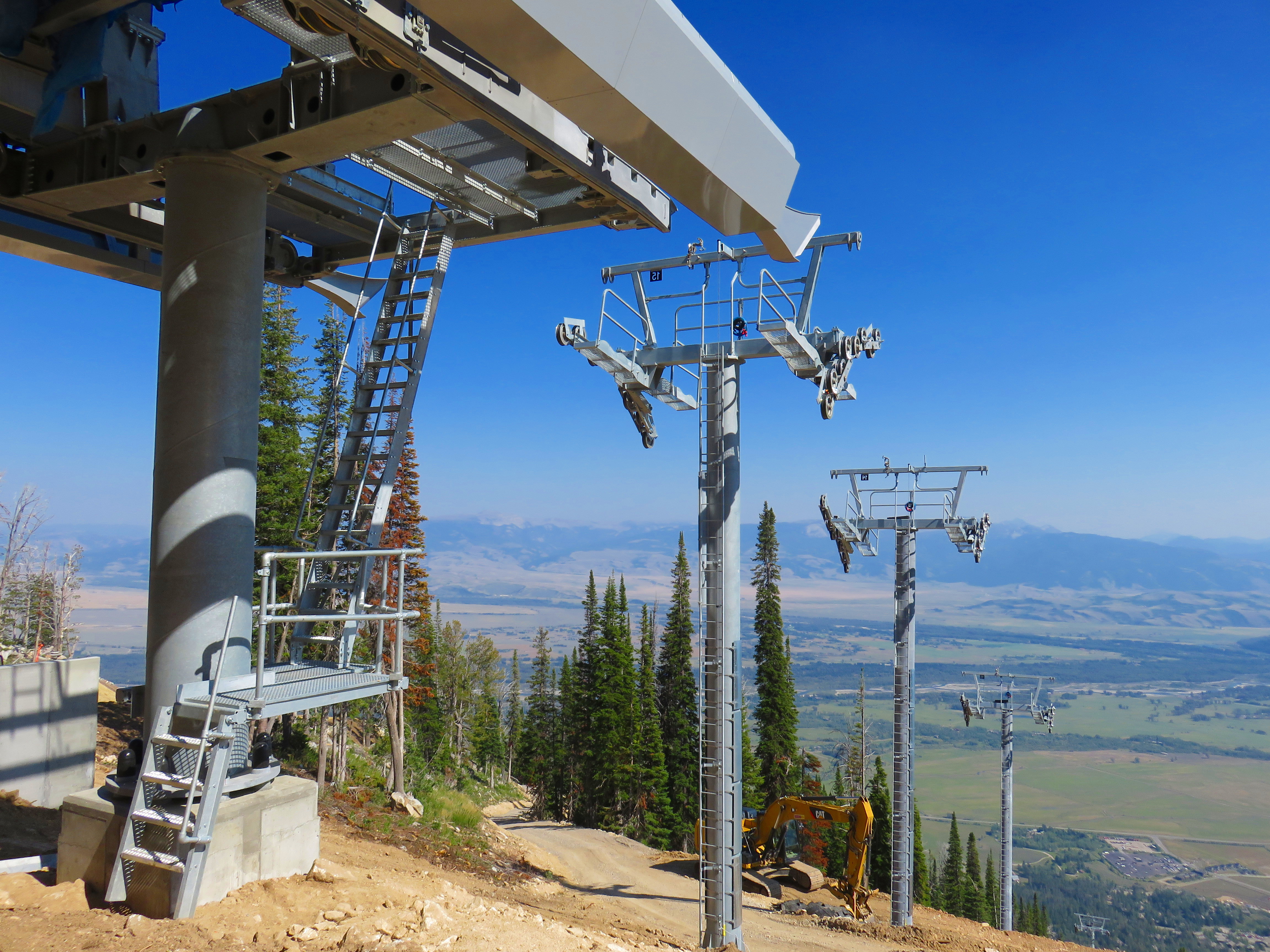 Workers from Doppelmayr began assembling the top terminal of the Teton lift by crane this week. Once the top is finished, crews will move to the bottom return terminal 1,800 feet below. The lift is on schedule to be load tested by mid-October. A new ski patrol station is also taking shape and grading continues on the new Kemmerer, Ridge and Wide Open runs. Weather permitting, the entire expansion will open December 19th.