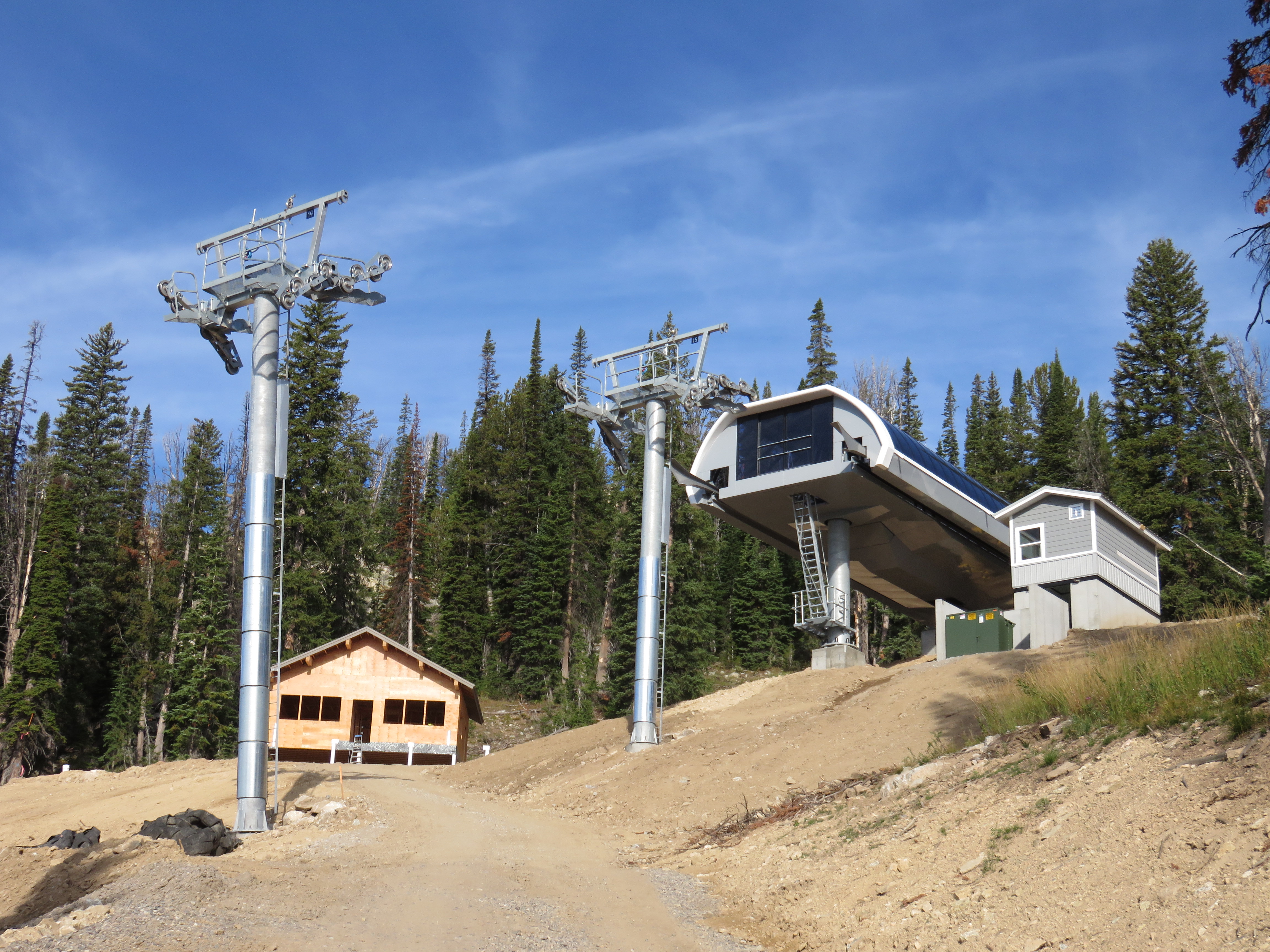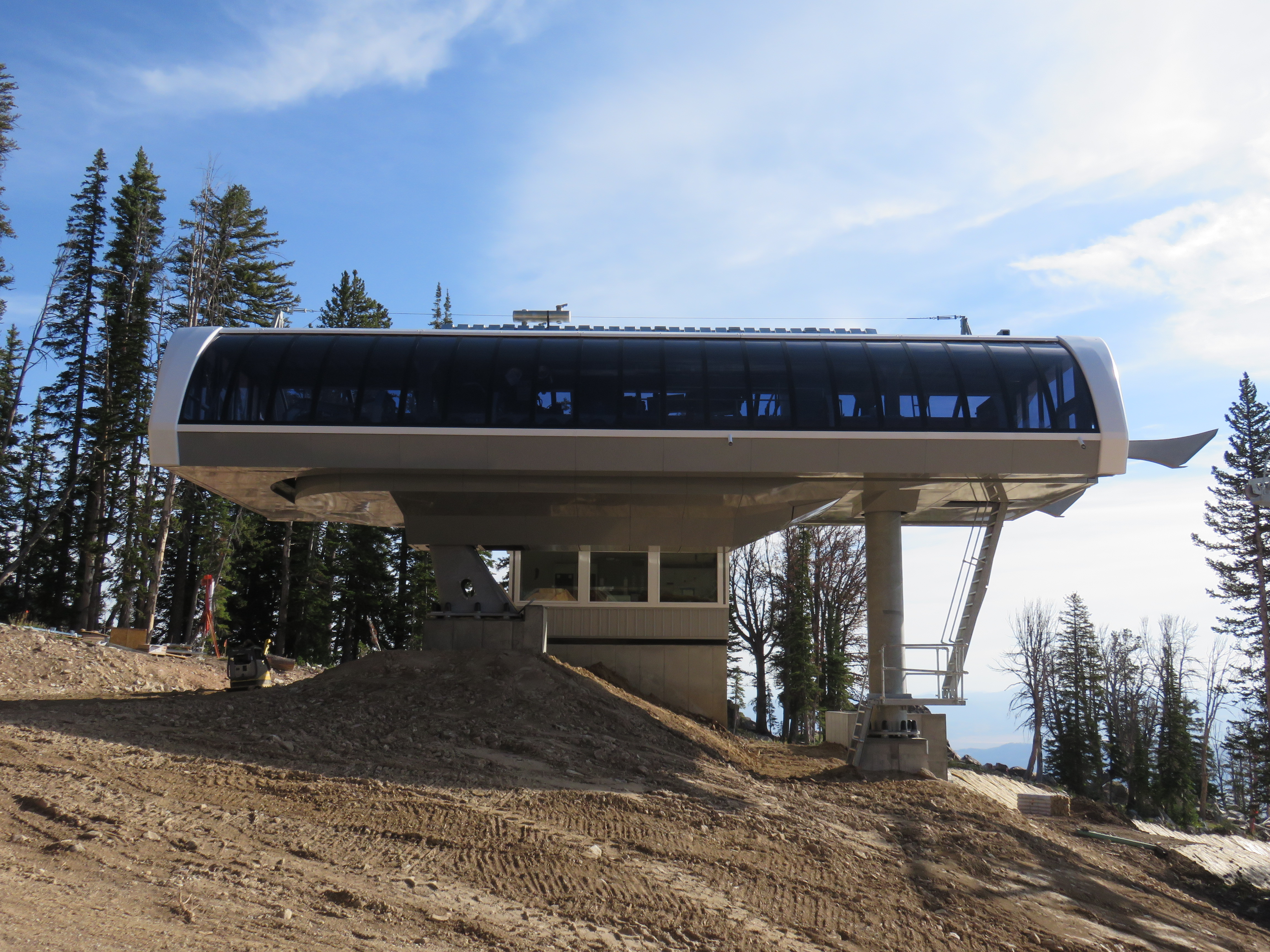 The crew from Doppelmayr is flying through work on the Teton lift with 110 days until opening. Jackson Hole’s fourth high speed quad now has a complete top terminal with the bottom not far behind. The Uni-G model terminals are mostly gray with white ends. The 8,500′ haul rope, which was manufactured in Canada, was brought up the mountain earlier this week. Eighty DT-104 Agamatic grips also arrived in crates last week. The bottom lift shack is the only large component not in already in place besides the haul rope. At this rate I would not be surprised to see a load test by October 1st.