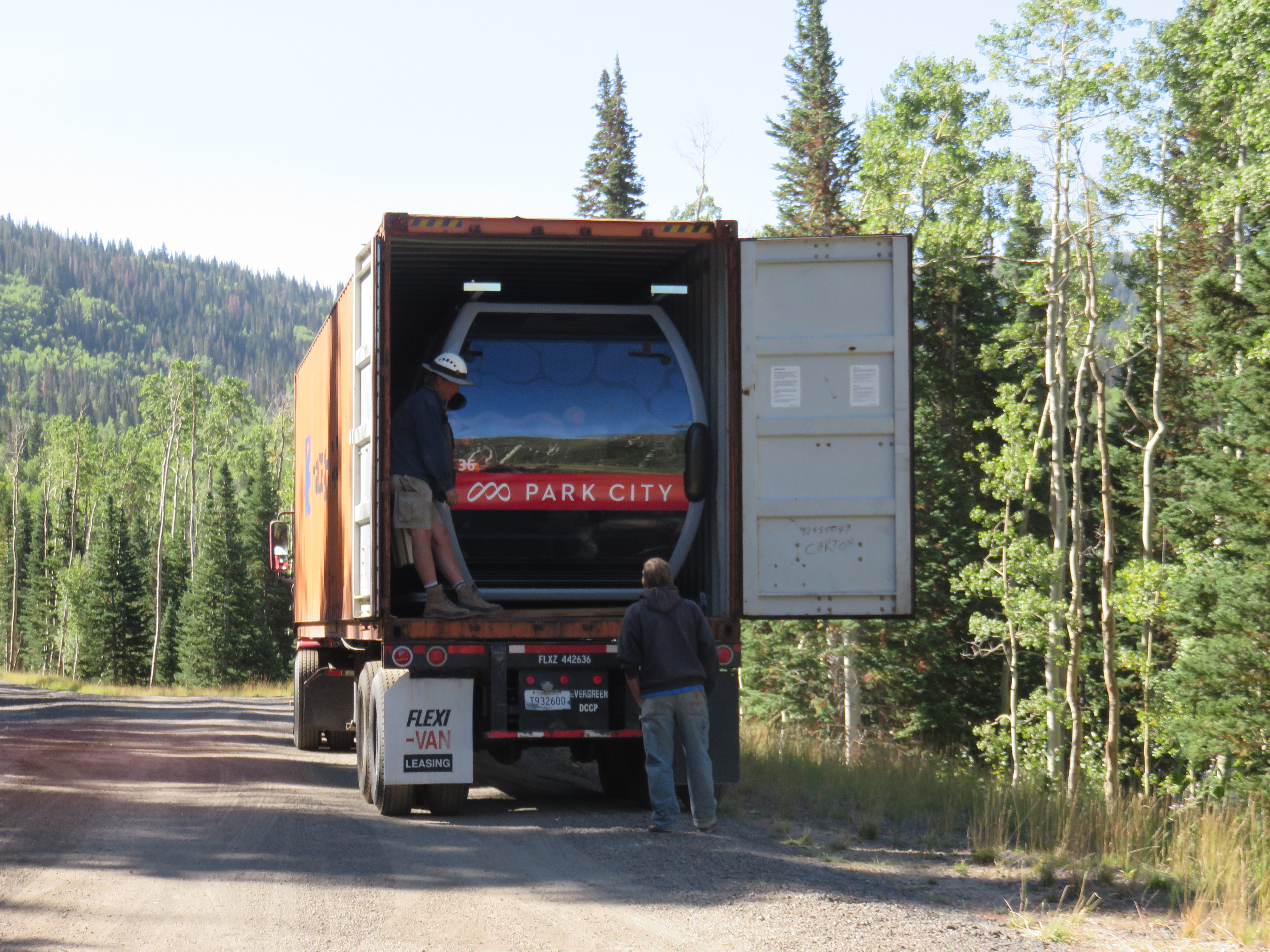 Speaking of parts, the remaining portions of the Miner’s Camp terminal are in Park City’s parking lot while everything for the mid-station is staged along roads in The Colony. A couple dozen cabins have arrived from CWA and more were being delivered today. I’m guessing CWA is still building them and shipping a handful at a time. The cabins arriving today were numbered in the 30’s.