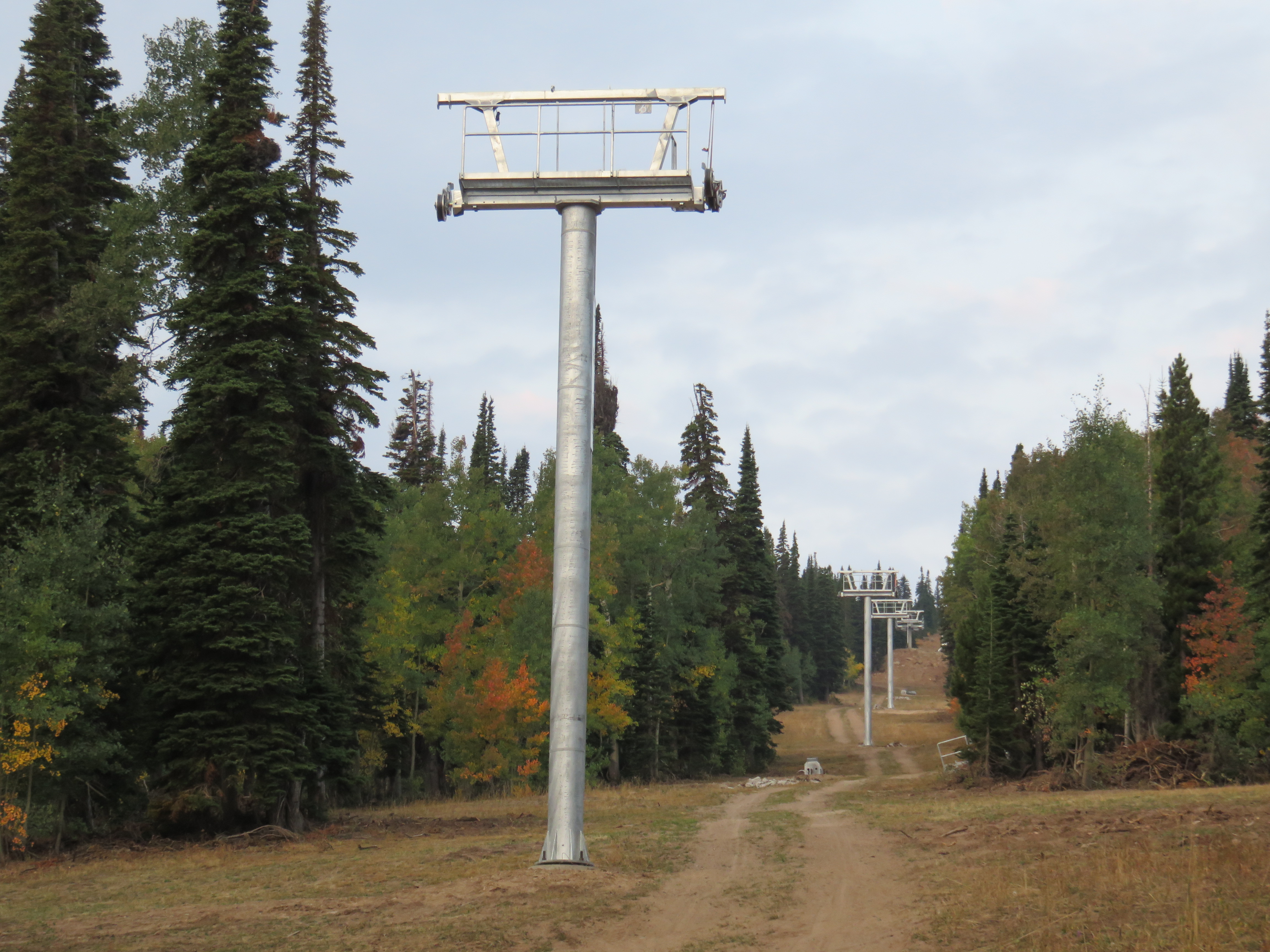 Pomerelle originally had Stearns-Roger and SLI double chairs, built in 1964 and 1975, respectively. The longer of the two was replaced by a CTEC triple in 1988 and now a SkyTrac triple will replace the shorter double chair. Work didn’t begin until late July but the SkyTrac crew has already installed most of the lift. Because of the mellow terrain, towers are being set without a helicopter and only numbers 7 and 10 are left to go up. The top terminal is finished and the bottom station just needs a motor room. I didn’t see a haul rope or chairs yet. The lift also apparently still needs a name!