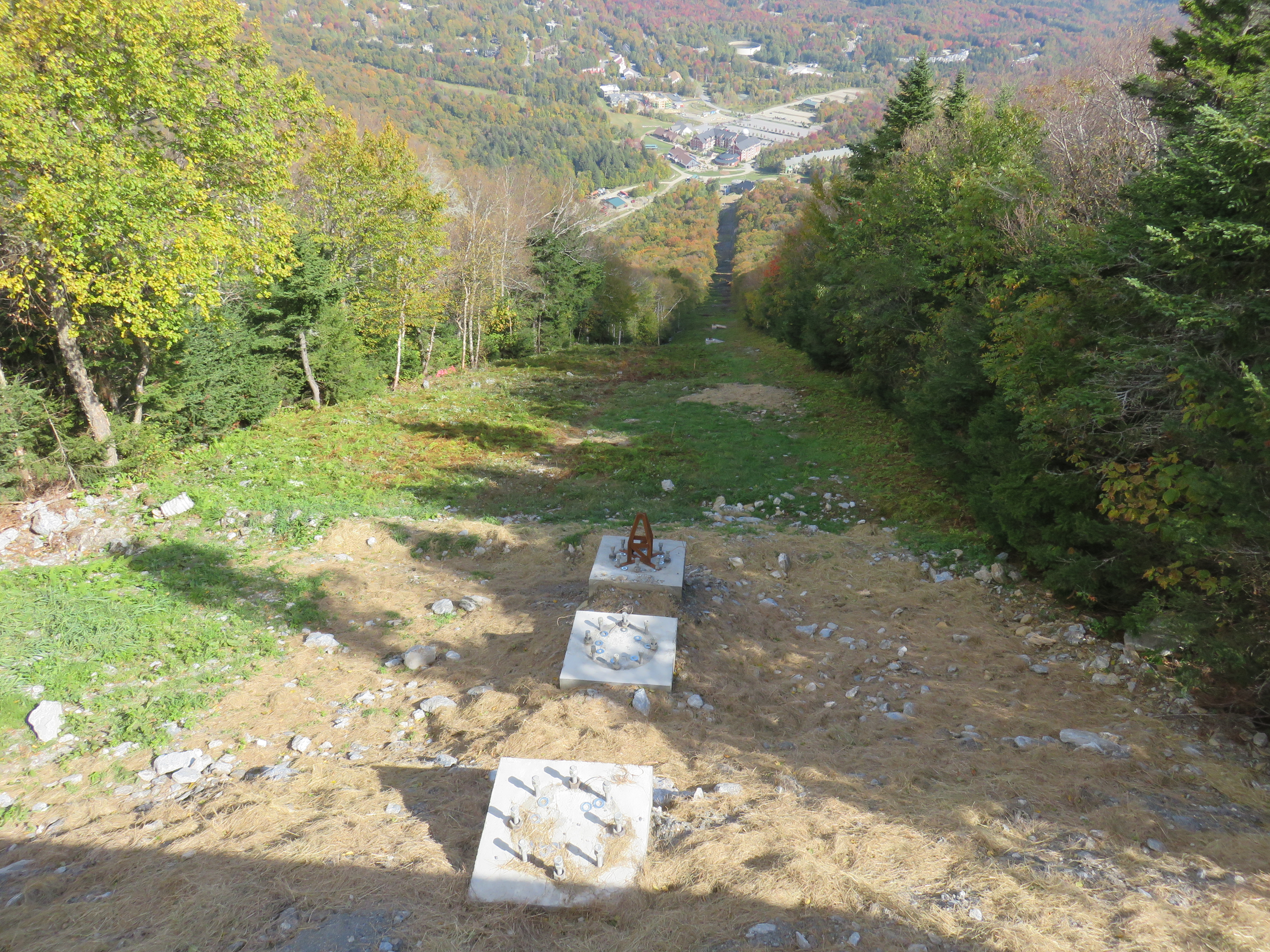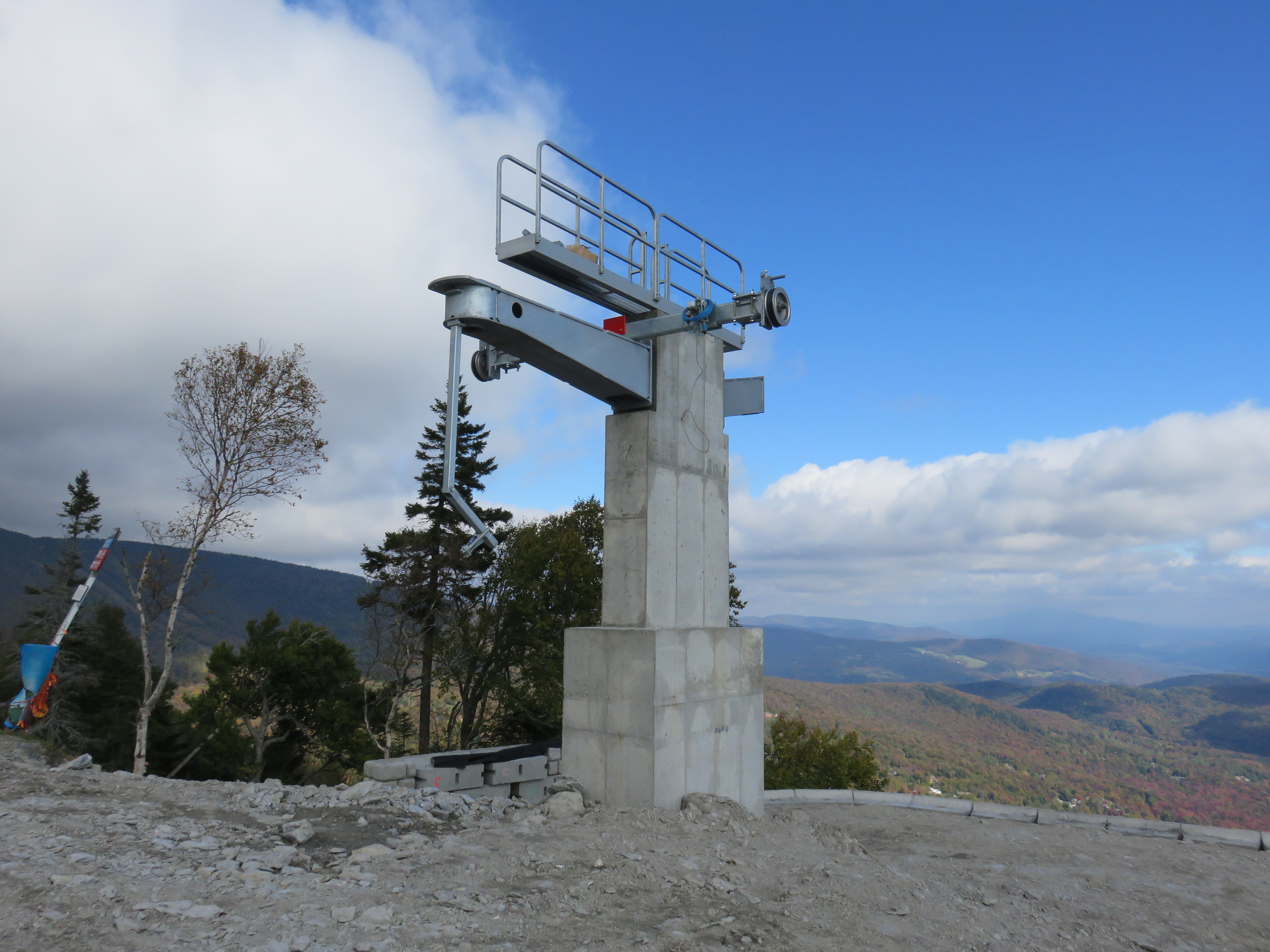 New England ski areas are building three new lifts this summer and all of them happen to be in Vermont. At Sugarbush, the Valley House double (a 1960 Carlevario-Savio) is out and a Doppelmayr fixed-grip quad is going in. At some point the old lift got a new Poma Alpha drive terminal and Borvig chairs. The perfectly good Poma terminal is off to West Mountain on the other side of Lake Champlain in New York. Sugarbush’s new lift looks like it’s going to have the Tristar-model terminal like many other recent Doppelmayr lifts in New England. The bottom terminal has been moved downhill to be much closer to the Super Bravo Express than the old lift. This will be Sugarbush’s 8th quad chair between Lincoln Peak and Mt. Ellen. Doppelmayr still has a ways to go on this project with just a couple towers and sections of both terminals standing but all the important concrete work is done.