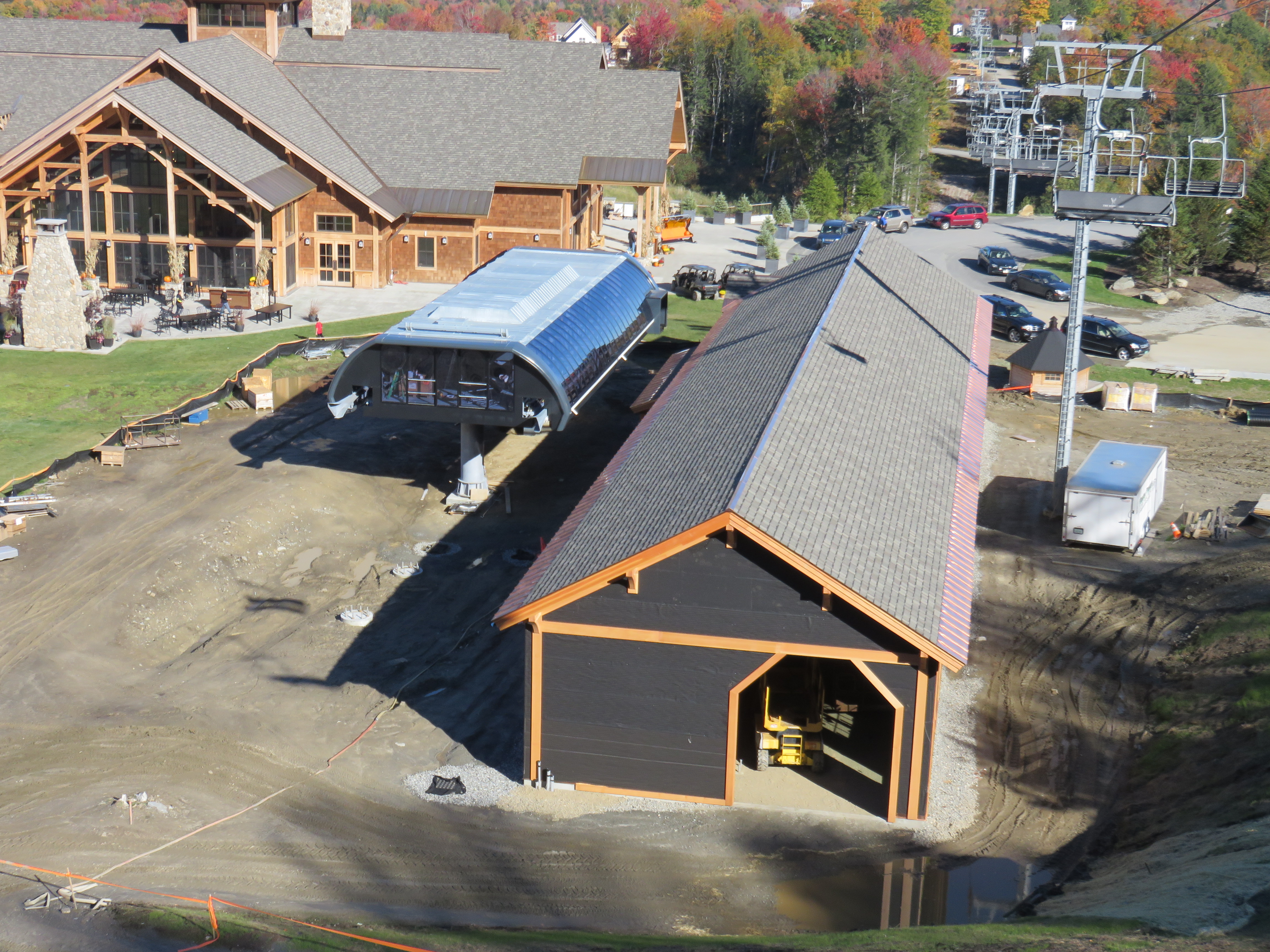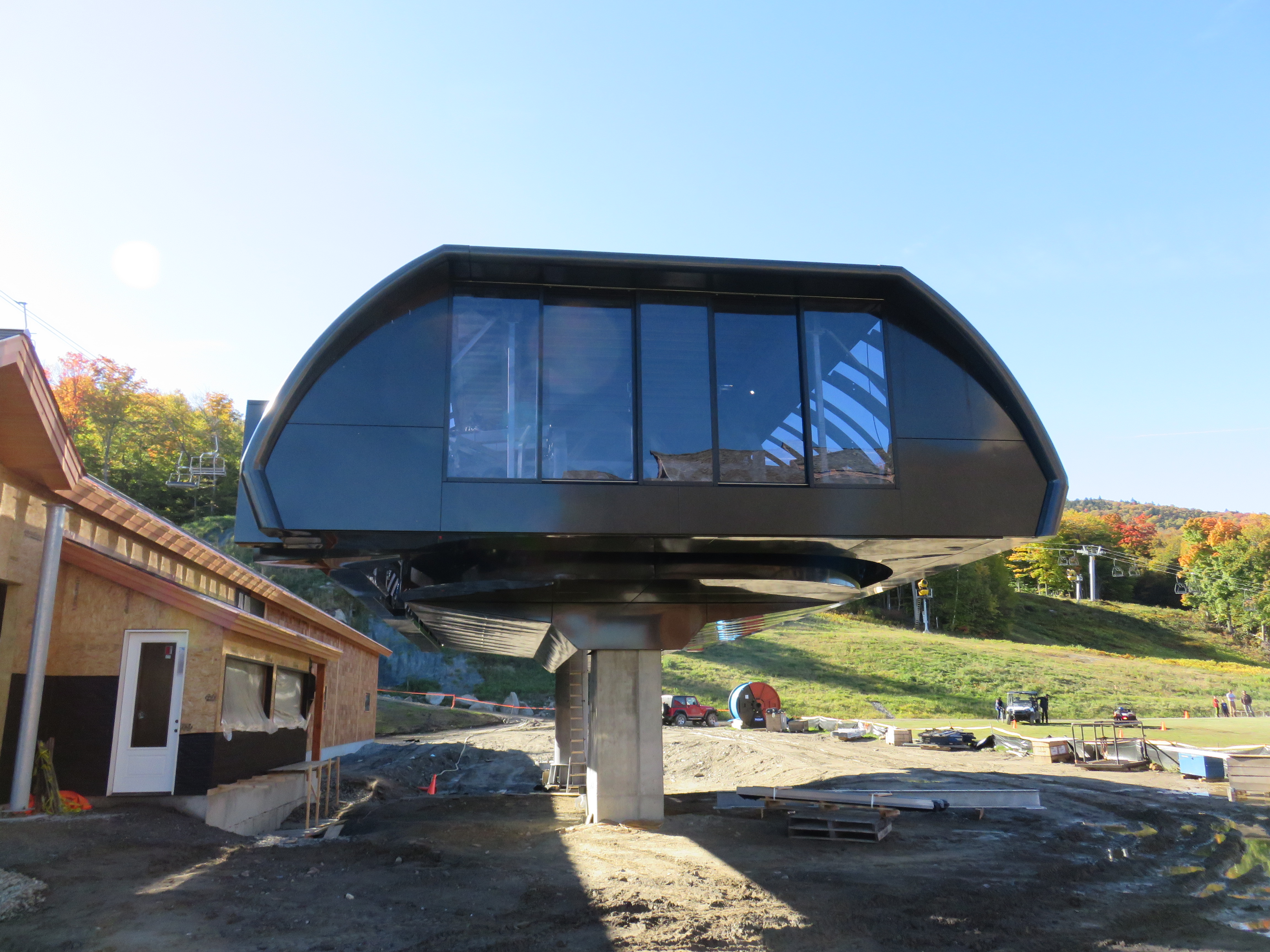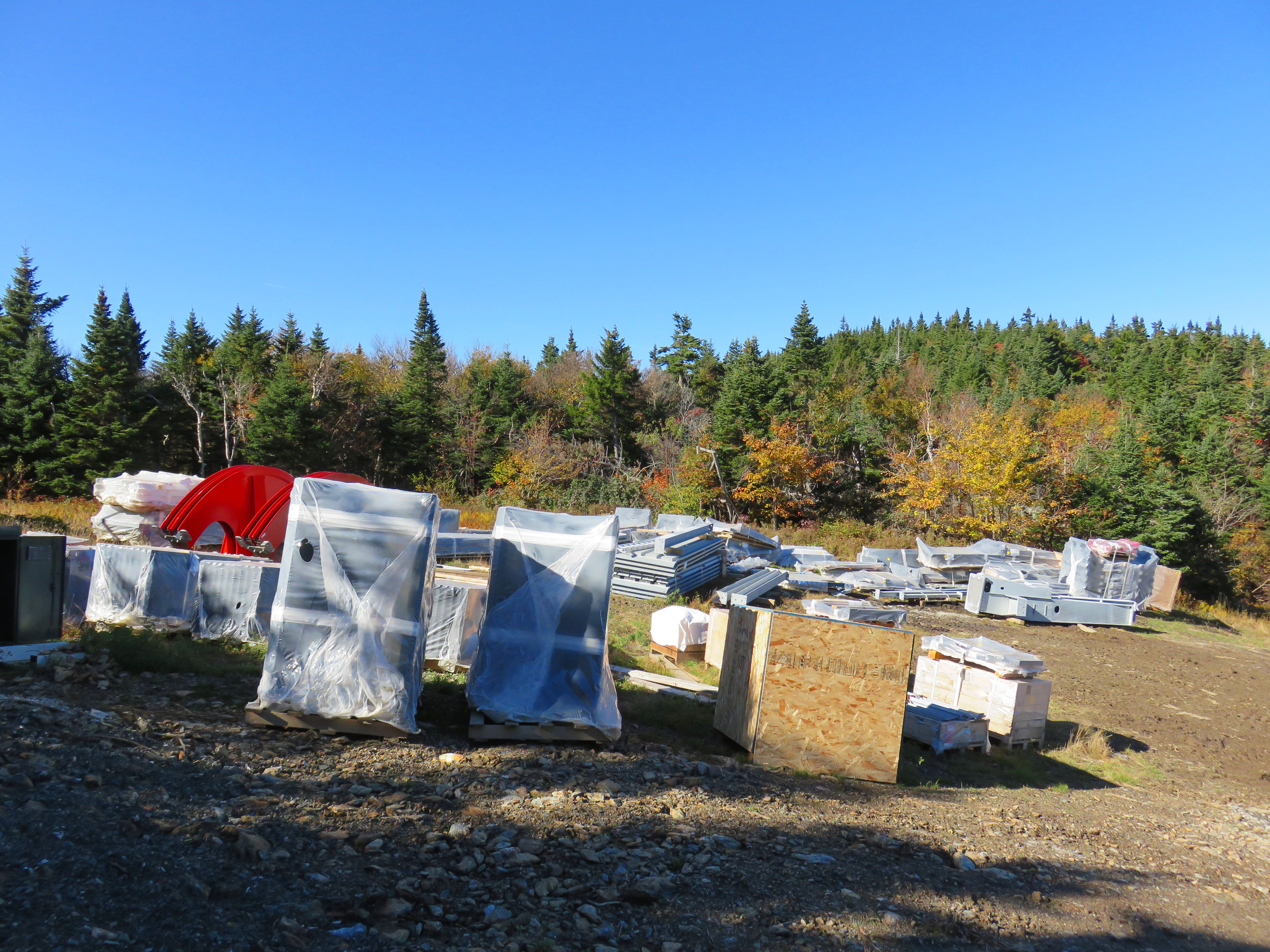 The replacement project is pretty far along with concrete poured and all parts for the lift onsite. The bottom terminal is finished and everything at the top is staged for a crane’s arrival. Tower heads are being assembled in the base area and the tubes are ready for a helicopter. The bottom terminal looks sharp in black and the top looks like it will be light gray. Chairs have already been delivered and are being stored under tarps for now.