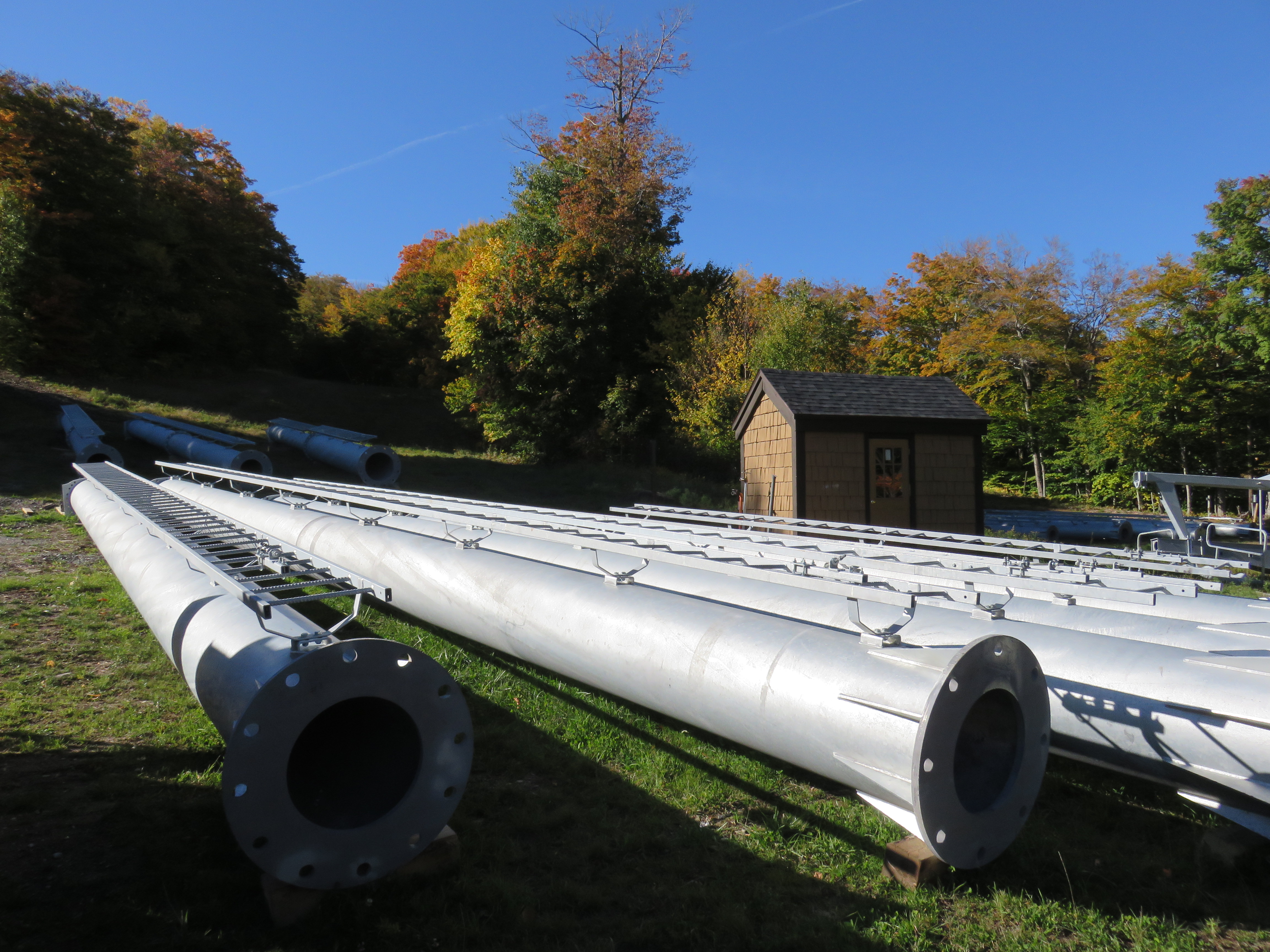 The six pack will be 5,550 feet long and rise 800 vertical feet, taking less than six minutes to ride. It looks like it will have 90-degree loading but no loading carpet. This is one of two six packs Doppelmayr is building in the East this summer, the other being at Sugar Mountain in North Carolina.