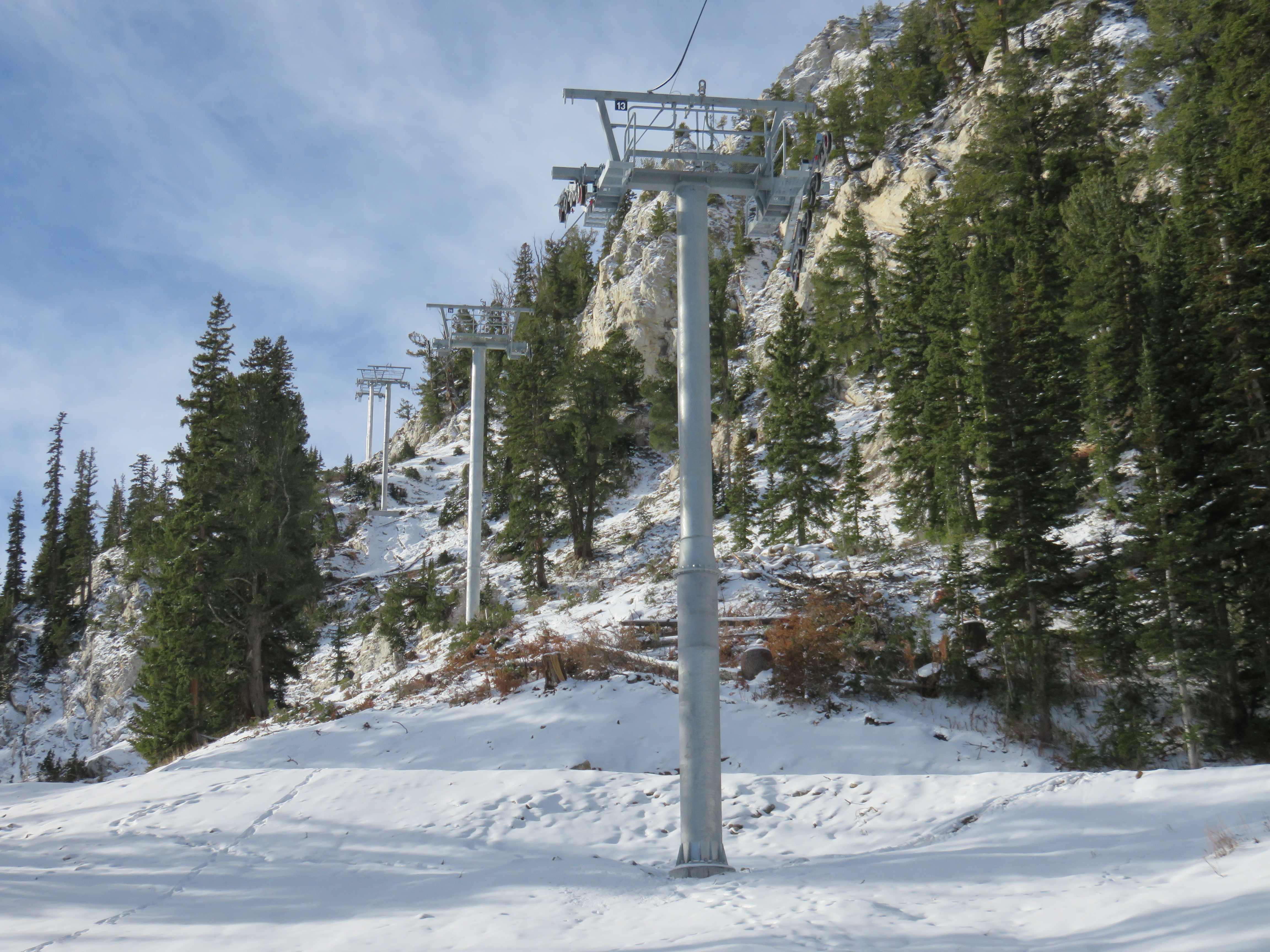 The Summit Express is a Doppelmayr detachable quad replacing a double chair which was one of the first twenty lifts CTEC built back in 1982. The replacement high speed quad’s lift line is completely new and very steep with a bunch of challenging tower locations. At one point, the lift line crests a ridge and jogs sharply down before continuing up again. This lift reminds me of Peruvian at Snowbird (which is only a few miles away) with some very steep sections alternating with flat ones.
