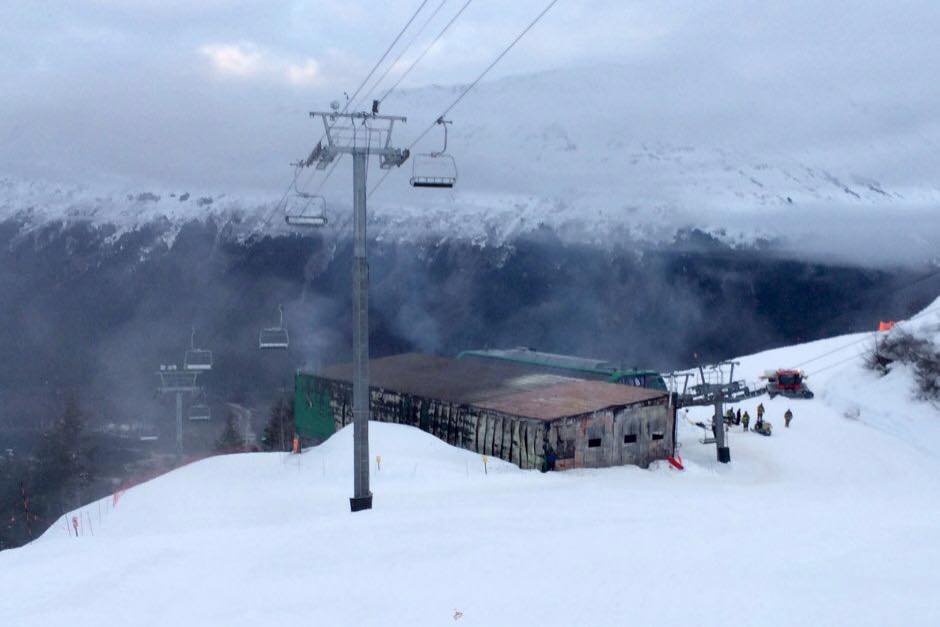 Update 3/25/16: GBX is still down. Alyeska’s snow reports notes, “we have initiated a plan to resume operations of Glacier Bowl Express this season. The fire investigation and preliminary mechanical inspections have been completed, and equipment and tools to make the repairs have arrived. Experts are on site today to assist with repairs, and inspectors will be in place to confirm successful repairs and oversee the return to safe operations.” From the below post on Instagram, it looks like the fire damaged the haul rope, requiring repair.
