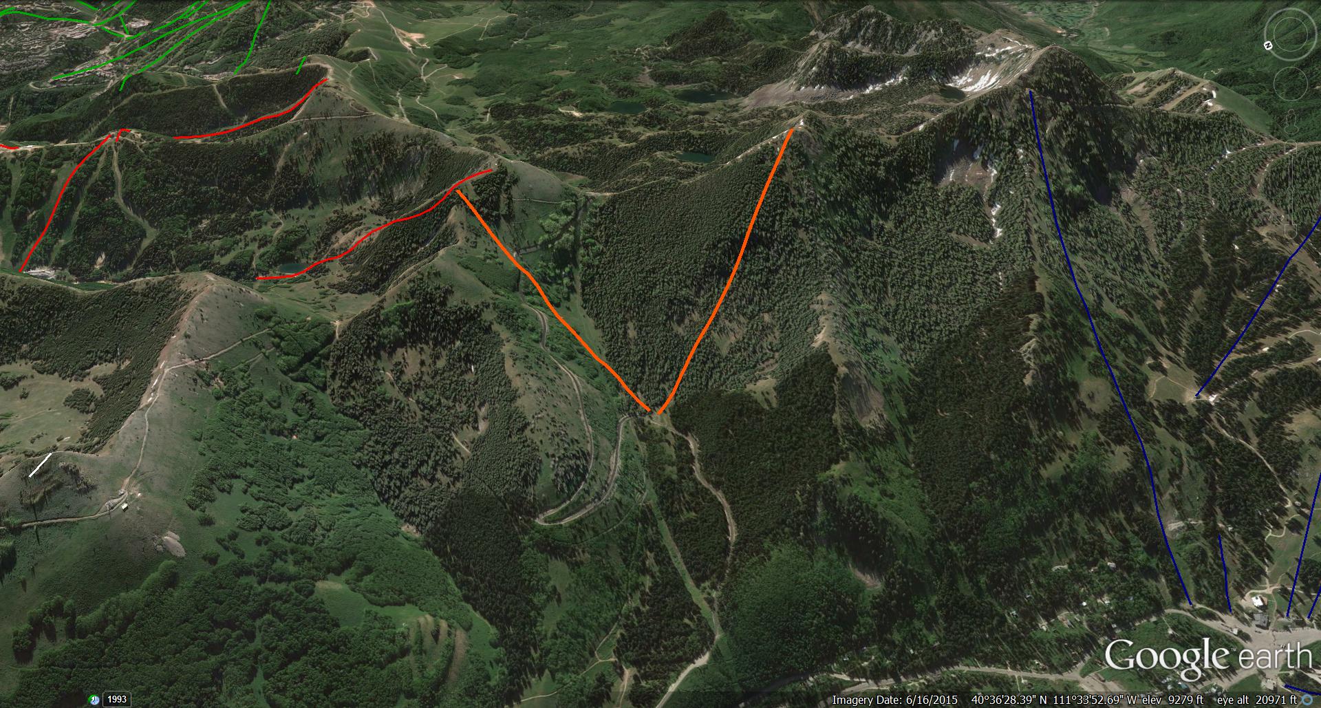 I’m convinced Park City and Brighton will be connected first. Ski Utah calls the two lifts needed for this connection Guardsman A and Guardsman B. They would rise from a common point adjacent to Guardsman Pass Road between Brighton and Park City’s Jupiter pod on land owned by Royal Street a.k.a. Deer Valley. Operationally, it would make the most sense for CNL/Boyne to build and operate these lifts as part of Brighton. Guardsman A, which would need approval from UDOT to cross State Route 190, would likely be a detachable quad approximately 4,065′ long with a vertical rise of 740′ ending near the top of Jupiter. Guardsman B would rise back towards Brighton and be a detachable quad about 3,800′ long with a vertical of 1,235′.