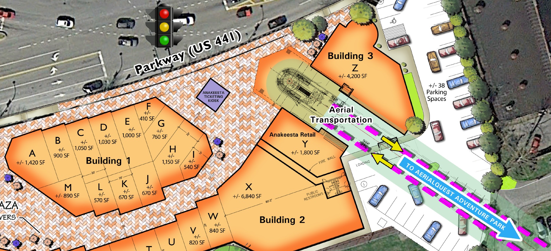 Anakeesta’s developers were kind enough to provide me with a few details on this unique lift. I initially assumed it would be a pulse gondola system similar to the Iron Mountain Tramway that serves a mountaintop adventure park in Colorado. Anakeesta’s chondola will be the first lift of its kind to feature chairs and gondola cabins. I’m pretty sure no one else has done this anywhere in the world on a fixed-grip lift. In order to accomplish the feat, line speed will be very slow – under 200 feet a minute. The system will be 2,032 feet long with a vertical of 528′ and will take about 12 minutes to ride. It will have 104 quad chairs with 8 six-passenger gondola cabins carrying a total of 1,000 passengers per hour. Since no contract has been signed, the developer is not quite ready to say which lift company they are contracting with. But if you know your lifts you can identify the terminal in the drawing above. Anakeesta will open in 2017, crowning Gatlinburg as the lift capital of the southeast!