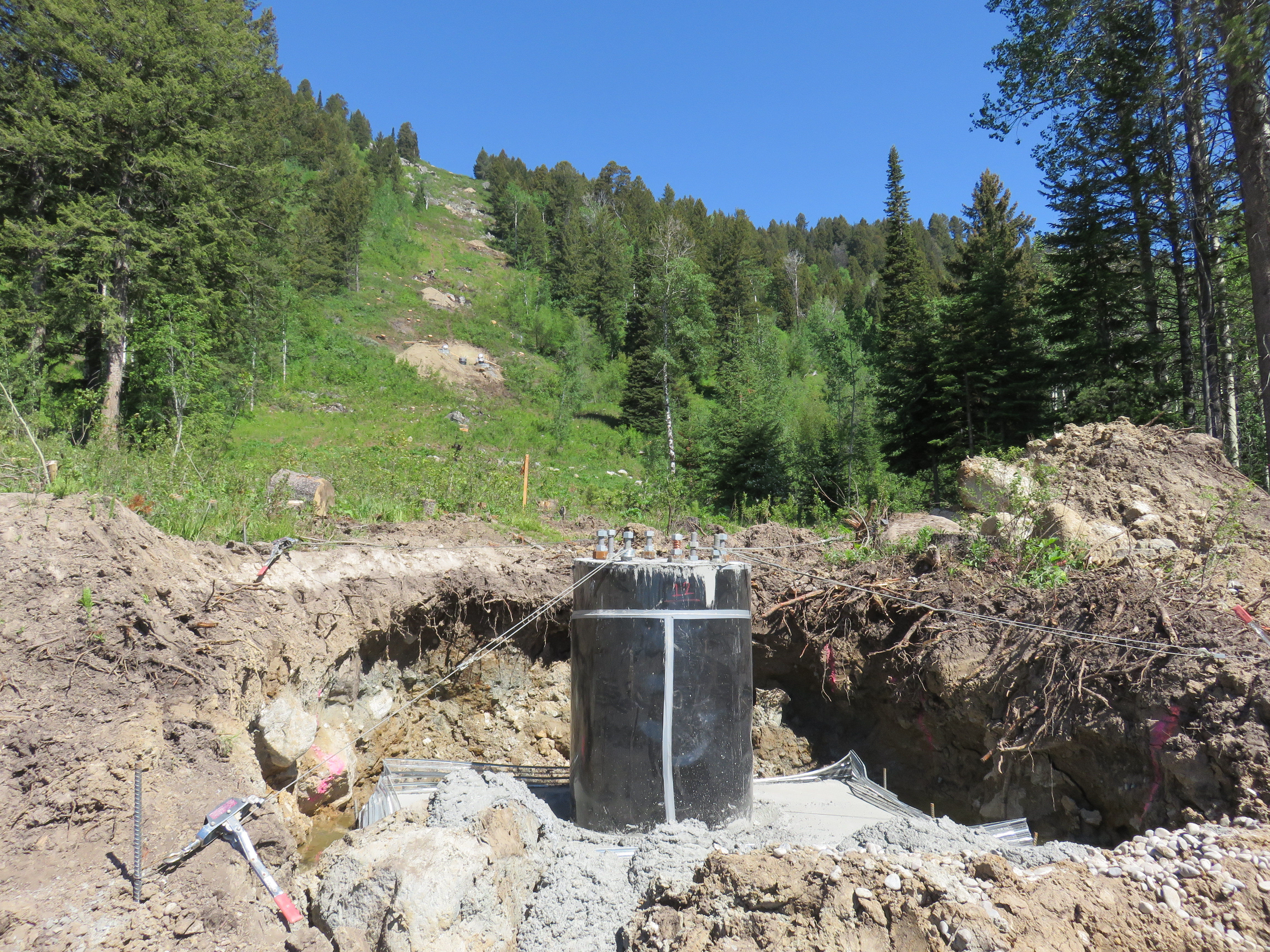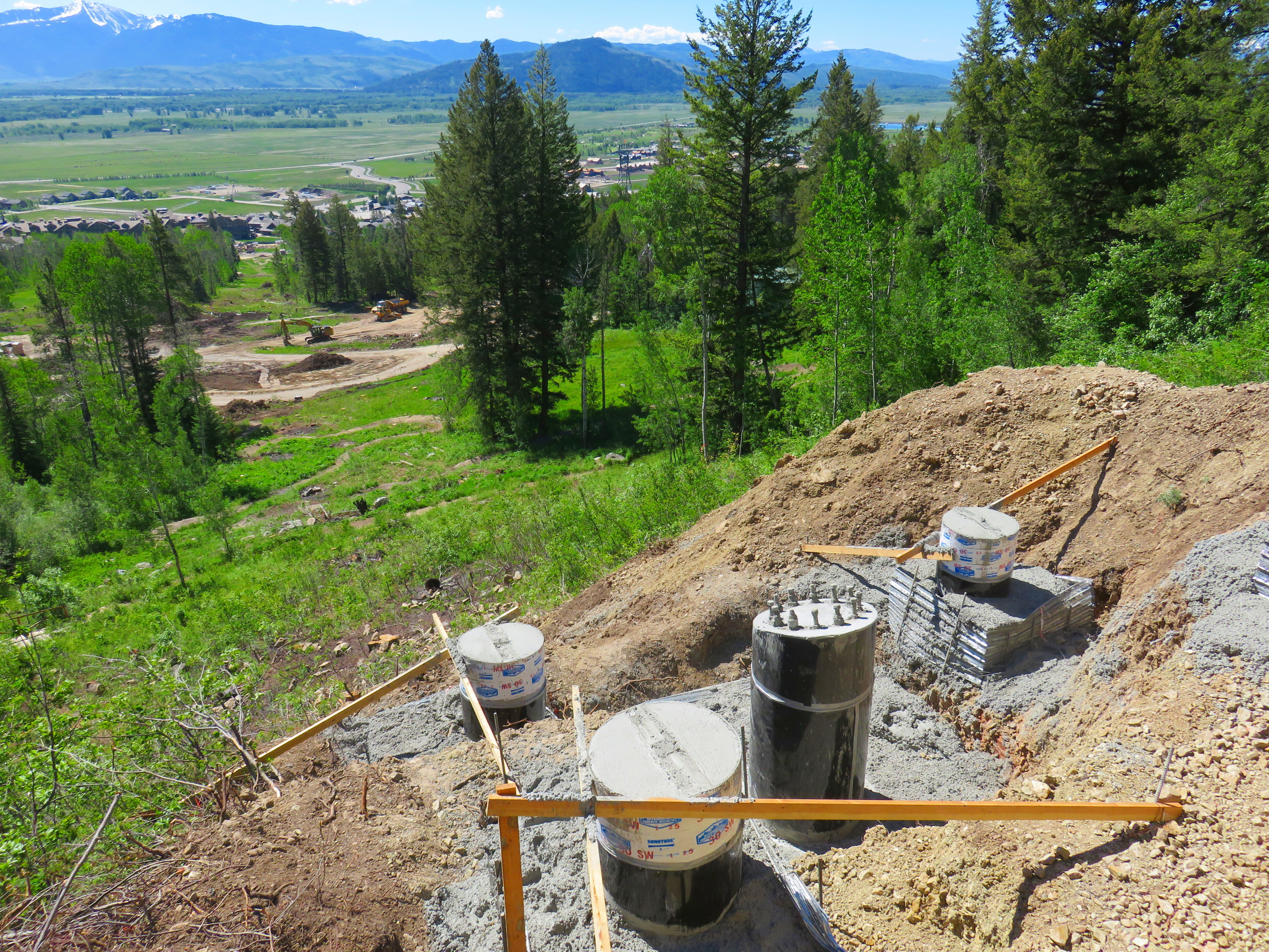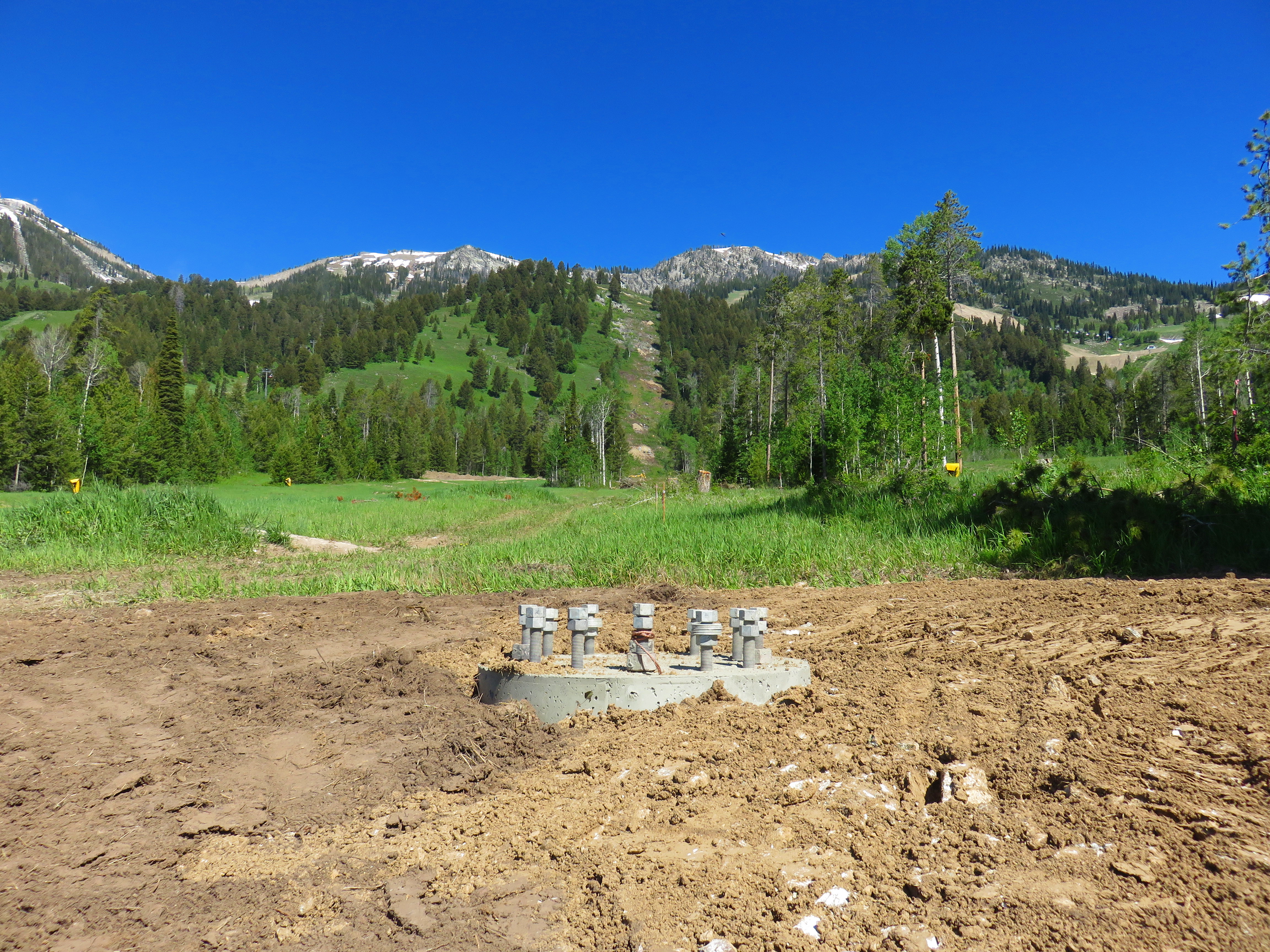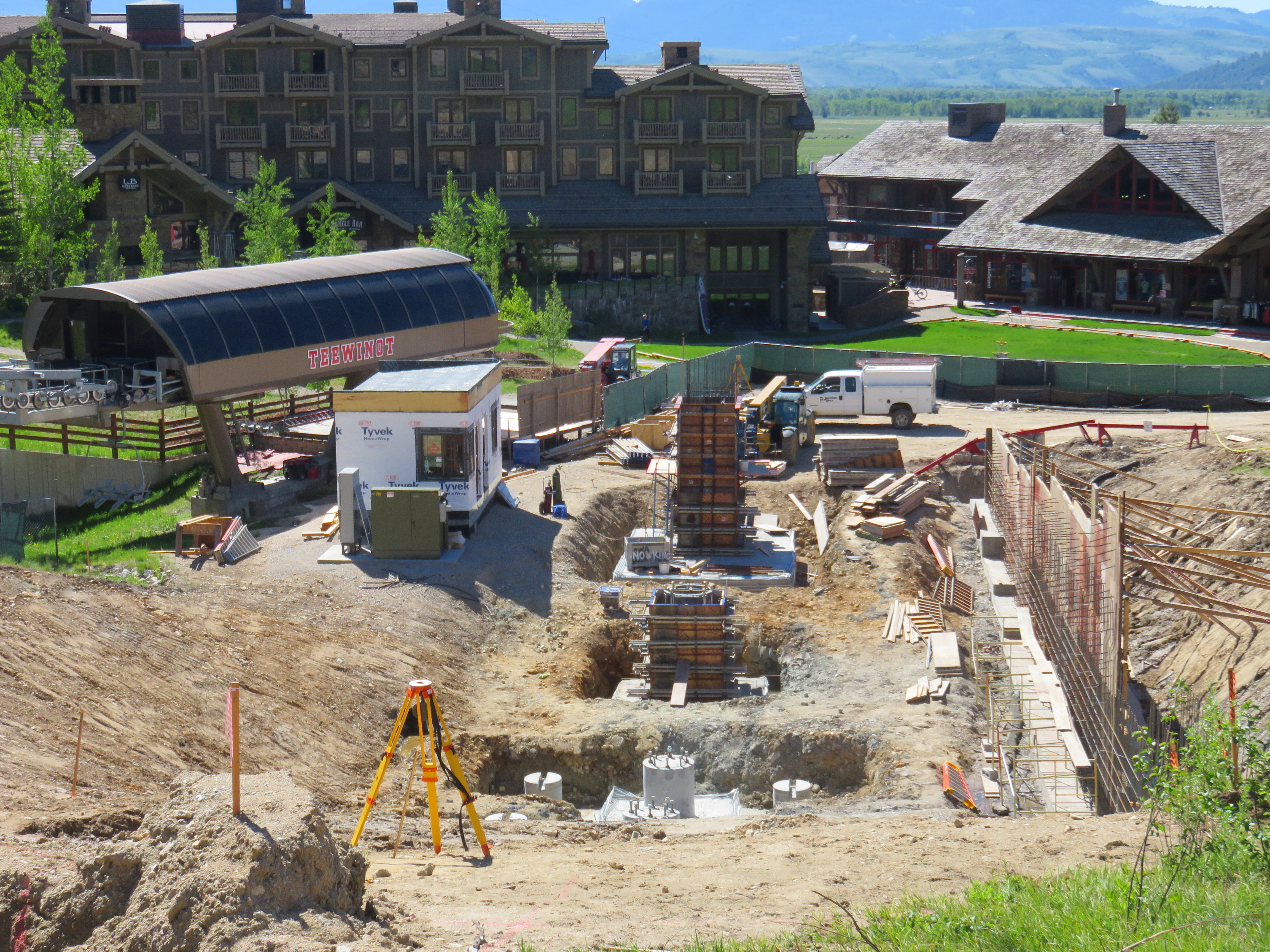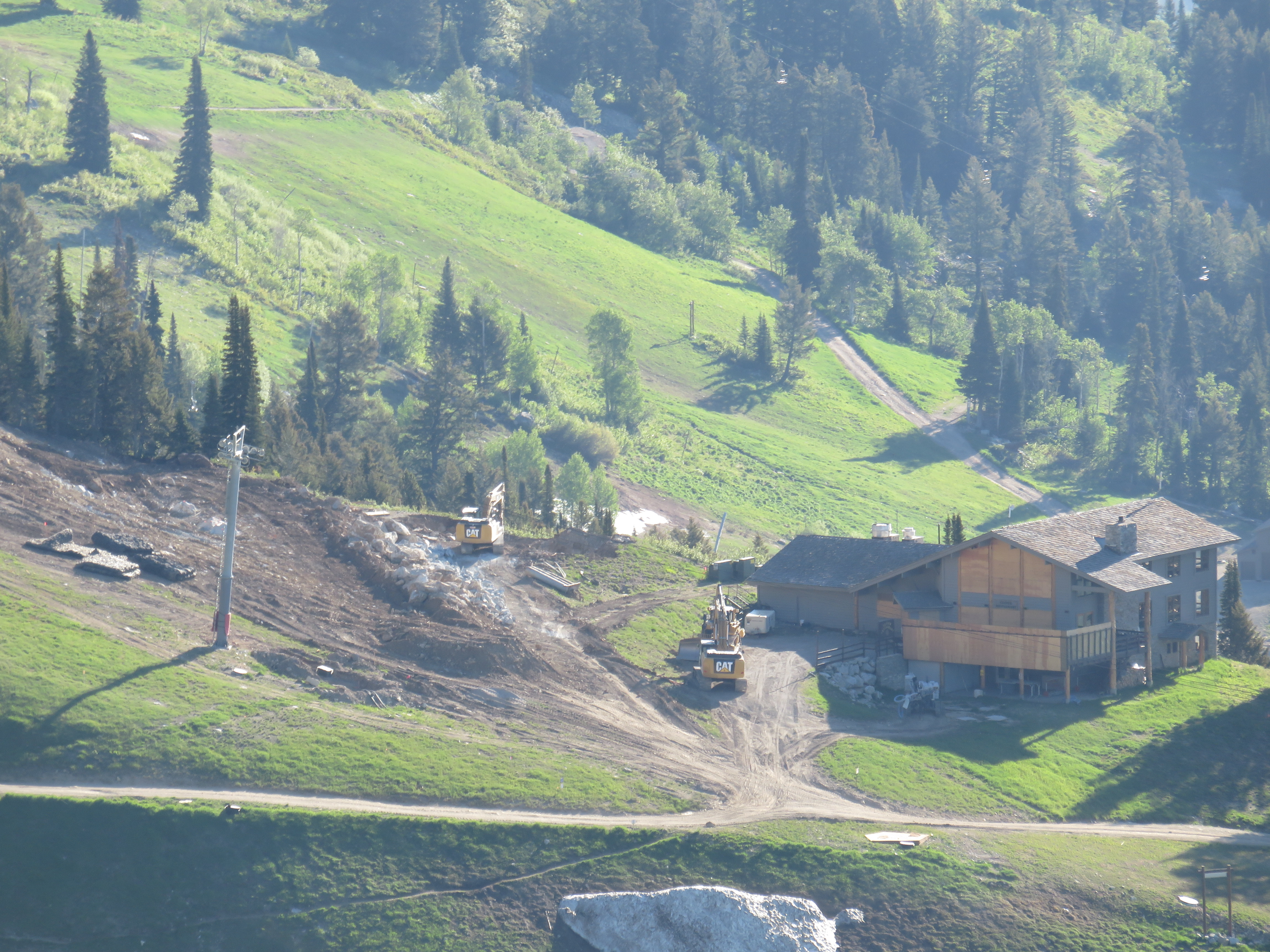 Construction on Jackson Hole’s second gondola is ramping up as the last of the snow melts. The new Sweetwater Gondola will run from the base of the Teewinot high speed quad to the Casper Restaurant with a mid-station unload, boosting out-of-base capacity and providing an improved experience for beginner skiers. As the photos below show, the project is off to a solid start with awesome weather in the last few weeks after a very wet spring.