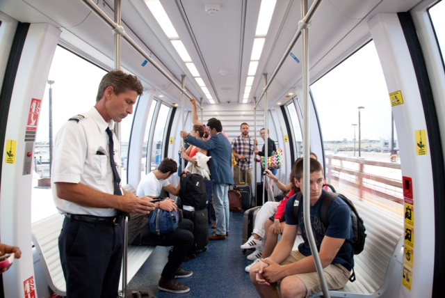Two Sigma-built cars can accommodate 150 passengers each, giving the system an hourly transport capacity of 11,000 riders per hour when phase two opens next year. Two parallel guideways were re-used from the old APM and are 1,230 feet long.