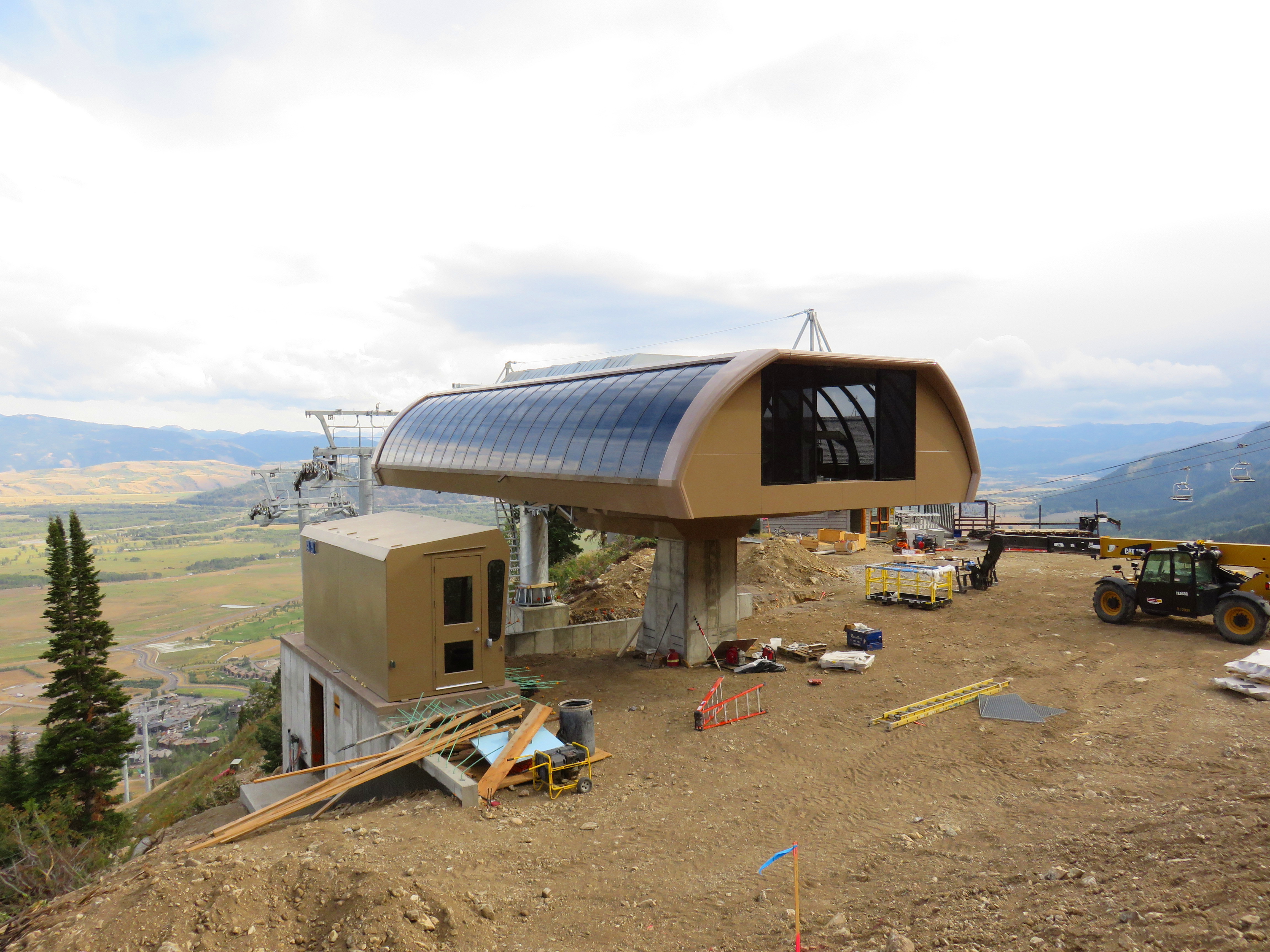 Jackson Hole Mountain Resort opens for skiing 76 days from today and the new Sweetwater Gondola will open for business in mid-December.  Since my last update, the Doppelmayr crew finished the enclosure at the bottom terminal and erected the entire drive station up top.   Doppelmayr custom-designed the lower station skin in Austria for JHMR with a round end to mimic the shape of Teewinot and Bridger.  After some initial skepticism, the consensus around here is it looks awesome and we will have to see if Doppelmayr offers the design to anyone else going forward.  The UNI-G is Doppelmayr’s standard detachable terminal worldwide but the new, boxier D-Line will be offered as an option in North America beginning next year.