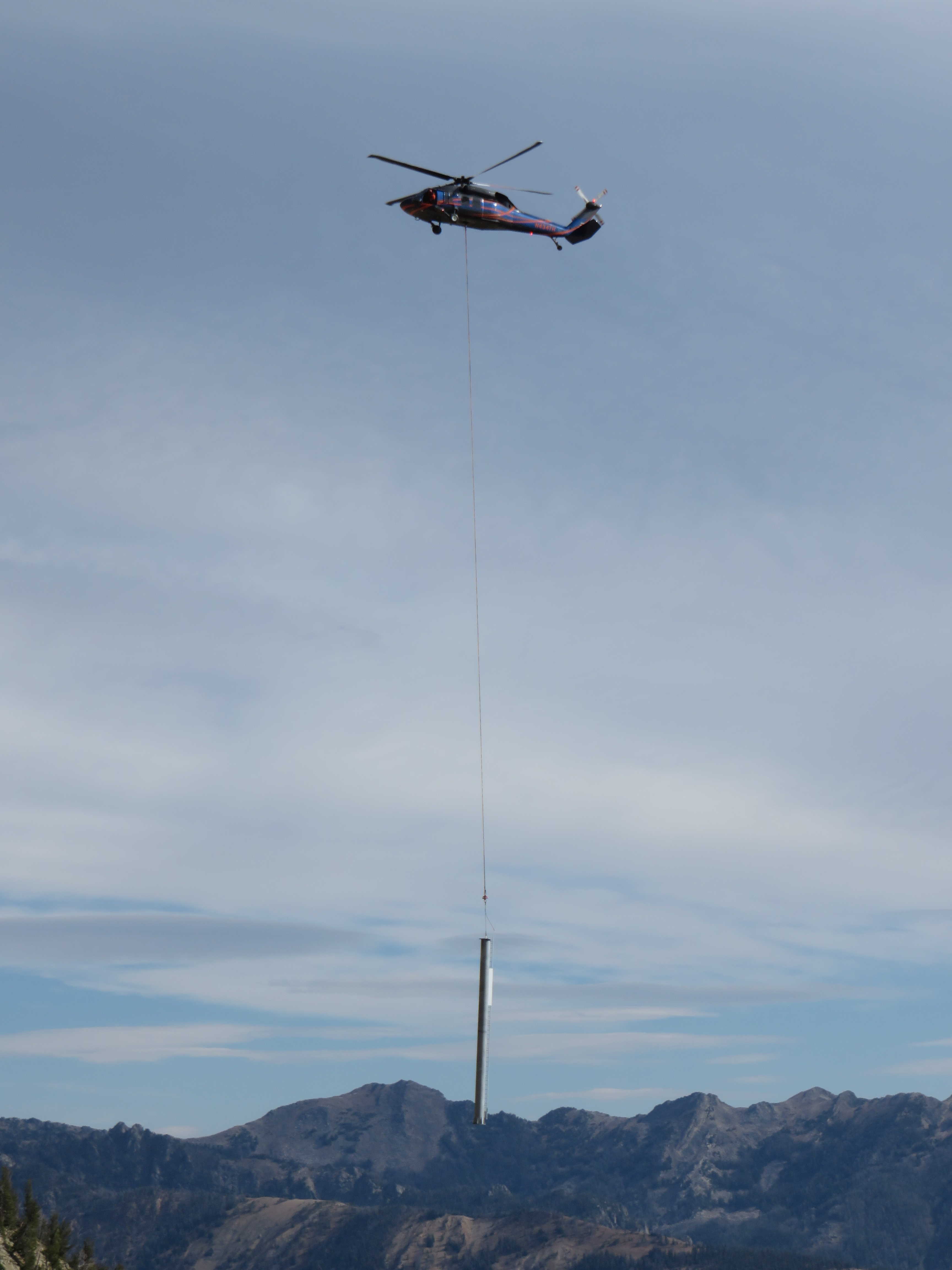 A UH-60 “Black Hawk” from Timberline Helicopters carries a tower head for the new bowl chair at Big Sky Resort September 11, 2016.With a helicopter flying towers this week and Austrian-built chairs arriving, skiers are just a few months away from riding America’s most technologically advanced chairlift in the bowl at Big Sky Resort. Featuring blue bubbles, heated seats, headrests and innovative footrests, Big Sky will be the first public ski resort in North America to get Doppelmayr’s six-passenger CS10 chair (the private Hermitage Club in Vermont got them last year.) The yet-to-be-named Lone Peak lift will initially feature 33 flying couches with footrests between riders’ legs to prevent children from falling. These chairs are the latest and greatest from Doppelmayr and will be used on future lifts built over the next ten years as part of Big Sky 2025.