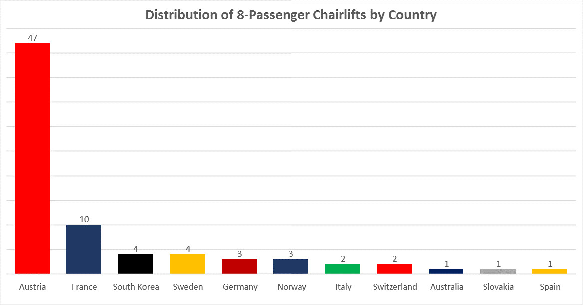 Austria is home to over 60 percent of the world’s eight-passenger chairlifts and exactly five have ever made it out of Europe. Australia and Asia each got their first in 2003 but several leading ski markets have never gone there – among them Japan, Canada, China and the United States.