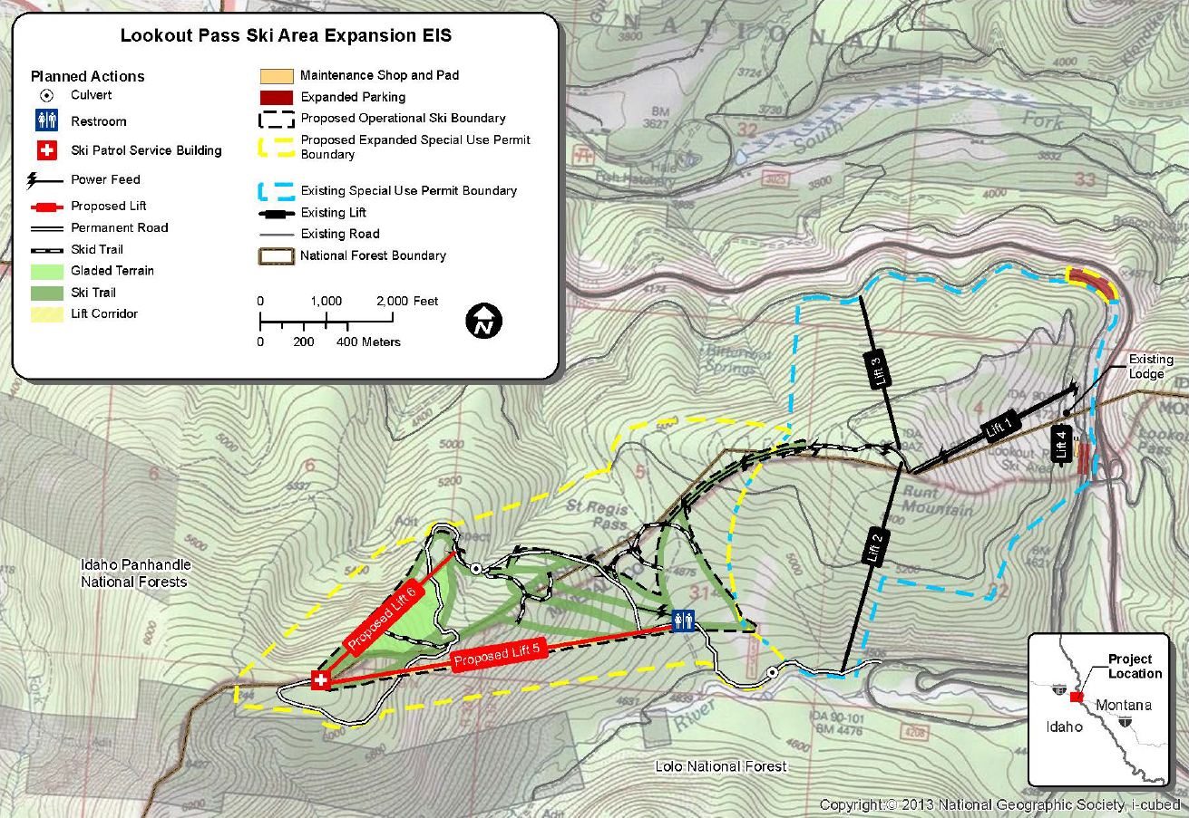 Lookout Pass is the only ski resort in America spanning two states, two National Forests and two time zones.  While markedly low-key, this local favorite on the Idaho-Montana border has grown rapidly from one lift to four since 2002.  A Record of Decision published today by the Idaho Panhandle and Lolo National Forests gives Lookout approval to build two new lifts on Eagle Peak, upgrade Chair 1 and add 15 new trails spanning 654 acres.  Vertical rise will increase more than 40 percent to 1,650′ as the lift-served summit moves from Runt Mountain to Eagle Peak.  Taken alone, the expansion will be larger than all but four ski areas in the Eastern United States.  When combined with current terrain, once little Lookout will provide more than 1,000 acres of terrain for a growing number of skiers in the Inland Northwest.