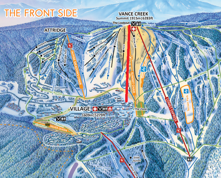 The village is in the middle, so you could ski 2500 feet down to the lowest lift. There are X-country trails up there that open before alpine, they would enjoy it. MTB and walkers will use it in the summer. Perhaps they can mix chairs and cabins? Anyone know?