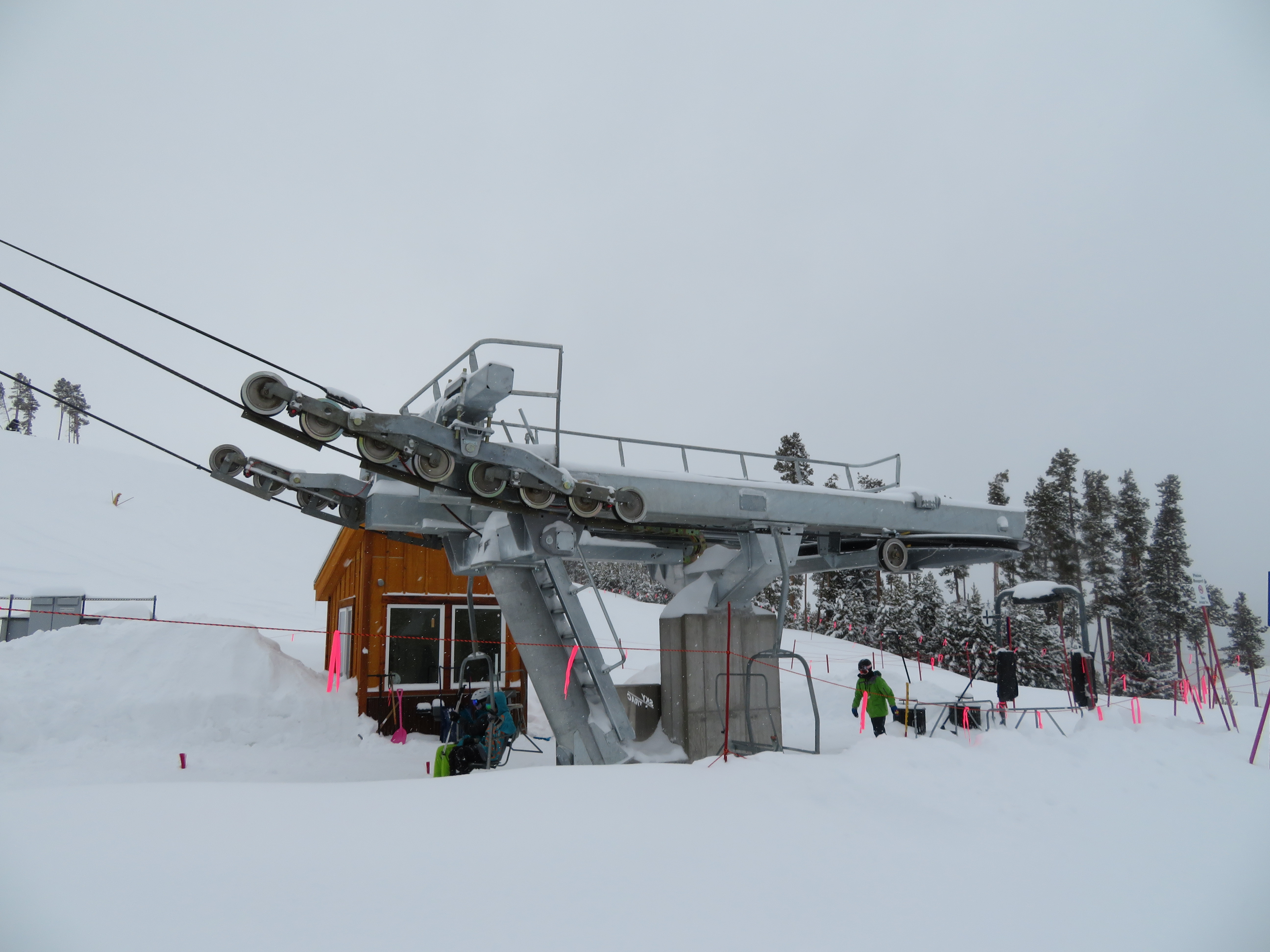 The new Snowflake triple still has only two towers and serves a new run called Hickey’s Hollow. Virginia City will feature 14 towers and load alongside the Jim Bridger Lodge to open up the base area. Unlike most new Skytracs, the new triple chair will have the drive up top and tension down below. Rather than utilizing a Peak return unit, the lower terminal will probably look like this.