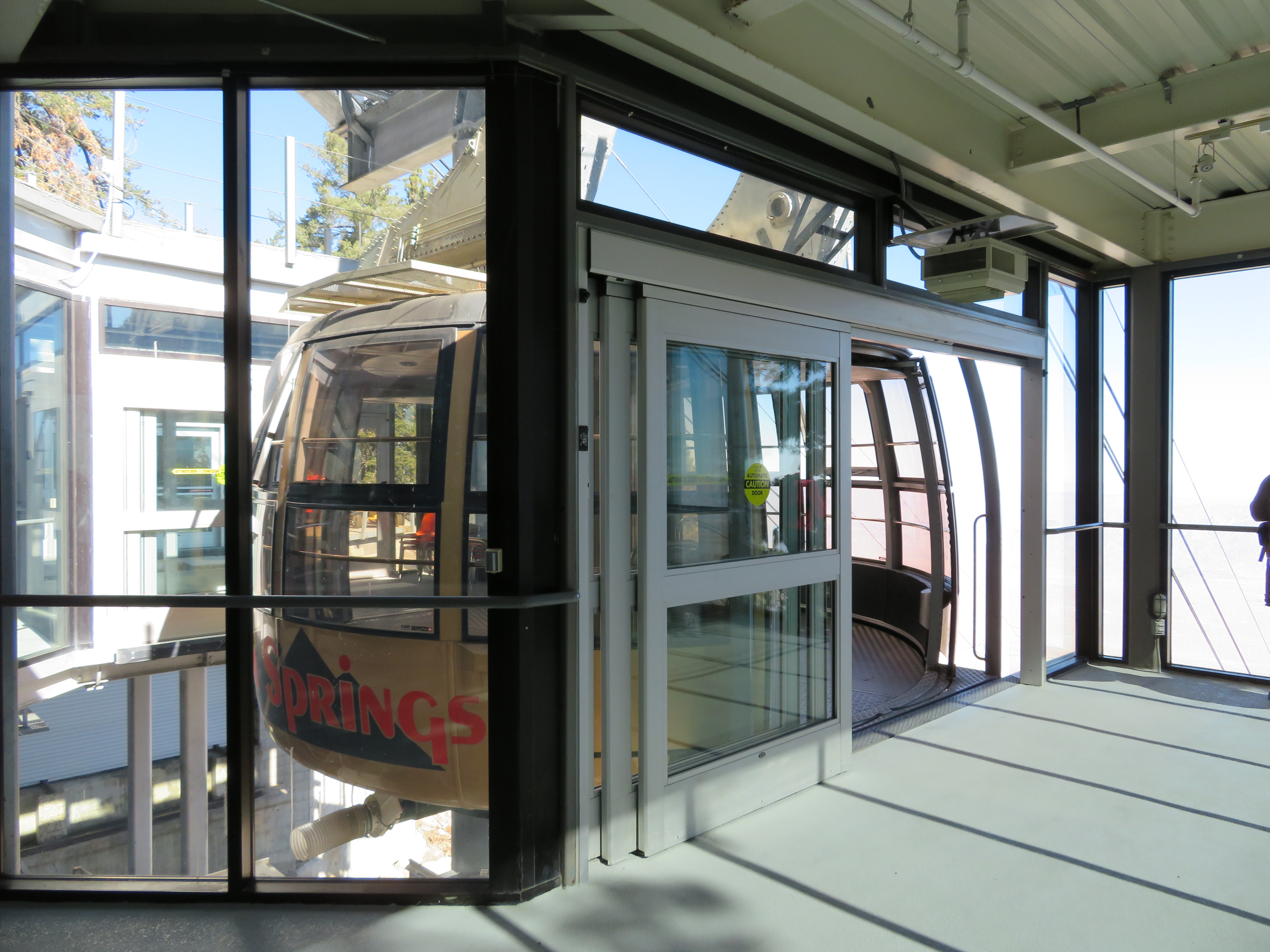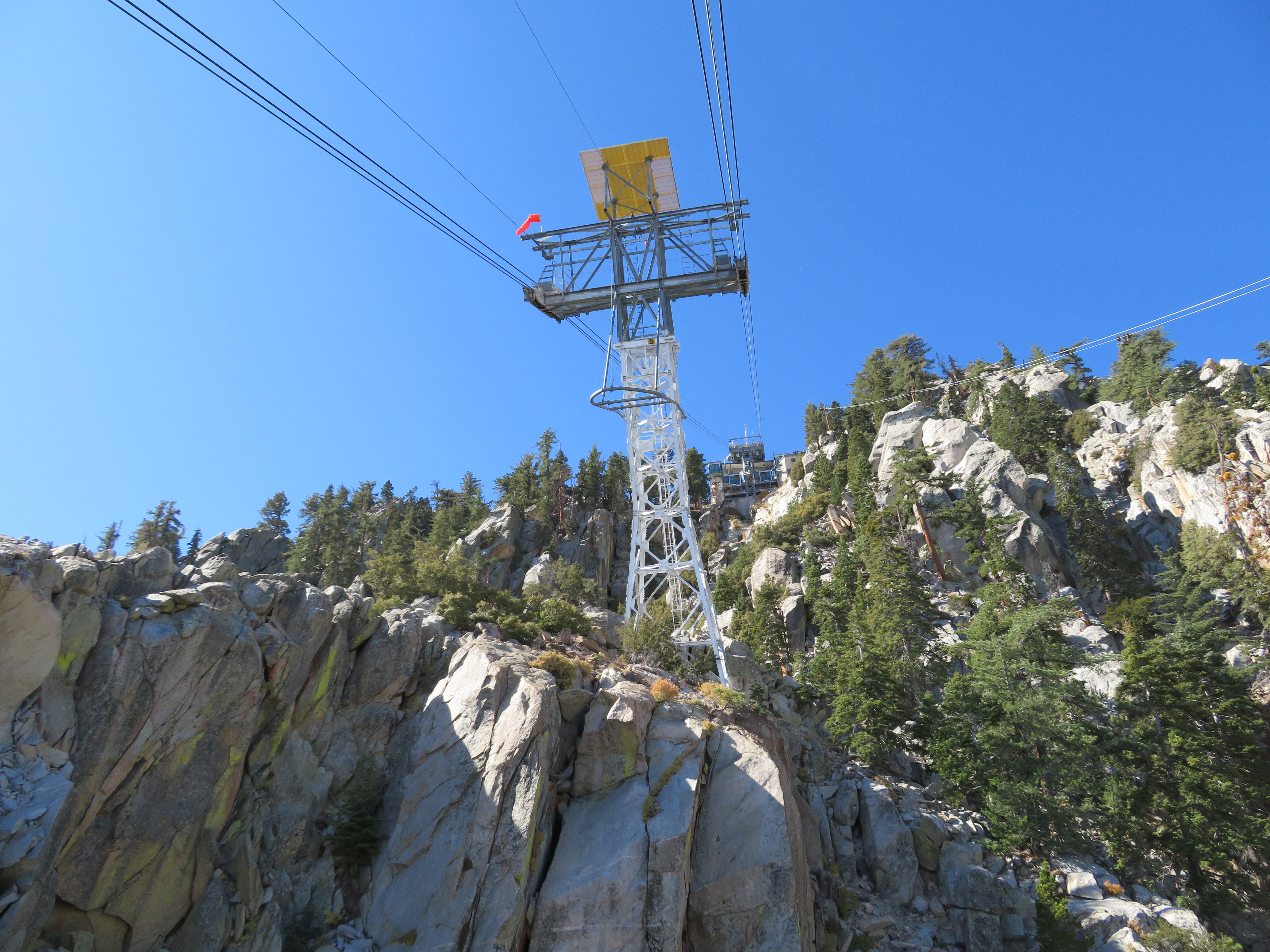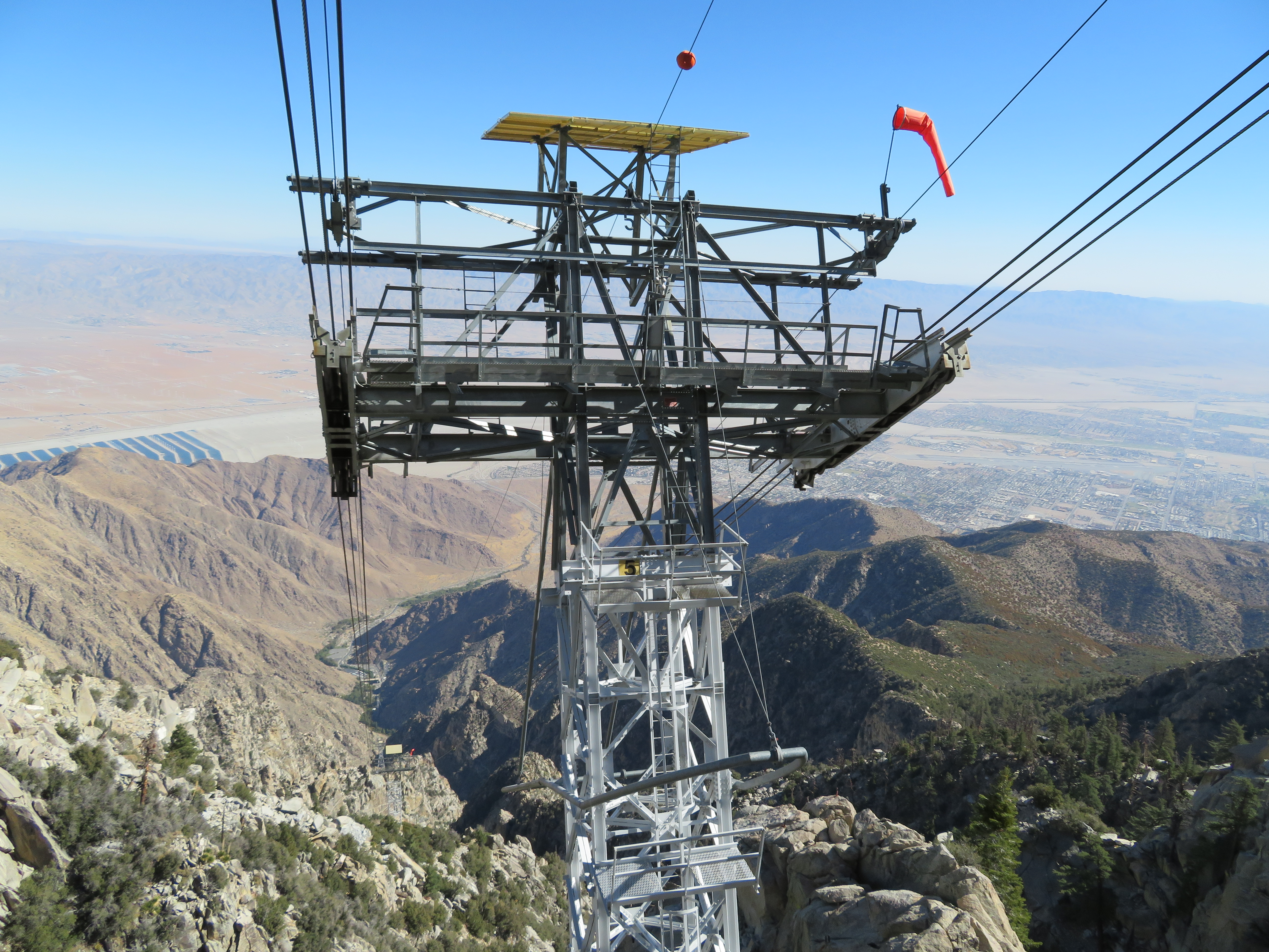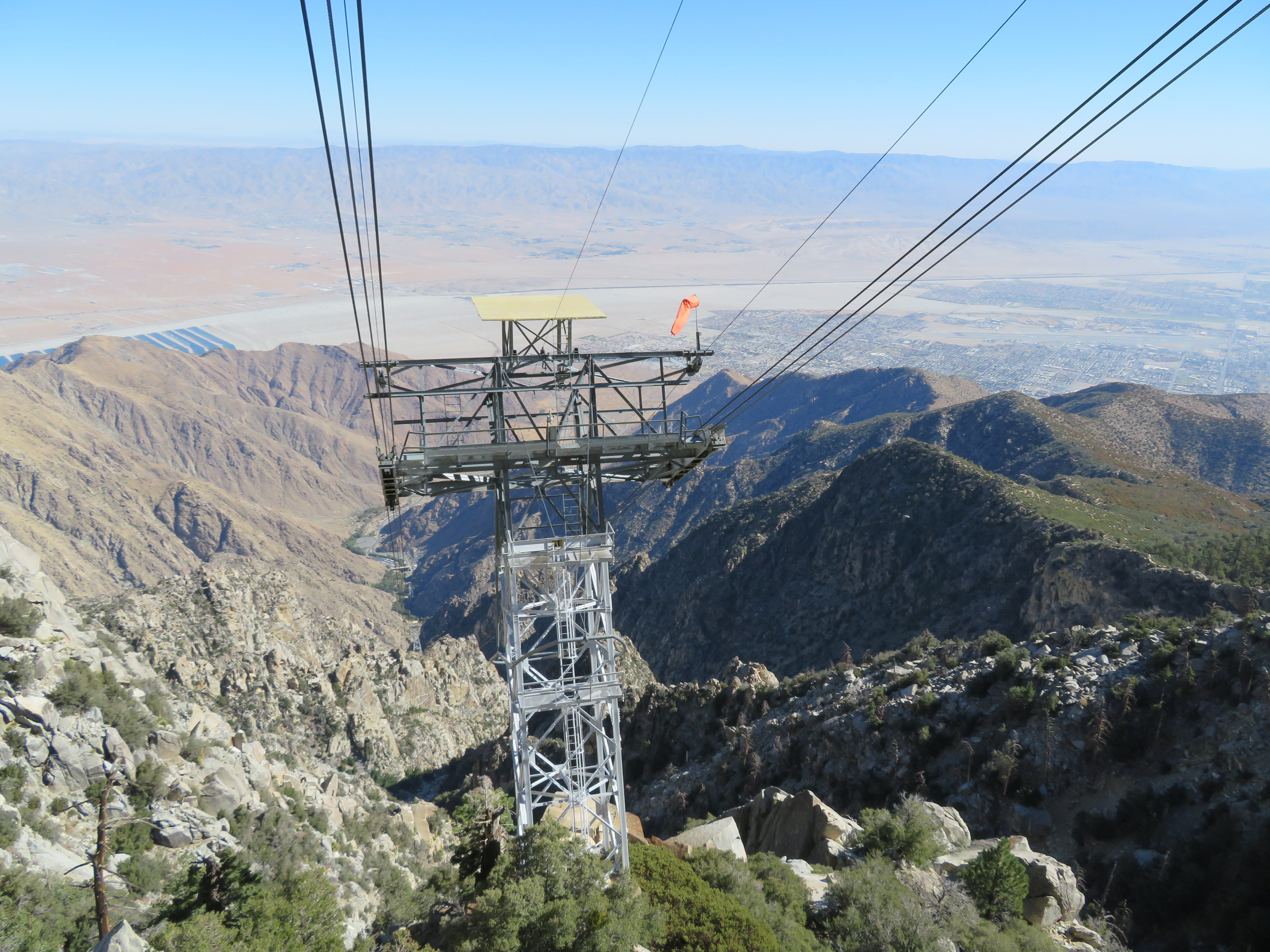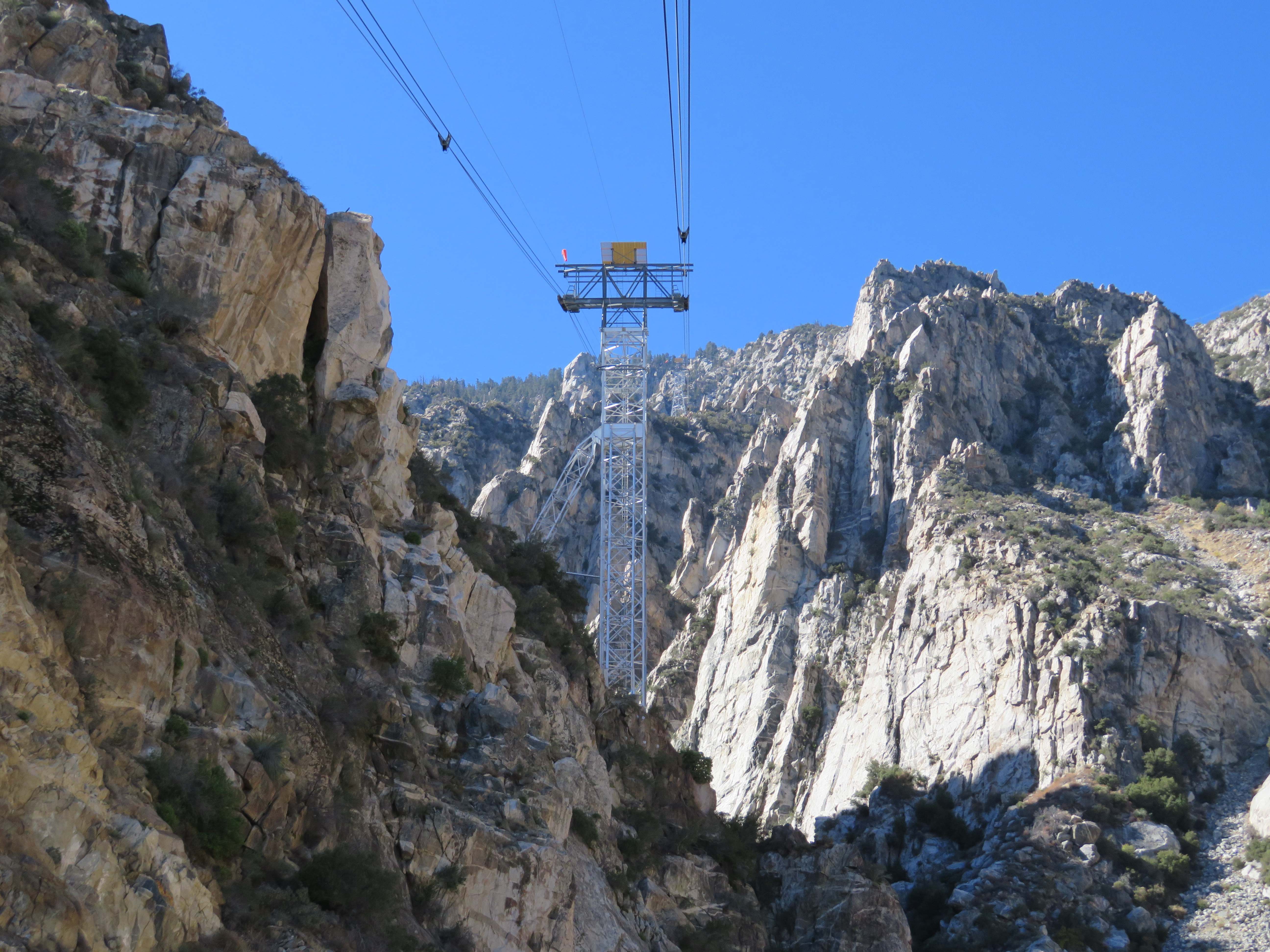 I escaped Jackson Hole’s early snow this weekend and headed southwest, destination tramway number fourteen on my hit list. One I should have gotten to long ago, the Palm Springs Aerial Tramway is the king of North American jig-backs with a ridiculous vertical rise of 5,873 feet. That’s second highest in the world, though the German number one was retired in April with a replacement not scheduled to open until December, giving SoCal’s tram the loftiest lift worldwide title for the moment. At 2.5 miles, it’s just 317 feet longer than Jackson’s Big Red but with almost 1,800 more vertical in Chino Canyon. A modest sign points to the tram from a traffic light 670 feet above sea level on the edge of Palm Springs and the access road (Tram Way) and the tramway combine to lift visitors to 8,516 feet on Mt. San Jacinto. Of all the lifts I have ridden, this one rivals the best, both in terms of the core machine and the impressive operation surrounding it.