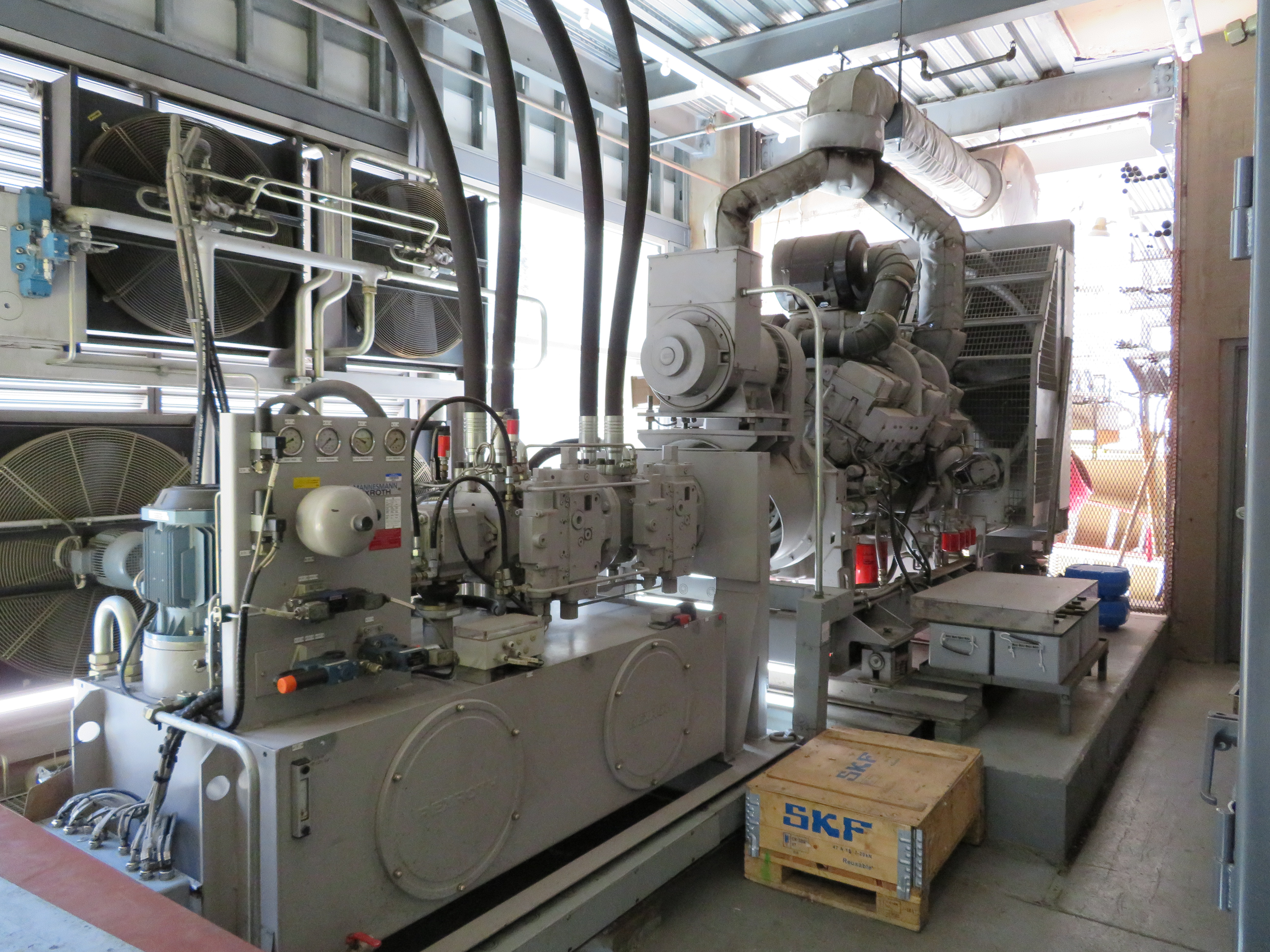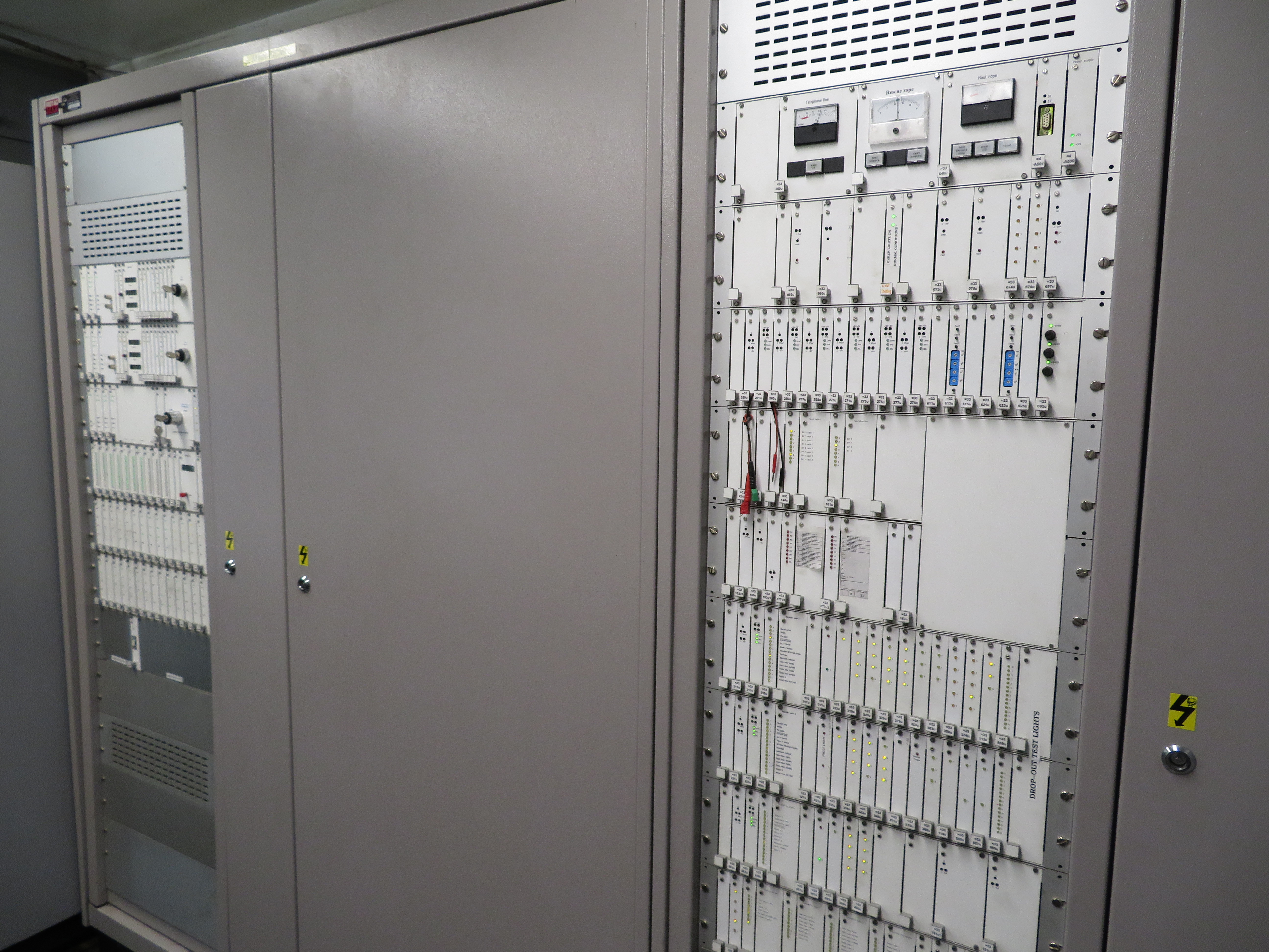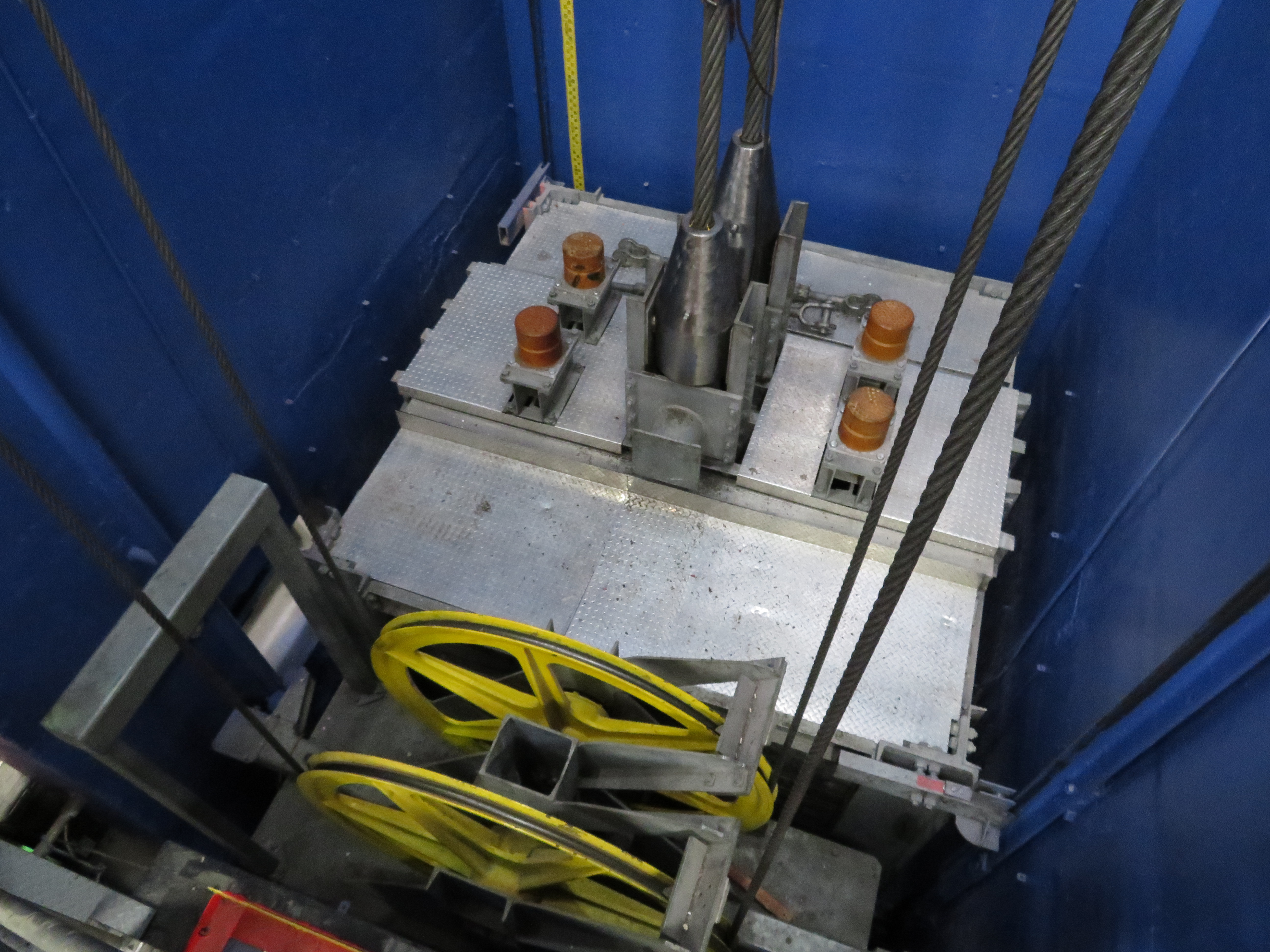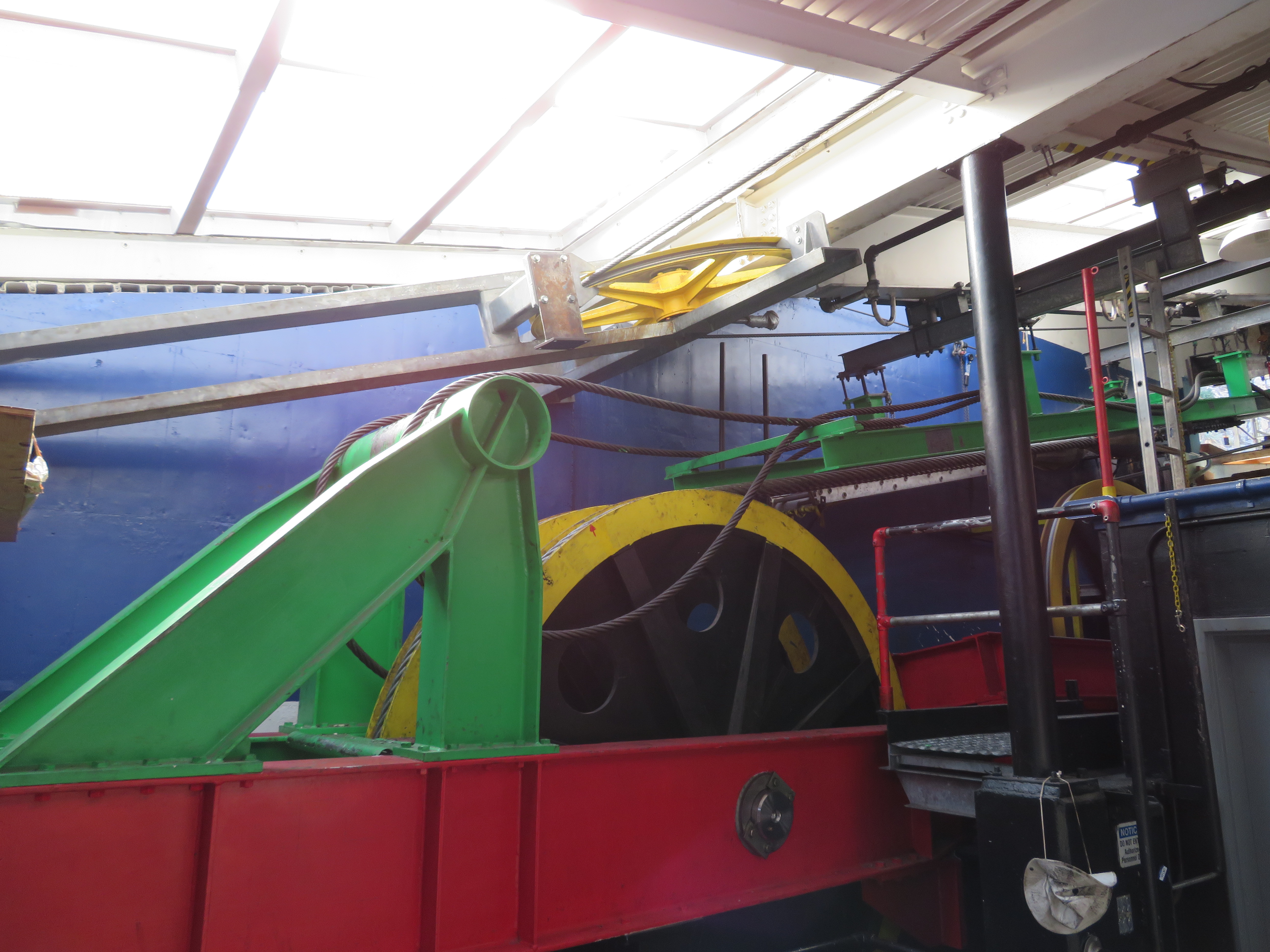 Like most large tramways, the system features two track ropes on each side that are slipped down the saddles about every 12 years. A 40 mm lower haul rope and 45 mm upper rope form a socketed loop together with the two carriages and pass through a 120-ton counterweight up top or around the drive bullwheel below. The track ropes have their own counterweights inside the valley station, which is filled with deflection bullwheels.