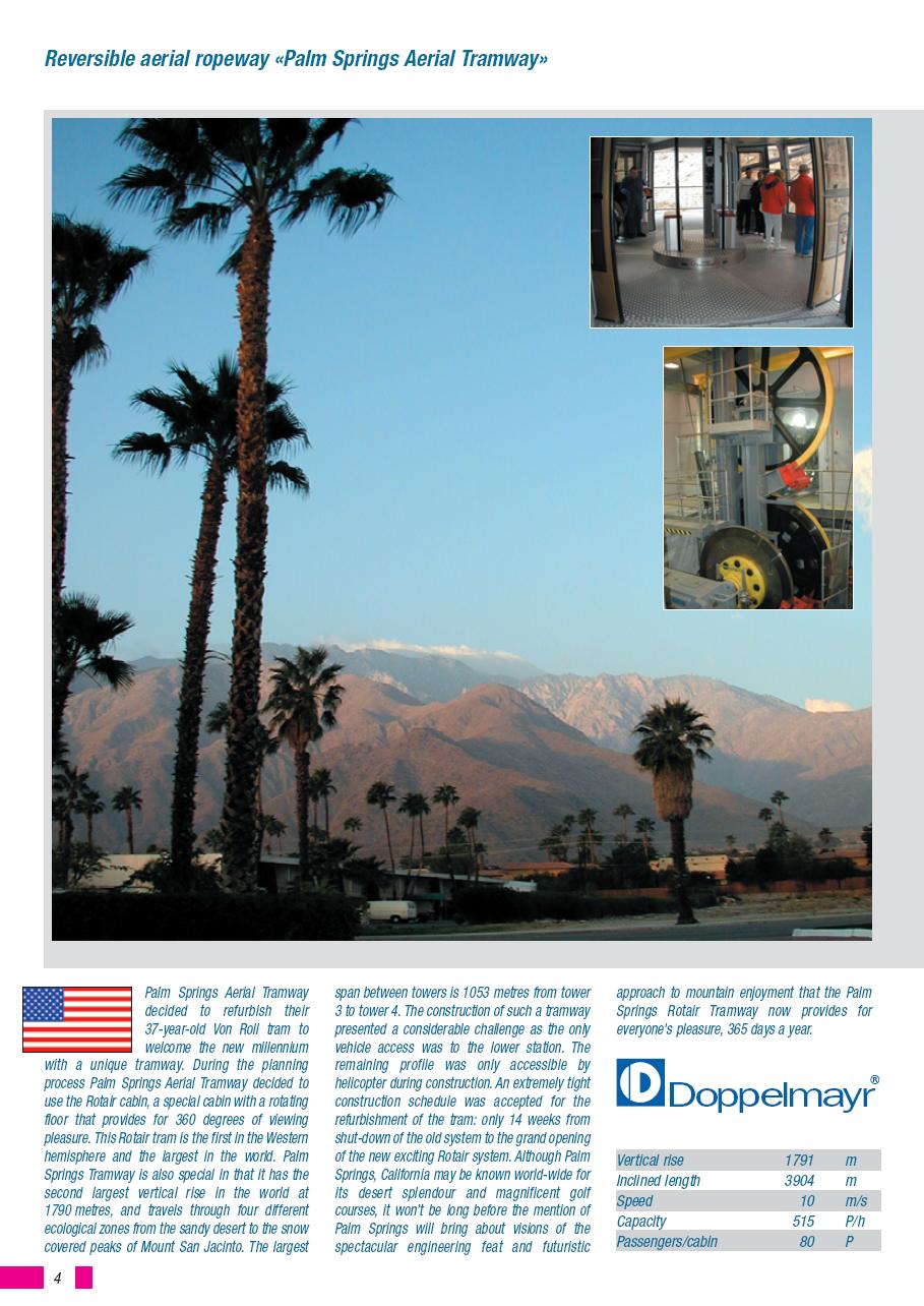 After 37 years helping people beat the heat of the Sonoran Desert in ten minutes, the seven-member board that oversees the tramway operation voted to rebuild the tram for a new millennium. A few years earlier, Doppelmayr had acquired the ropeway division of VonRoll and its American Tramways subsidiary. The combined company was awarded the modernization contract and a new Doppelmayr-branded tram debuted November 6th, 2000. The 18-foot wide, 80-passenger circular cabins mandated major remodeling of both dock structures and raising/widening of tower crossarms. New controls were provided by Frey AG Stans and upgraded cabins manufactured by CWA (both also now subsidiaries of Doppelmayr!) Most moving parts were replaced. The rebuild ultimately cost $11 million with 14 weeks of feverish work. Nine months after the grand reopening, Doppelmayr bought Garaventa, forming the dominant reversible tramway builder we know today.