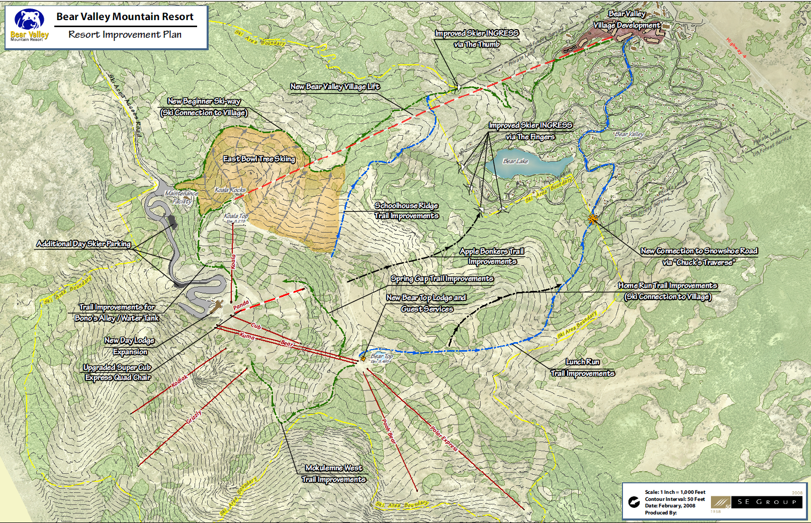 Bear Valley’s next big project may be a lift linking Bear Valley Village to the Koala portion of the mountain. Today, two trails lead from the summit to the village but the only way back up is on a bus. Everyone knows a lift is better and a gondola or high-speed chairlift was proposed by Bear Valley’s previous owner to bridge the gap. The new 1.5 mile, 1,100′ vertical lift could feature a three degree turn on a mix of USFS and private land, creating a much-needed link between mountain and lodging, dining and shopping. This would also be a logical lift to host summer operations as the village lies beside busy California Route 4. The resort’s master plan from 2008 also called for replacement of the Super Cub beginner lift with a detachable quad.