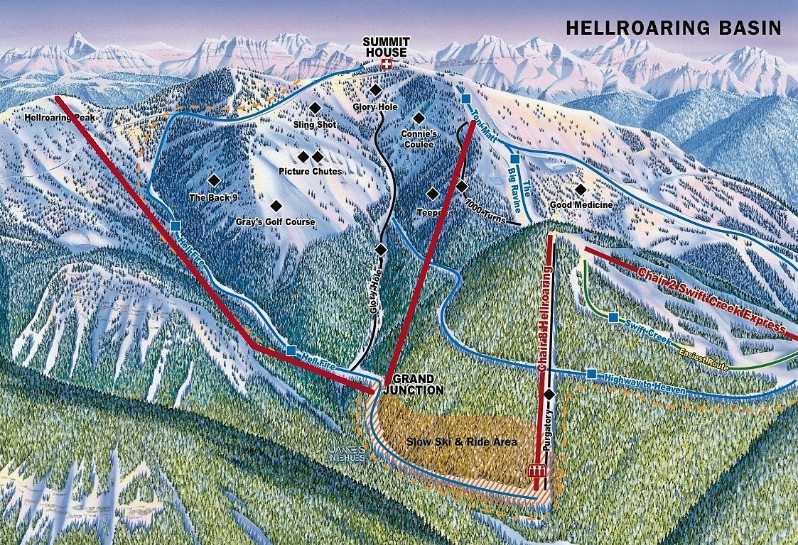 A second new chairlift – Whitefish’s 13th overall – would also load at Grand Junction and ascend 1,340 feet to Hellroaring Peak. While the overall permit area wouldn’t grow, Hellroaring Basin would become much better utilized with a dedicated 4,300′ chairlift servicing eight newly-cut runs. Vertical rise of Chair 12 would be 1,350 feet and additional grooming would allow intermediate skiers to enjoy Hellroaring Peak for the first time. A specific lift type is not specified but Whitefish could opt to use Great Northern, a 1978 Stadeli triple (the mountain has quite the history moving lifts, having done ten relocations throughout its history.)