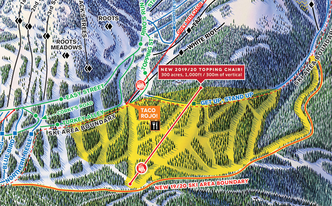 Western Canada’s oldest ski resort will continue to expand next summer with the addition of a new triple chairlift. Red Mountain, situated along British Columbia’s famed Powder Highway, says the long sought Topping lift and terrain will debut for the 2019/20 season and bring the resort to 3,840 acres. “This new triple chair is exciting on its own,” said Red CEO Howard Katkov in a statement. “But what’s truly exciting is how the Topping Chair continues our dedication to improving the adventure for our guests. This new chair streamlines skier traffic around the resort beautifully.” Guests will now be able to access Grey Mountain (opened in 2013) from the Silverlode lift (opened 2007) without needing to ride the extremely long Motherlode chair. The 300 acre boundary expansion will also include six new intermediate trails approaching 1,000 vertical feet apiece.