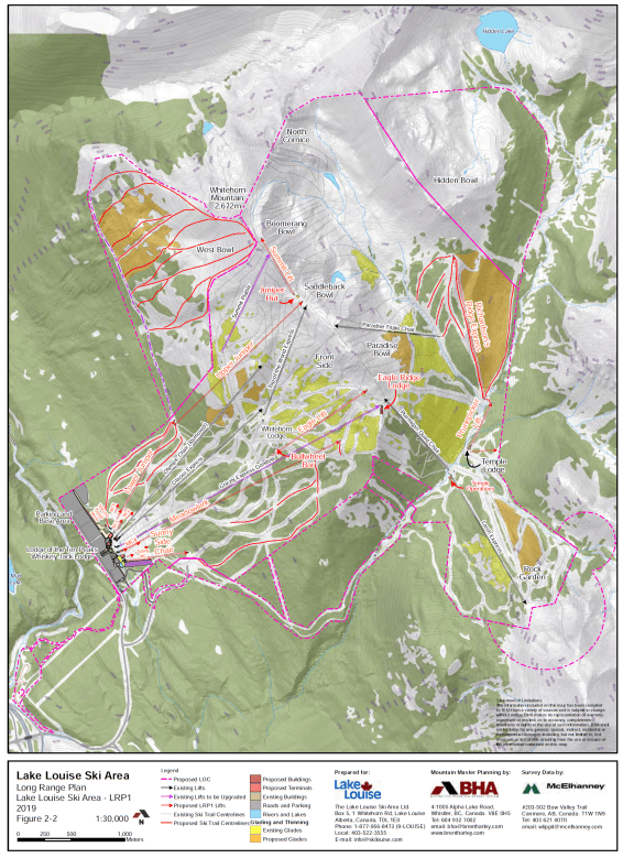 Like at other large mountains with only one portal, out-of-base capacity is a problem. At Lake Louise, it was compounded by the retirement of Olympic without a direct replacement in 2004. The four person, Leitner-built Glacier Express would be rebuilt as a six place lift. A new Juniper high speed quad is proposed load near Olympic and service three new beginner trails. Another new lift called Meadowlark would board near the Grizzly Express Gondola with detachable quad chairs. These improvements would bring out-of-base capacity to 9,000 skiers per hour, almost double the current level.