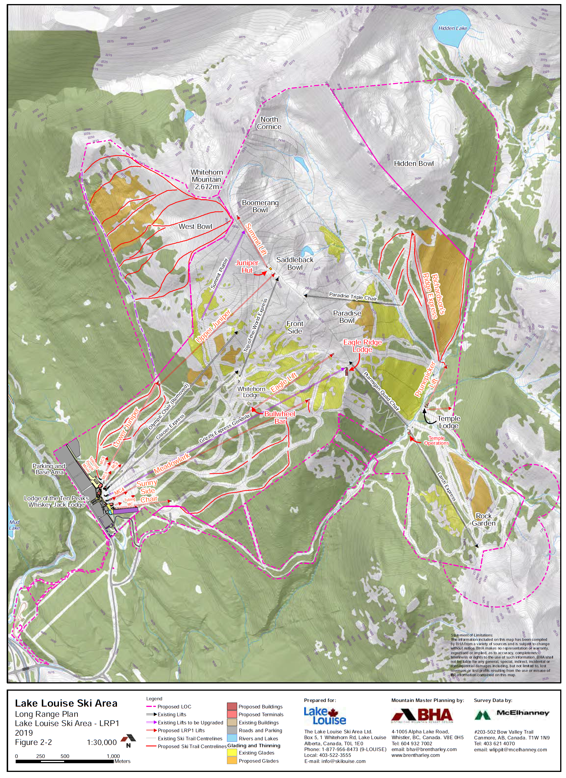 Like at other large mountains with only one portal, out-of-base capacity is a problem. At Lake Louise, it was compounded by the retirement of Olympic without a direct replacement in 2004. The four person, Leitner-built Glacier Express would be rebuilt as a six place lift. A new Juniper high speed quad is proposed load near Olympic and service three new beginner trails. Another new lift called Meadowlark would board near the Grizzly Express Gondola with detachable quad chairs. These improvements would bring out-of-base capacity to 9,000 skiers per hour, almost double the current level.
