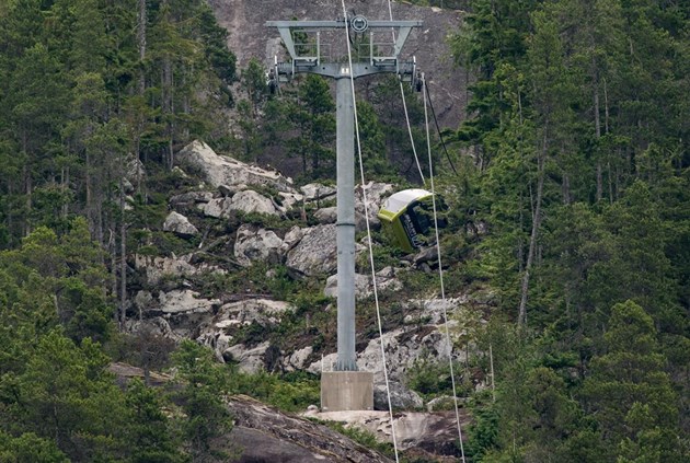 No one was on the 7,000 foot long gondola at the time. The Doppelmayr eight passenger installation opened in May 2014 to carry sightseers and hikers above Howe Sound near Squamish, British Columbia. Not everyone was happy about the project when first proposed due to its proximity to the Stawamus Chief Provincial Park. The gondola proved popular, however, and just this spring more cabins were added to bring the total number to 31.