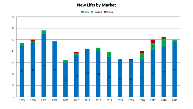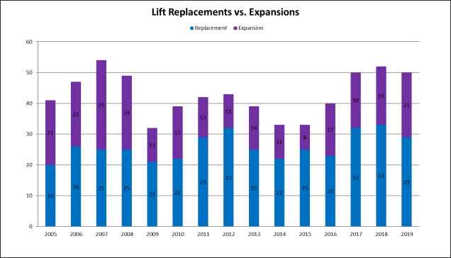 Over 40 percent of this year’s lifts were in new alignments rather than direct replacements for aging machines. That indicates a confidence in the overall economy and demand for travel following a great winter in 2018-19. On top of the expansions and additions, 29 lifts were replaced at an average age of 40 years.