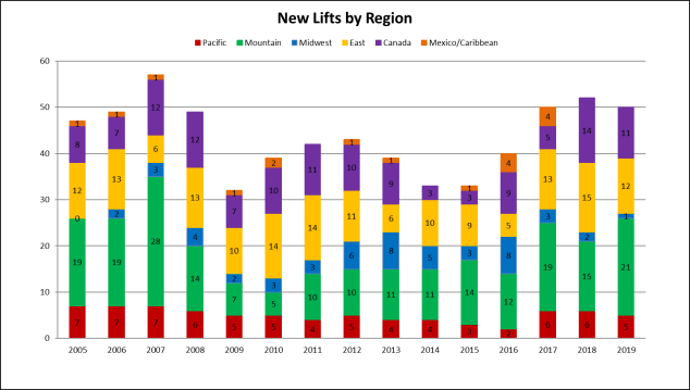 Midwest ski areas sat completely out for new lifts, focusing on other projects in 2019. The Pacific region wasn’t far behind with three new lifts in Washington and only one apiece for California and Oregon. By contrast, Canadian resorts invested heavily coast to coast, with four additions in British Columbia, four more in Quebec and three in Ontario. In keeping with this year’s theme, all but two of Canada’s projects were fixed grip designs.