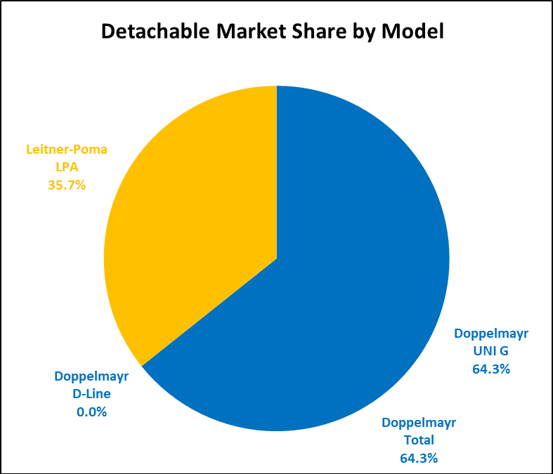 After two huge years, gondola construction fell to two new installations in Colorado, one in New Hampshire and pulse versions in New York and Florida. Detachable chairlift construction was just above the decade average of ten per year. Only one of this year’s high speed chairlifts included bubbles and another heated seats.