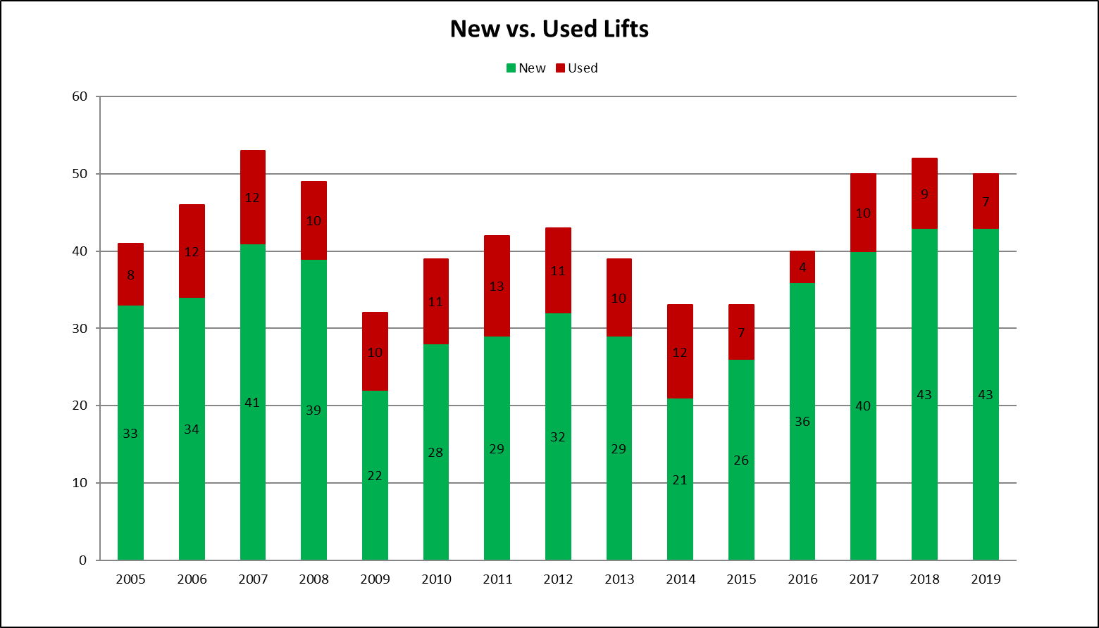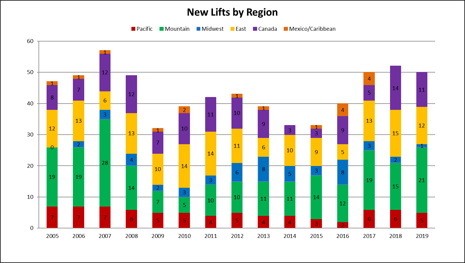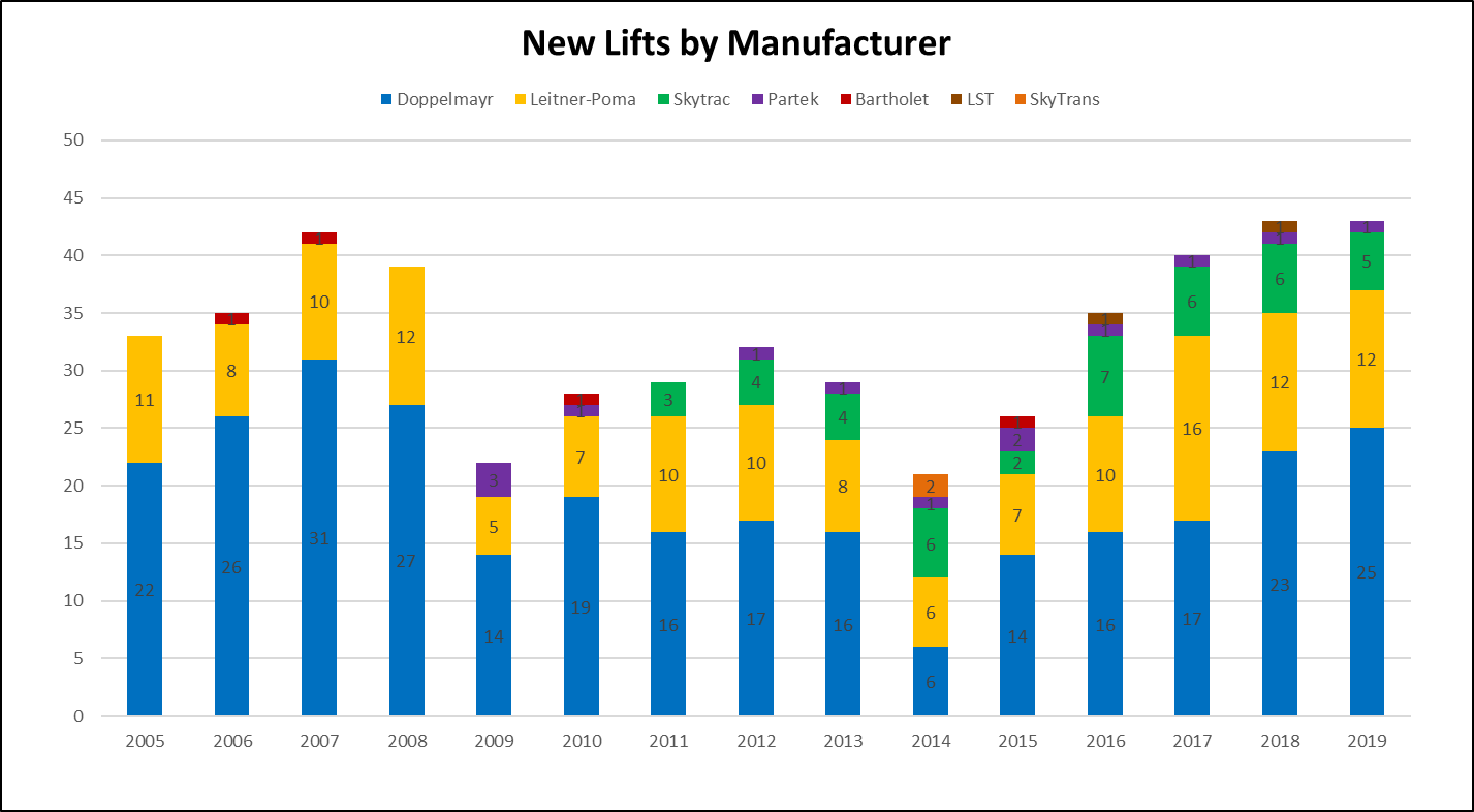 This year saw installation of 43 new and 7 used lifts across North America, numbers similar to the last two seasons. 43 may seem like a modest number for newly-manufactured lifts on an entire continent but that number is a 54 percent increase from the start of the decade and the highest single year total since 2004. Only seven resorts opted to install used lifts, mostly late model fixed grip chairlifts but also a detachable quad and one T-Bar.