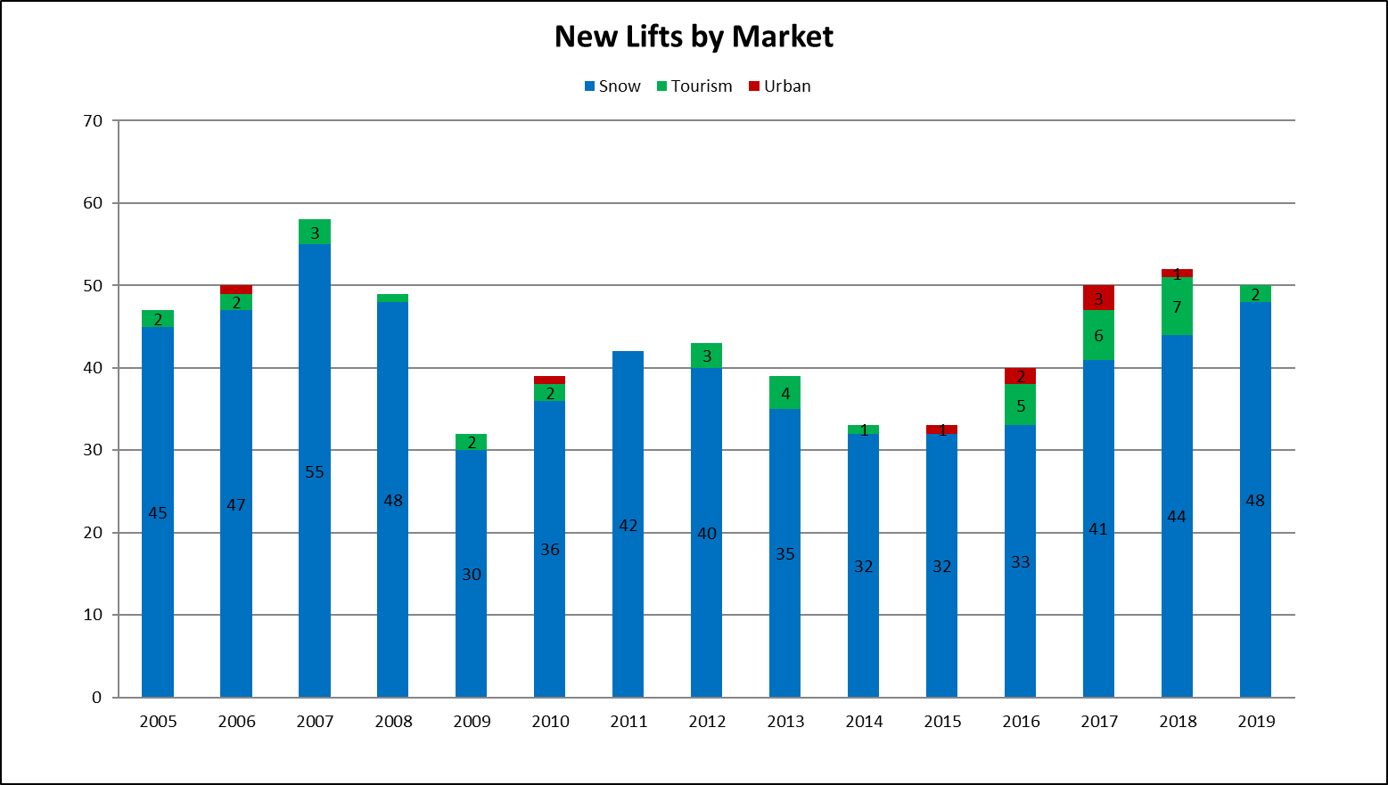 2020 is just two days away and there’s reason for optimism. Vail and Boyne already announced signature projects while Alterra, Powdr and others are likely to follow in the coming months. Some innovative point of interest projects are in the pipeline including a two gondola system at Icy Strait Point, Alaska and another at Argo Mill, Colorado. Race programs at Sugarbush and Aspen Highlands plan to build new surface lifts for training. Overall, announced projects are pacing slightly above last year at this time.
