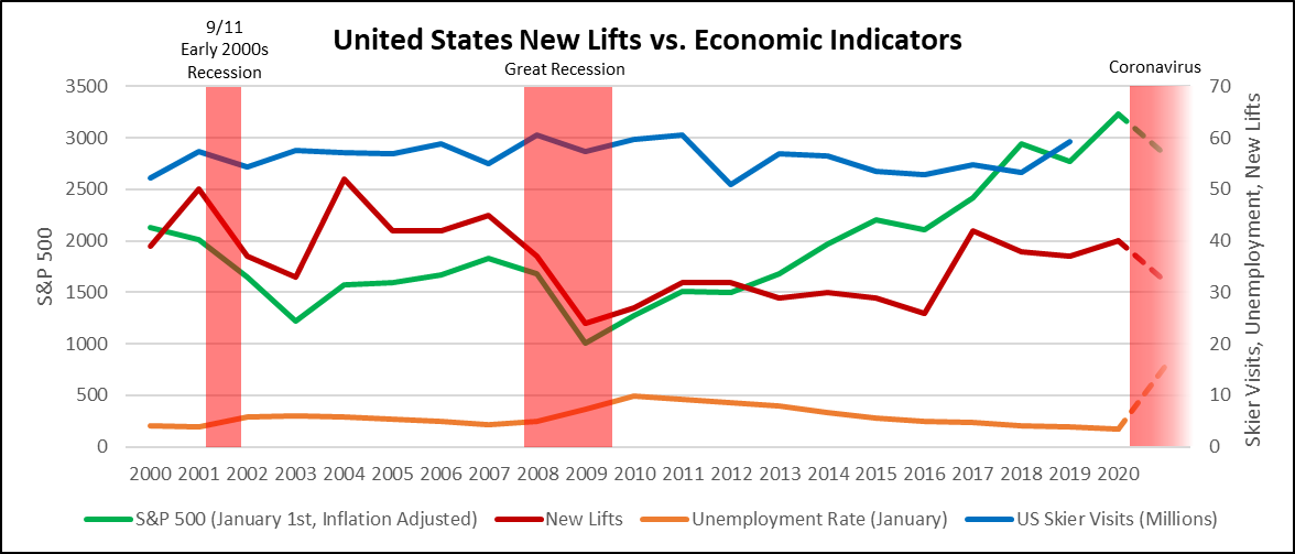 As shown above, US lift construction fell between 25 and 35 percent in both of the last two recessions.  Following the September 11th attacks and associated downturn, skier visits and lift construction bounced back to 2000 levels within just two years.  The Great Recession was a different story.  Skier visits still recovered quickly but the stock market took four years to come back.  The unemployment rate took seven years to reach pre-2008 levels.  It was lift construction that took the longest to recover – a whopping nine years to regain the lost 35 percent.
