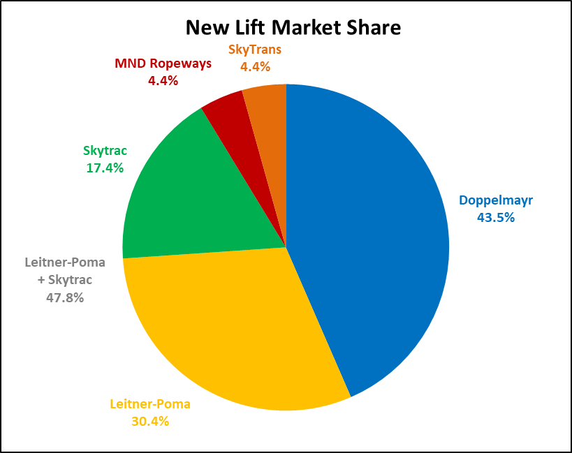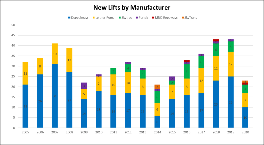 2020 was a huge year in Mexico with seven new gondolas installed but both Doppelmayr and Leitner supplied these lifts from Europe instead of manufacturing them in the United States or Canada. Therefore these projects are excluded from the charts.