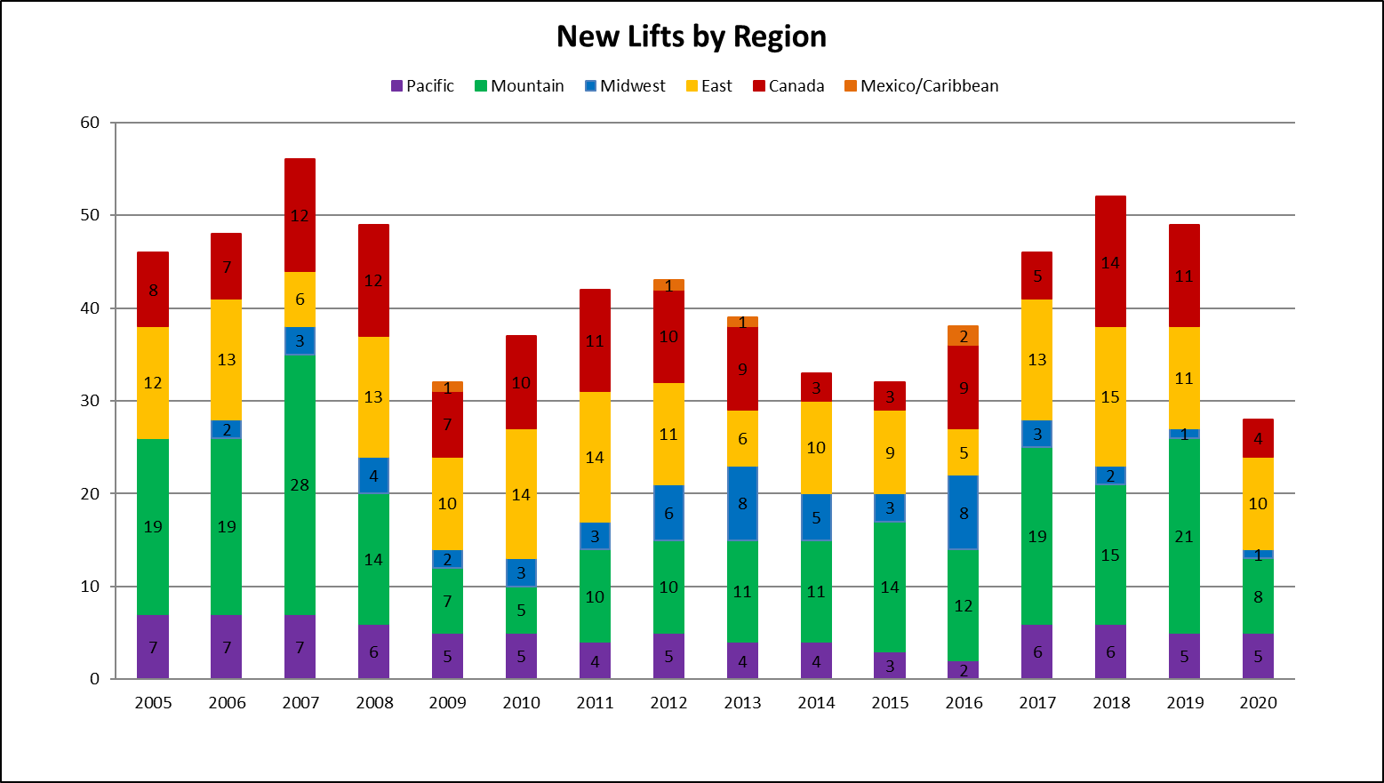 Regionally, the East Coast saw the most new lifts installed with additions in six states. The Rocky Mountains, typically the largest region for lifts, saw installations fall more than 60 percent with eight lifts erected.