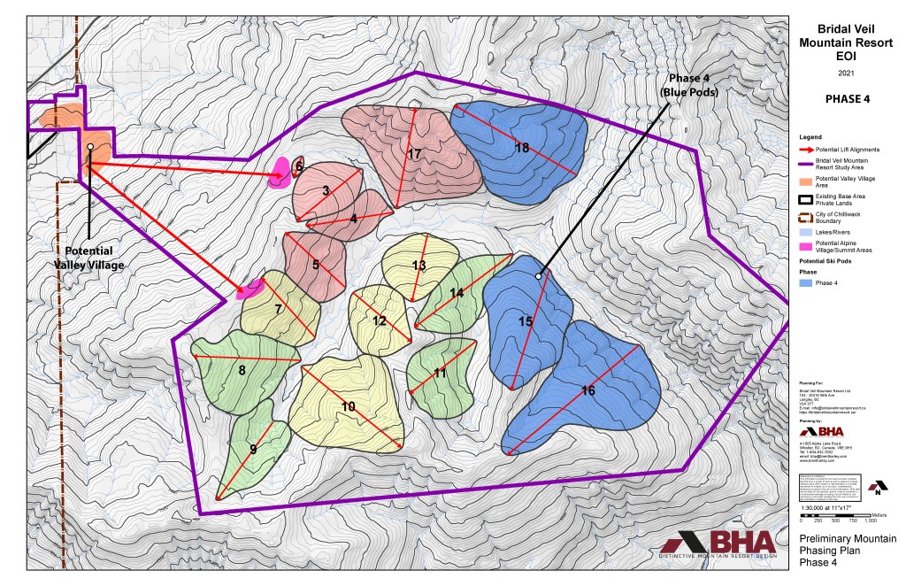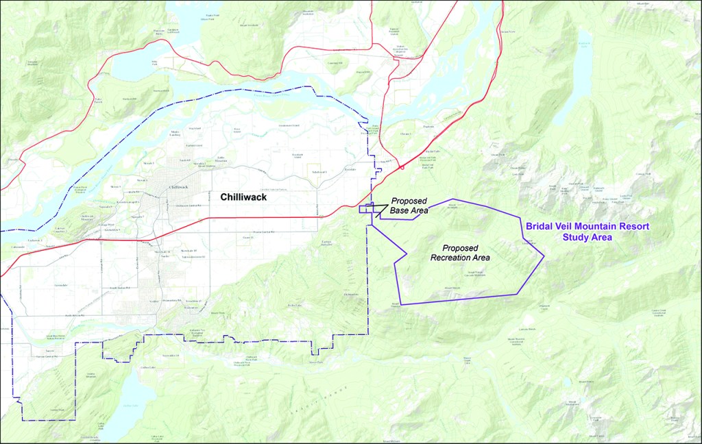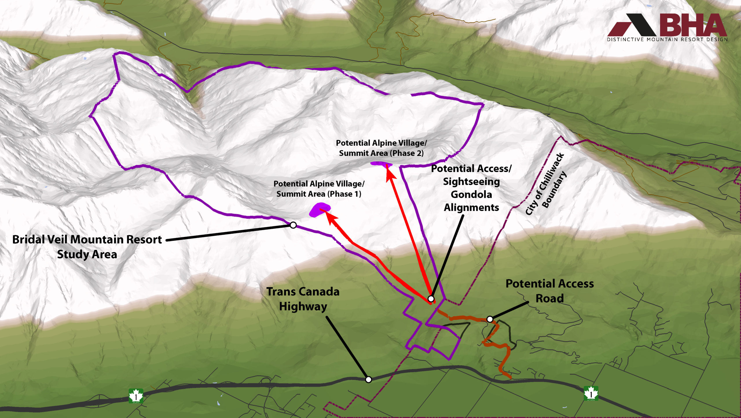 British Columbia’s number of planned ski resorts grew by one today with the unveiling of Bridal Veil Mountain Resort. Unlike the remote Valemount Glacier, Zincton, Saddle Mountain and Jumbo Glacier proposals, this four season resort would serve the fast-growing Fraser Valley and surrounding region. Located along the Trans-Canada Highway, the site sits just 1.5 hours outside Vancouver and 2.5 hours north of Seattle.