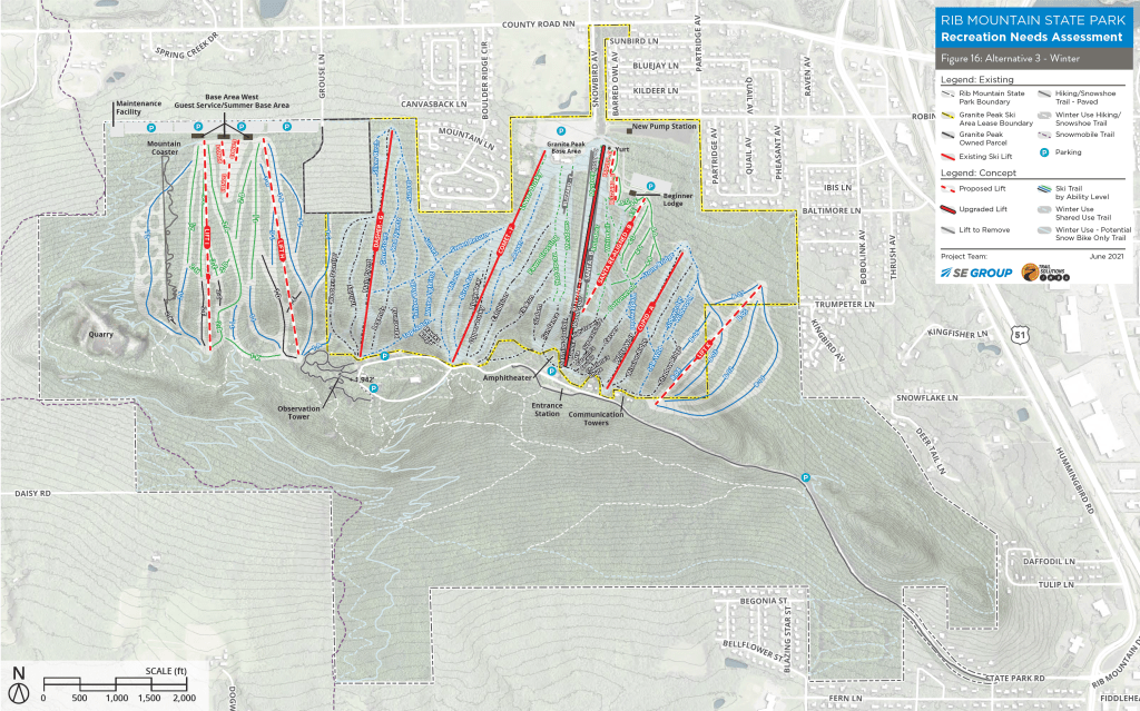 A more ambitious Alternative 3 includes all of the projects from Alternative 2 plus a westward expansion with parking, a day lodge, gondola, chairlift and three surface lifts. Two of the new lifts would serve beginner runs from the summit, a key differentiator from the Granite Peak of today where novices are limited to mid-mountain and below. Summer operations would live here and include a zip line plus mountain coaster. Winter could see a total of 121 new skiable acres and an estimated 136,000 additional annual visits.