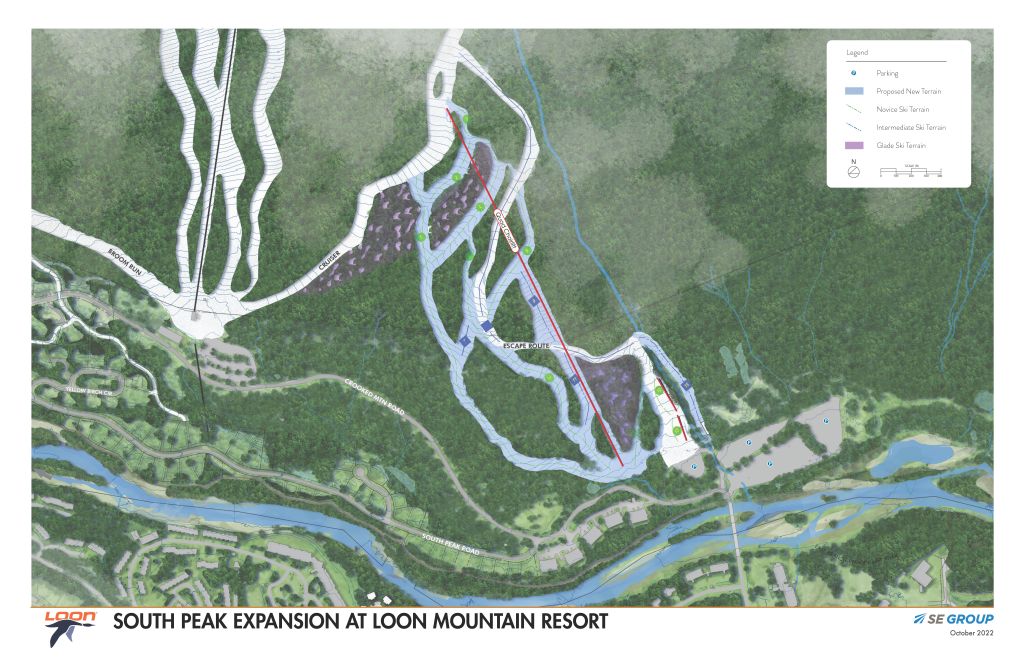 Loon Mountain Resort today unveiled plans for its tenth chairlift, a quad servicing 30 acres of new terrain on South Peak. The expansion will feature a Doppelmayr Alpenstar fixed grip lift with loading conveyor, a guest service facility and fully automated snowmaking. This will increase Loon’s beginner terrain by over 50 percent and bring the resort above 400 acres total. Initial work is already underway and the long-awaited expansion will open for the 2023-24 ski season.